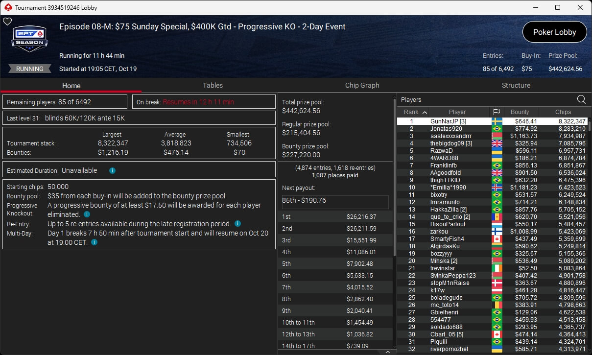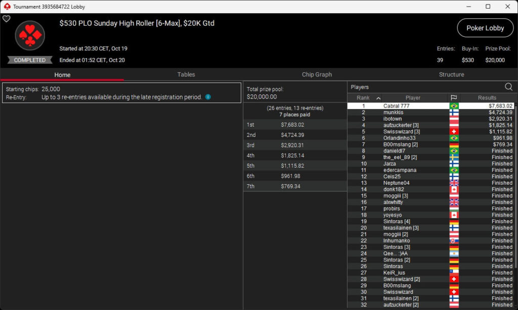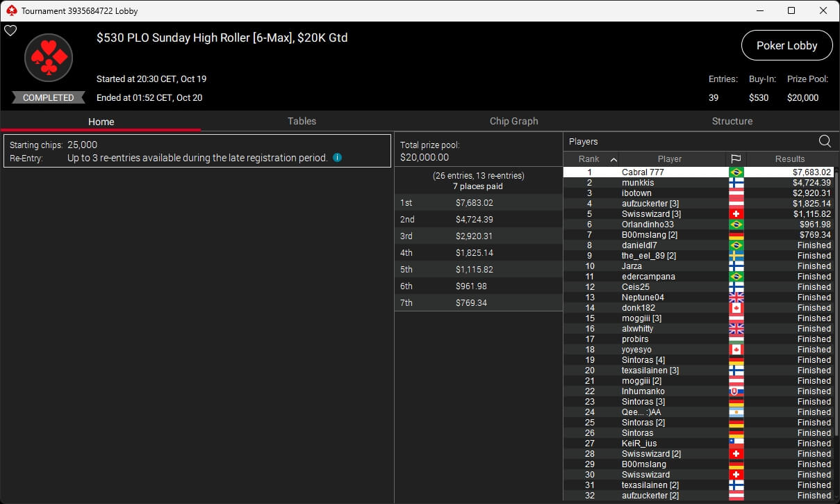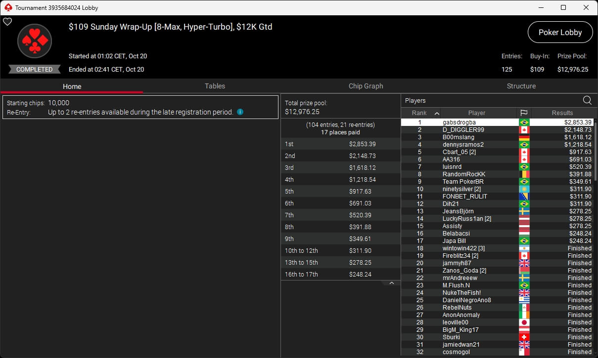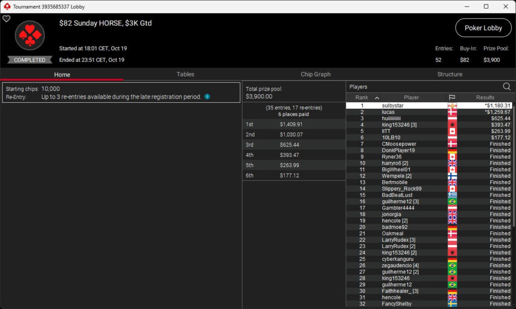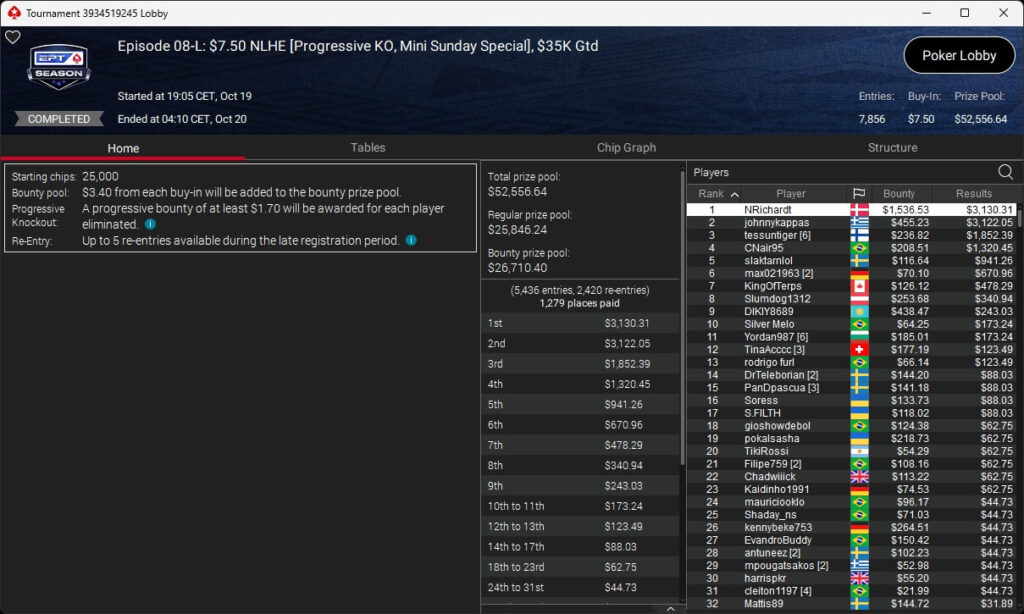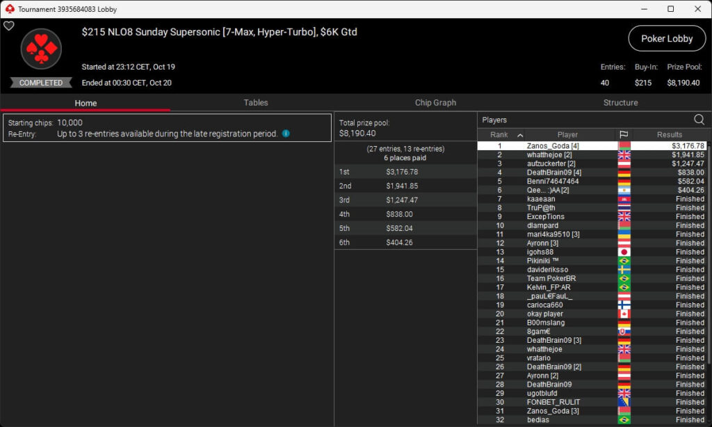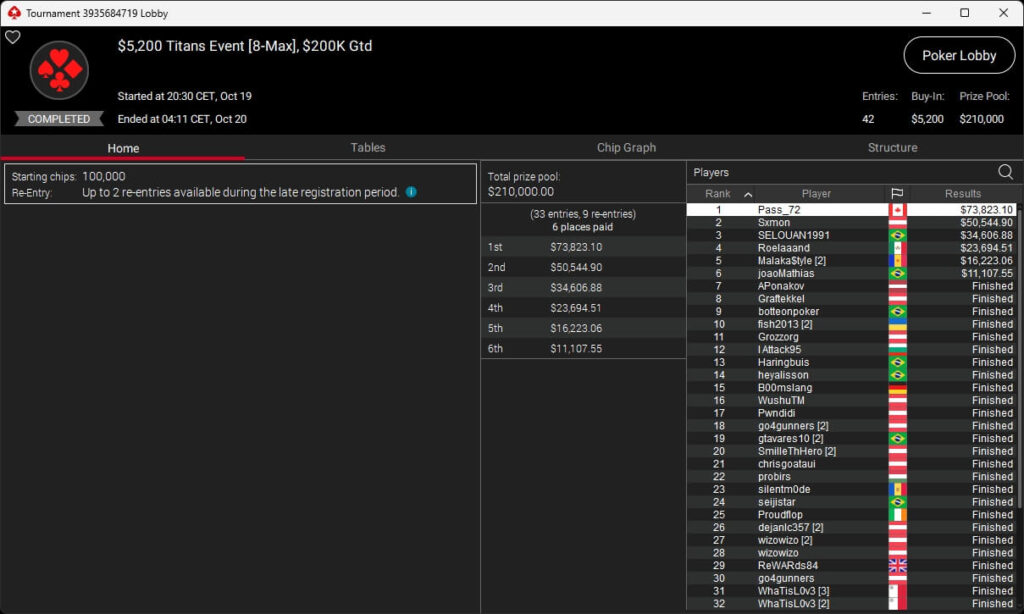 Im $5.200 Titans Event spielten 33 Teilnehmer um $210.000 an Preisgeldern. Pascal „Pass_72“ Lefrançois kassierte den Sieg sowie $73.823,10. Sxmon ($50.544,90) belegte Rang 2 und Rodrigo „SELOUAN1991“ Selouan (3./$34.606,88) stand ebenfalls auf dem Treppchen.