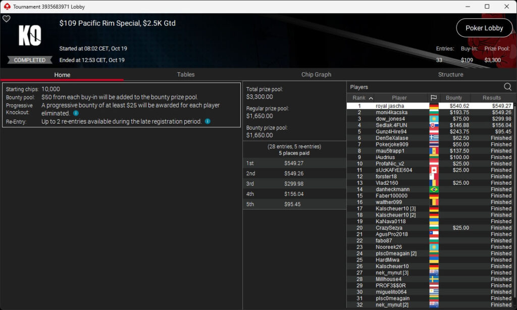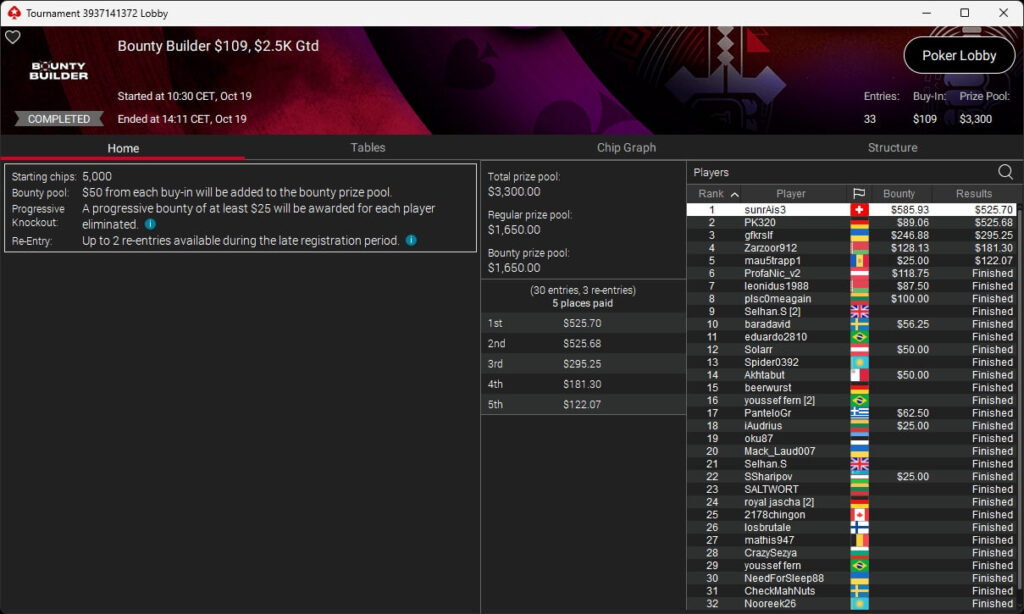 Die deutschsprachige Poker-Community hatte einmal mehr einen erfolgreichen Sonntag auf PokerStars. Paul „pauL€FauL“ Höfer ($9.457,87 + $12.215,80) setzte sich im $530 Bounty Builder HR durch. royal jascha ($549,27 + $540,62; $109 Pacific Rim Special) und sunrAis3 ($525,70 + $585,93; $109 Bounty Builder) sicherten sich ebenfalls Turniersiege.