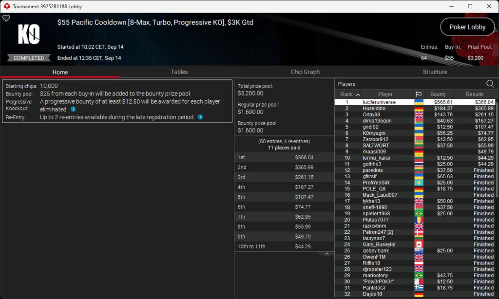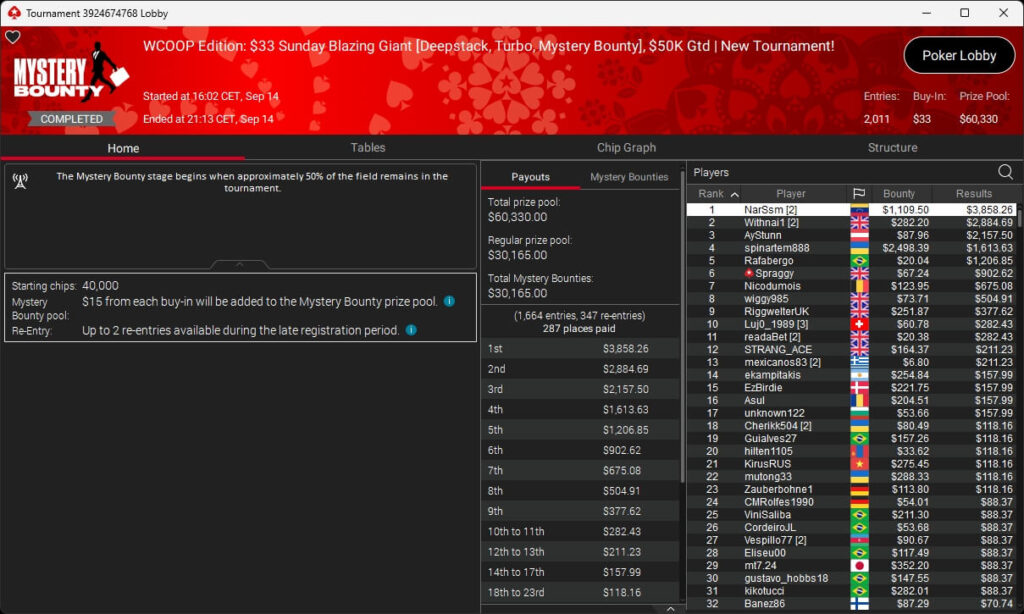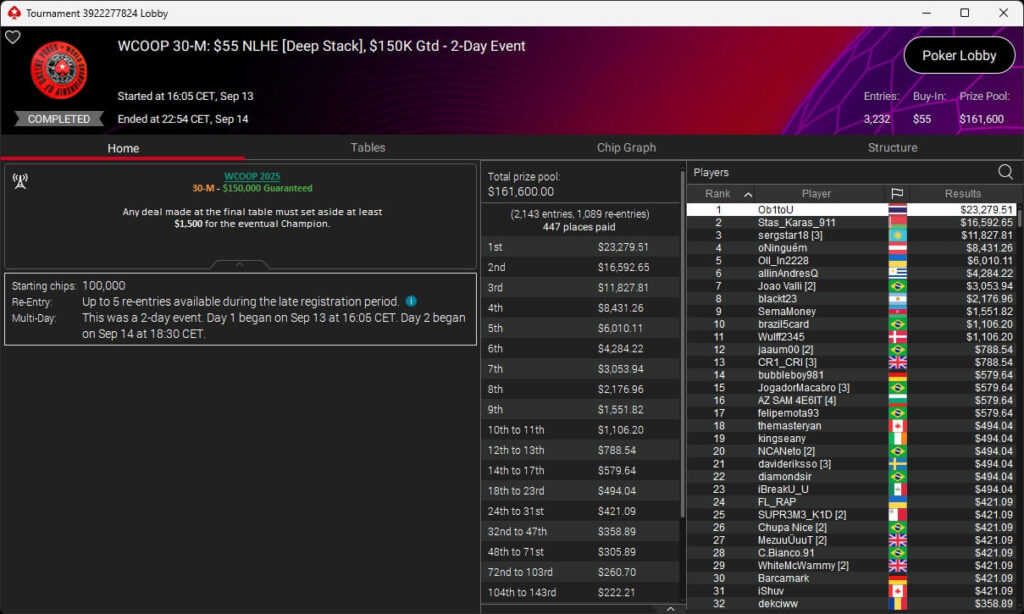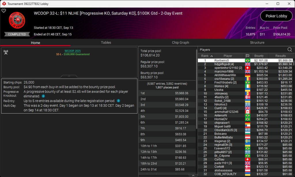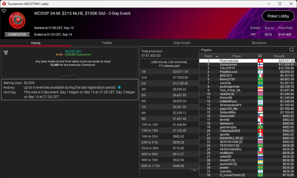 Der zweite Sonntag bei der WCOOP 2025 brachte der deutschsprachigen Poker-Community zwei Siege ein. Pharmatrader setzte sich im $215 NLHE durch und ging mit $25.011,34 vom Tisch. Denkbar knapp war es für consciously (3./$11.182,39 + $4.718,06; $109 Saturday KO) sowie fabsnb95 (3./$9.568,56; $109 Sunday Fenmeno).