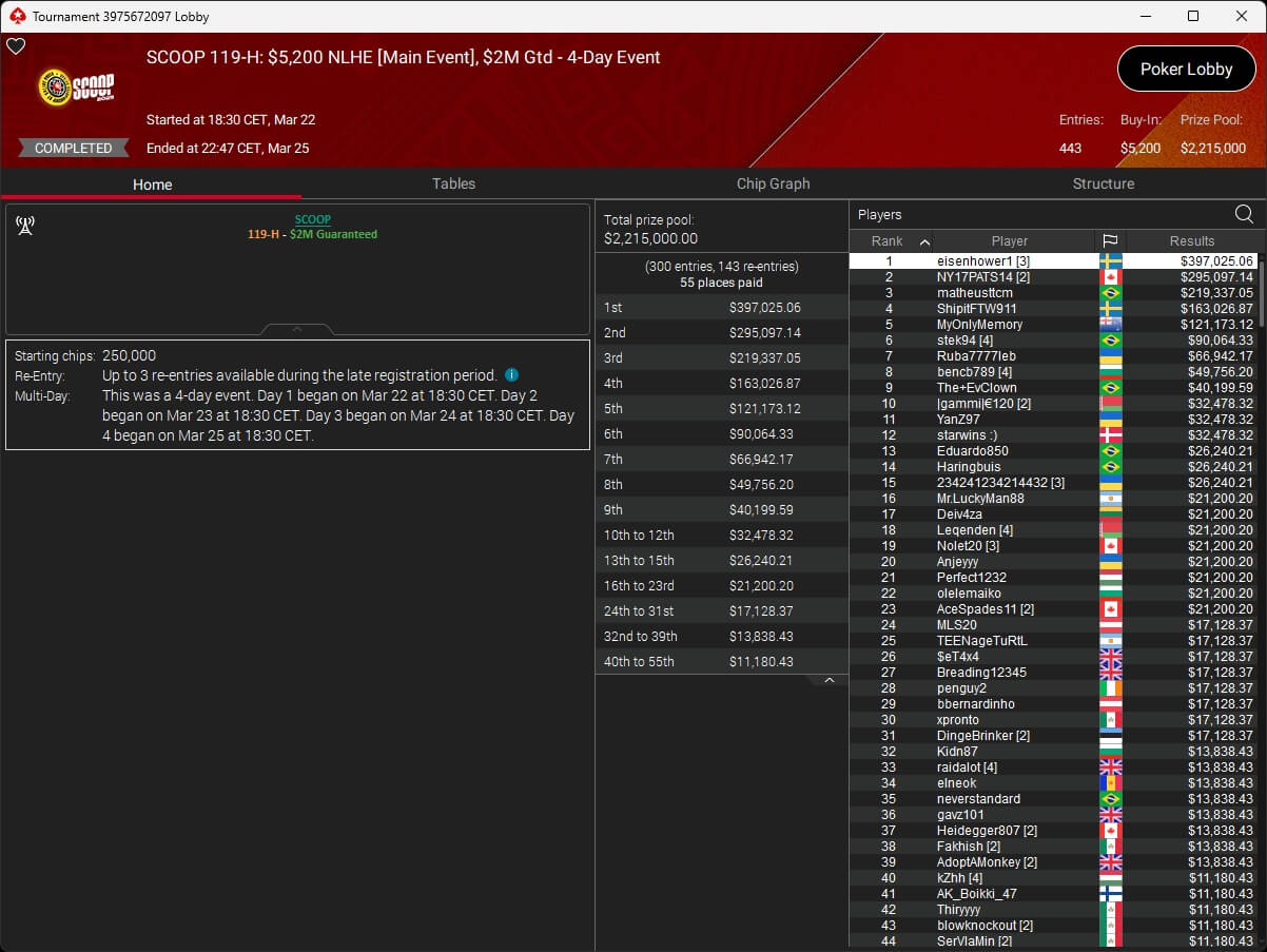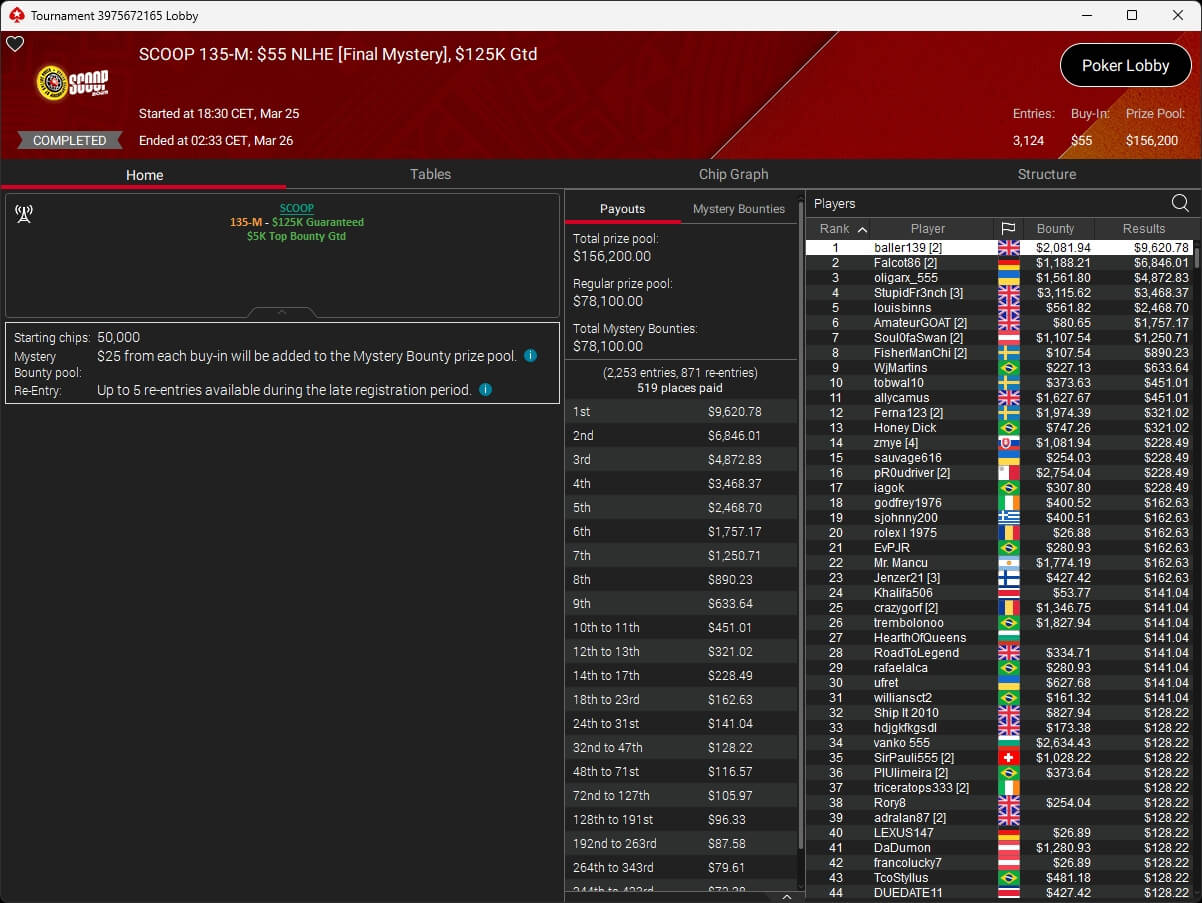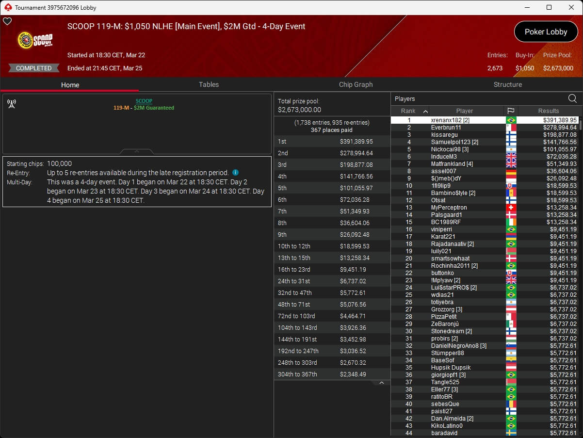 Erfolgreichster DACH-Spieler im $1.050 Main Event war assel007 (8./$36.604,06). Der Sieg sowie $391.389,95 Preisgeld gingen am Ende an Renan „xrenanx182“ Meneguetti. Everbrun11 (2./$278.994,64) und kissaregu (3./$198.877,08) standen ebenfalls auf dem Treppchen.