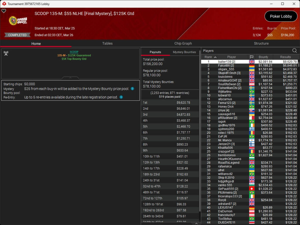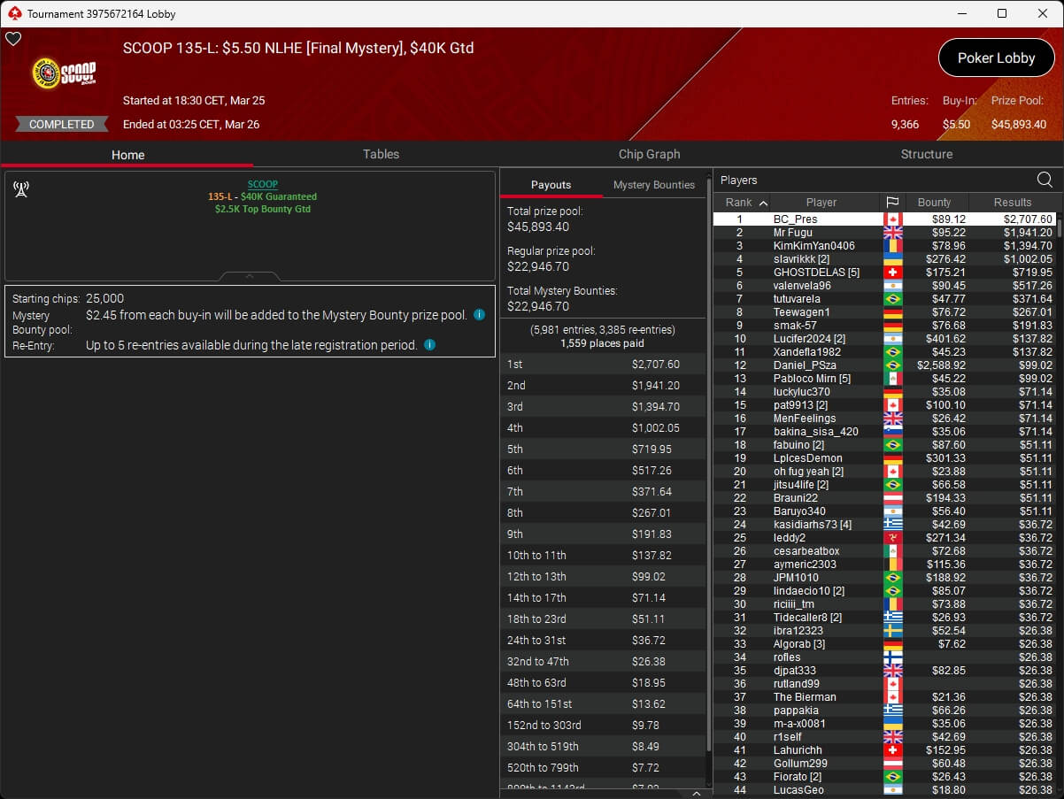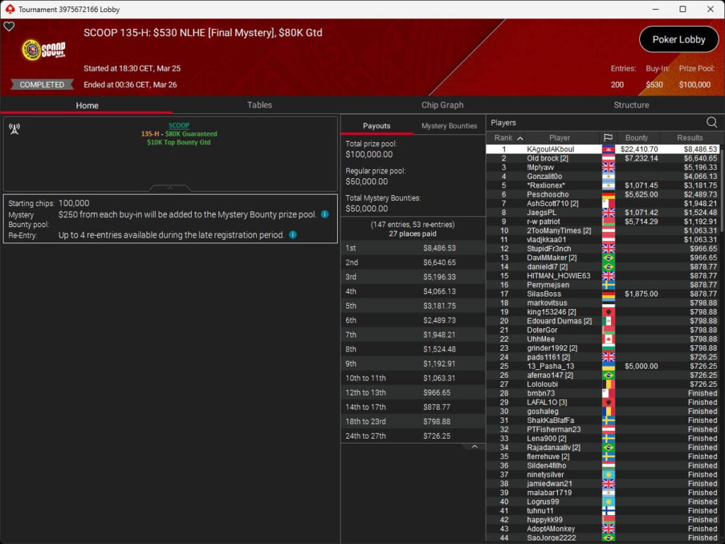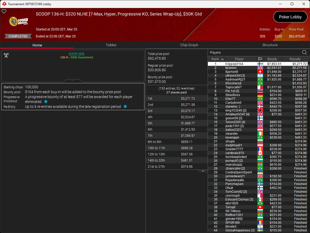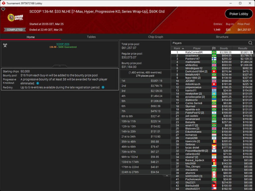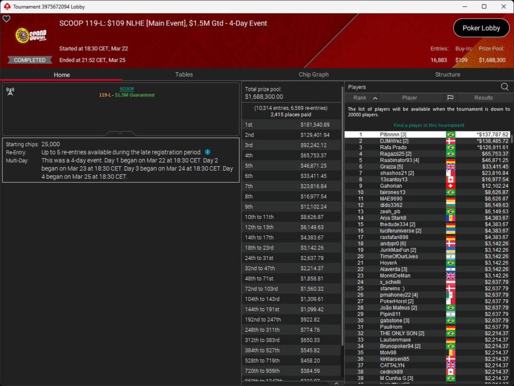 Vergangene Nacht endete die SCOOP 2026 auf PokerStars. Im $109 Main Event wurde um die Löwenanteile von $1,69 Millionen gespielt. Nach 3-Way-Deal setzte sich der Brasilianer Pitinnnn ($137.787,62) gegen DJMiWez (2./$138.485,72) und Rafa Prado (3./$126.911,61) durch. Raabinator92 aus Deutschland belegte Rang 5 für $46.871,25.