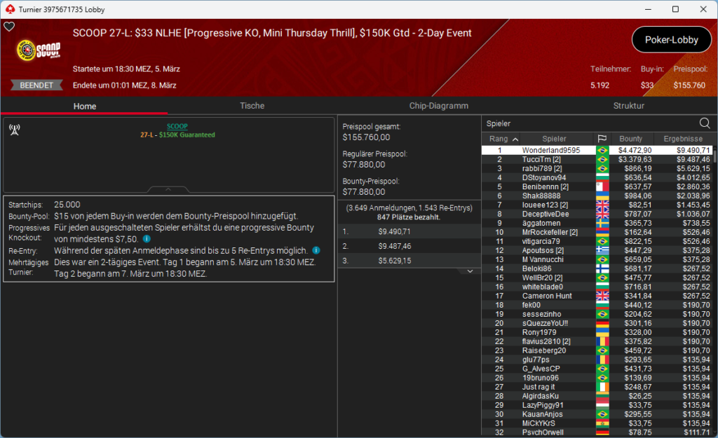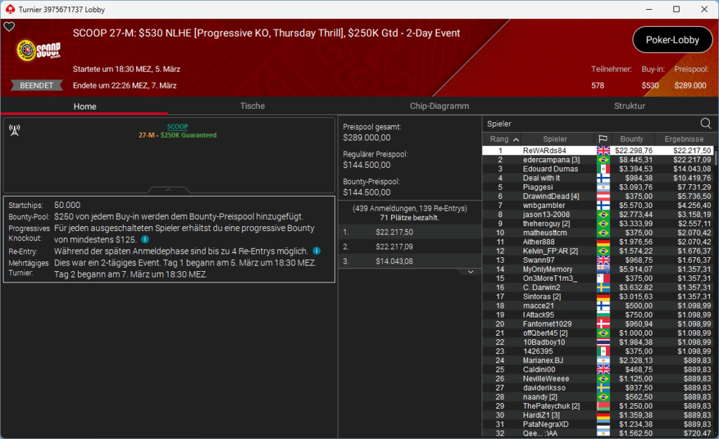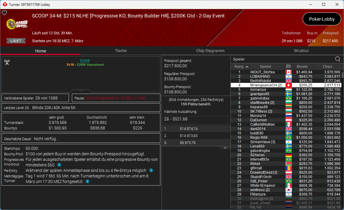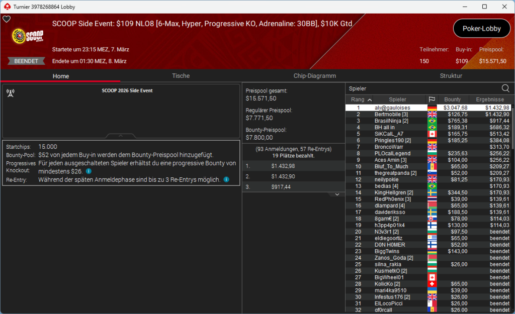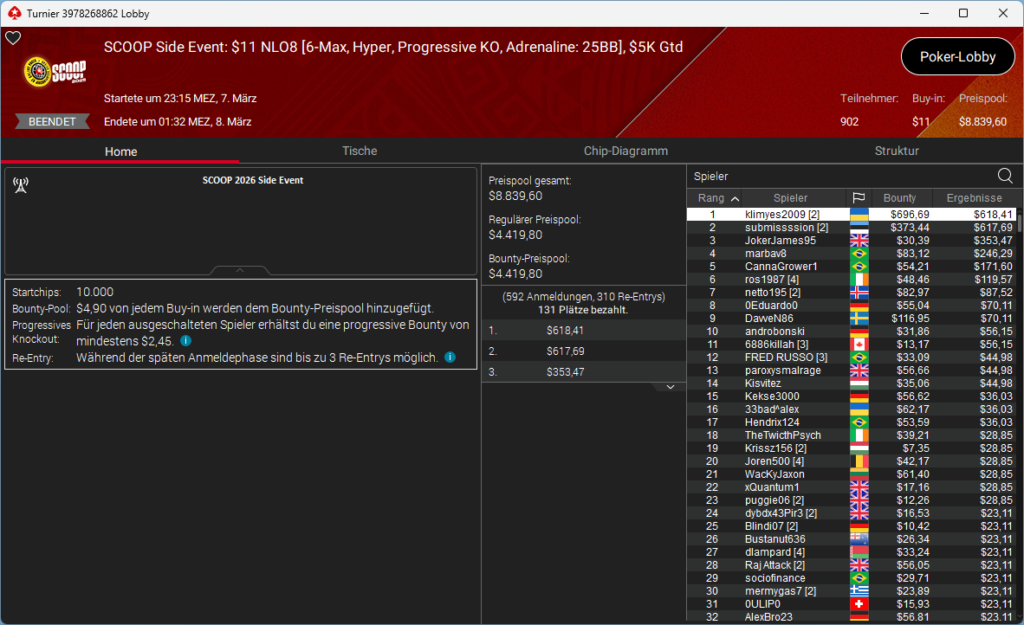 Nur bei den Side Events konnten die DACHs gestern bei der PokerStars Spring Championship of Online Poker (SCOOP) 2026 über Siege jubeln. Alexandre „ReWARds84“ Reard jubelte dafür doppelt über Gold.