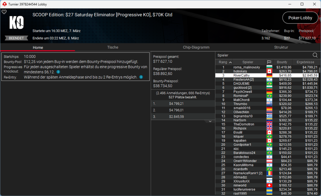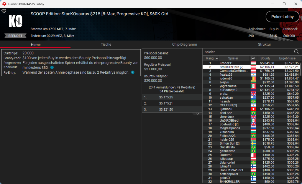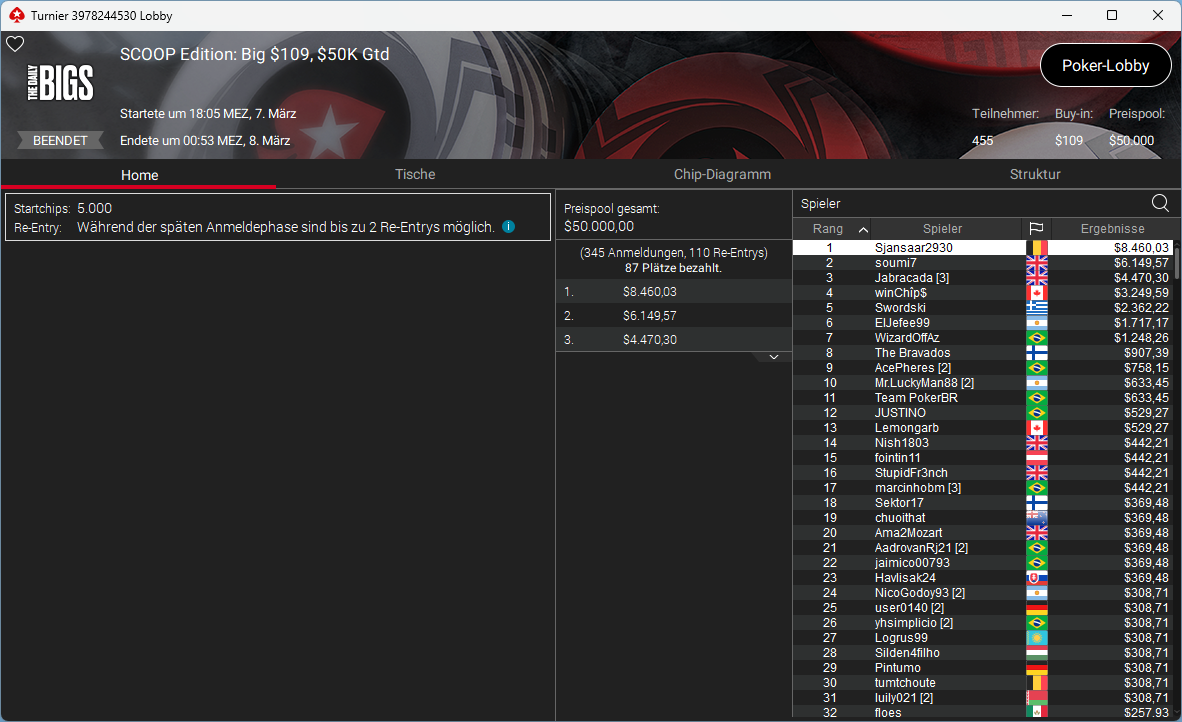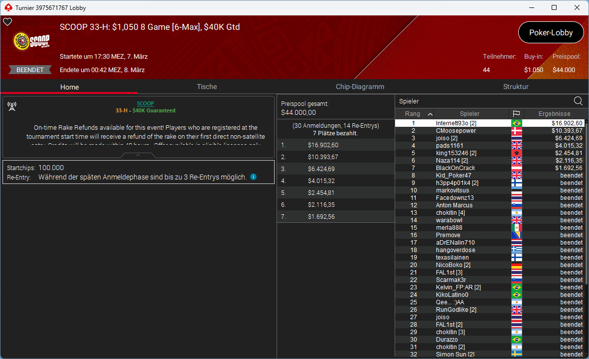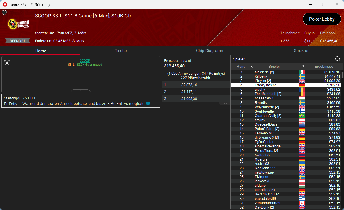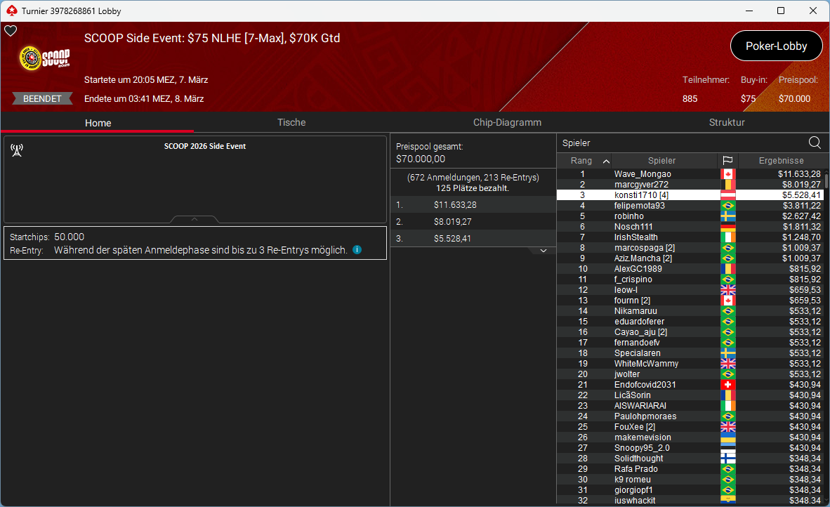 SmilleThHero verpasste beim $215 StaKOsaurus den Sieg ($5.175 + $2.166), -t,tq-,zft@z konnte das $22 Saturday Cameleon für $3.562 + $786 holen. Auch konsti1710 konnte für Rang 3 beim $75 NLH Side Event über $5.528 jubeln. aly@gauloises siegte zu später Stunde beim $109 NLO8 für $1.432 + $3.047.