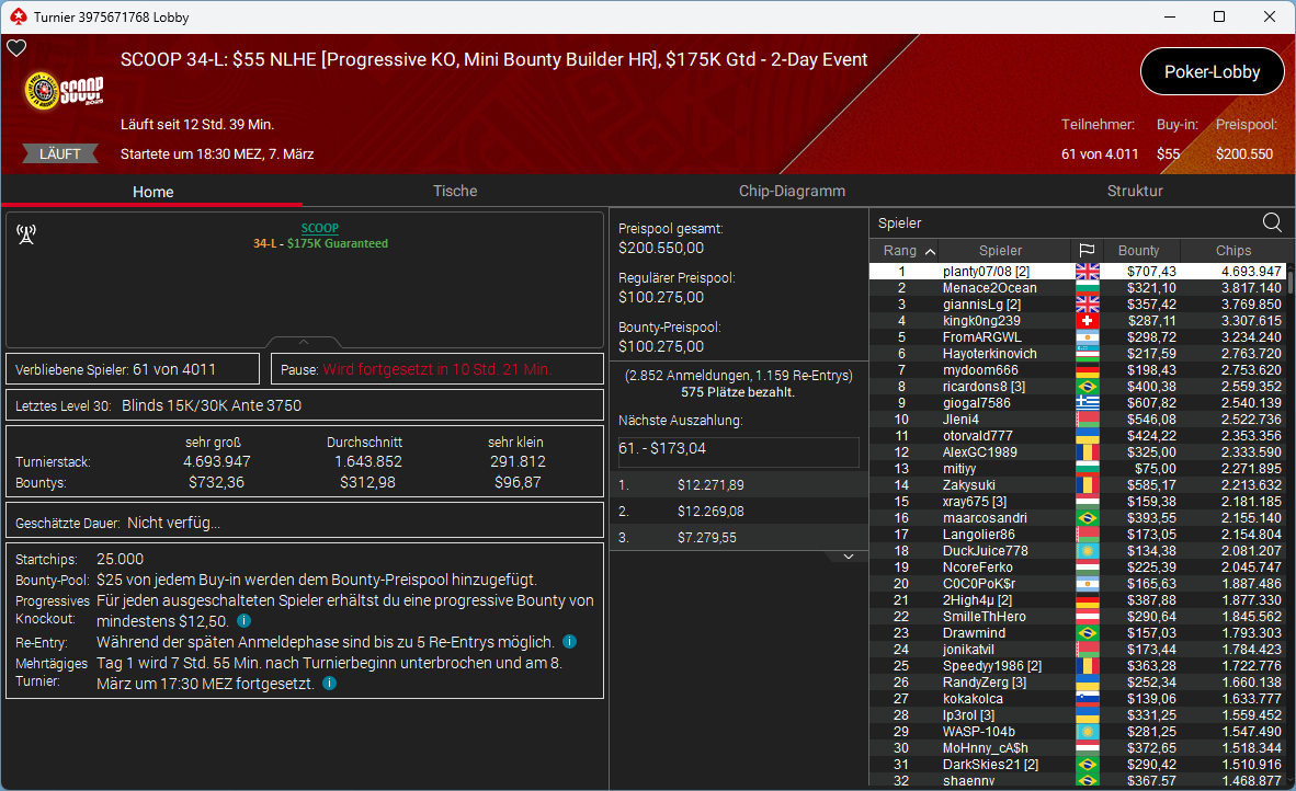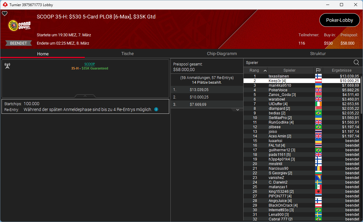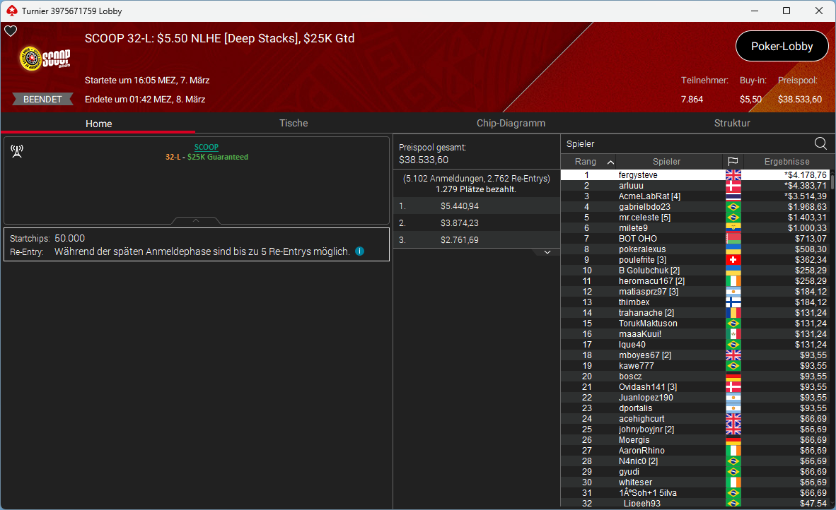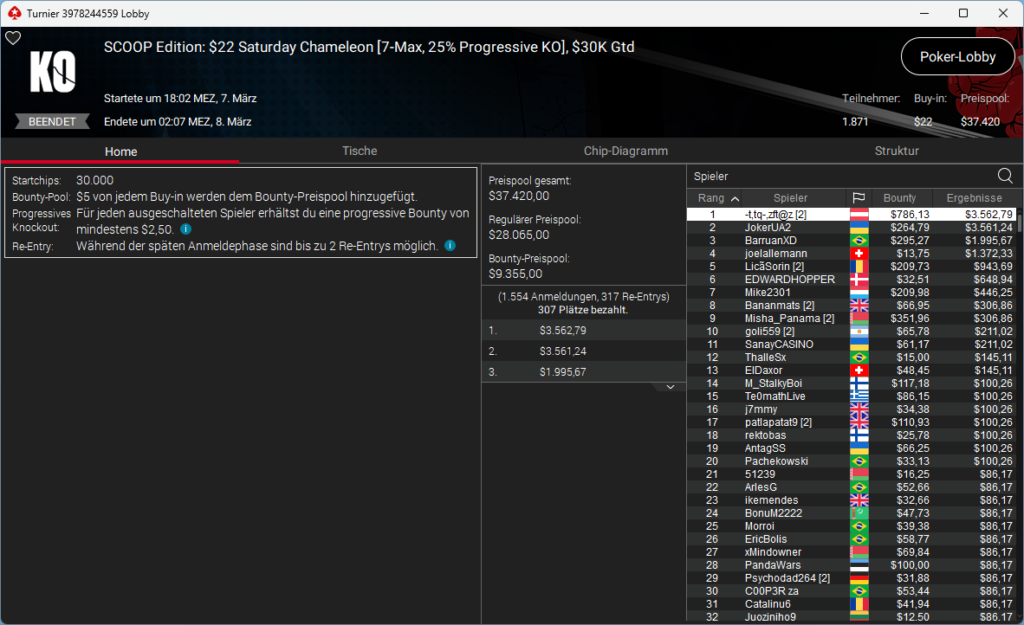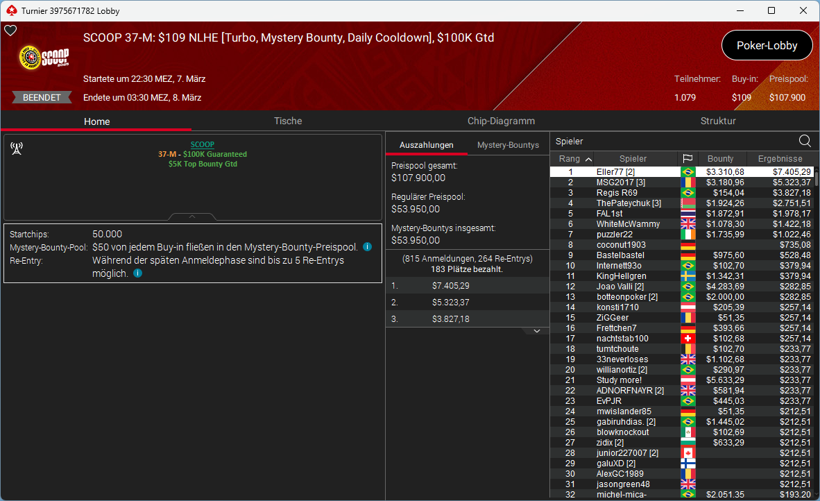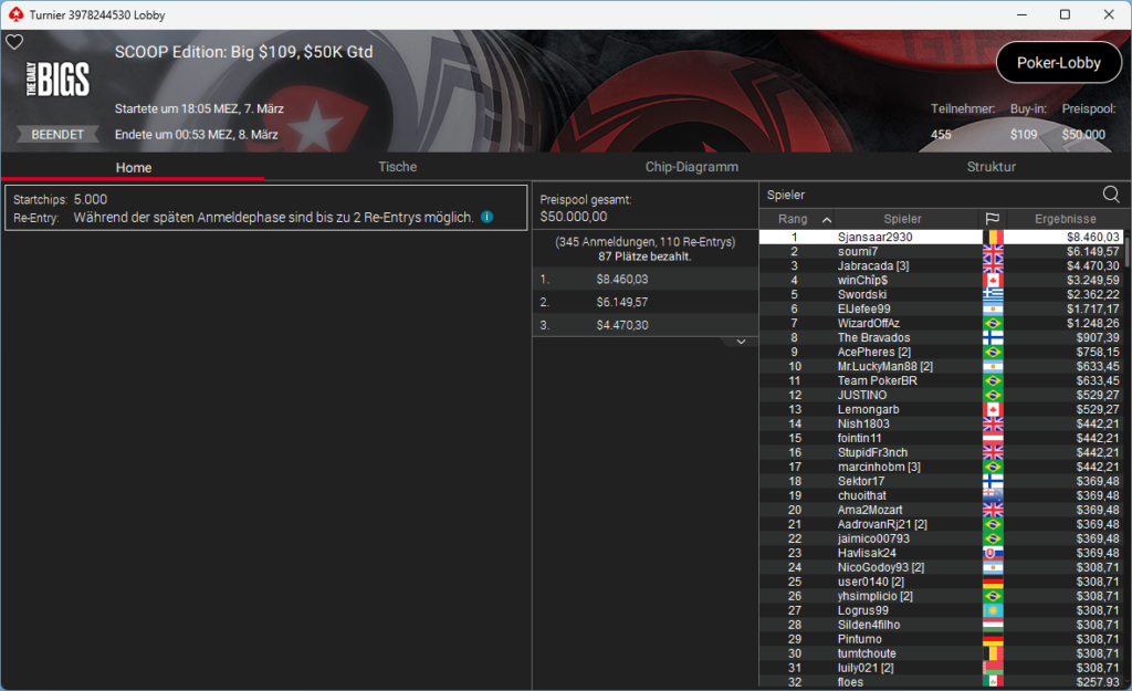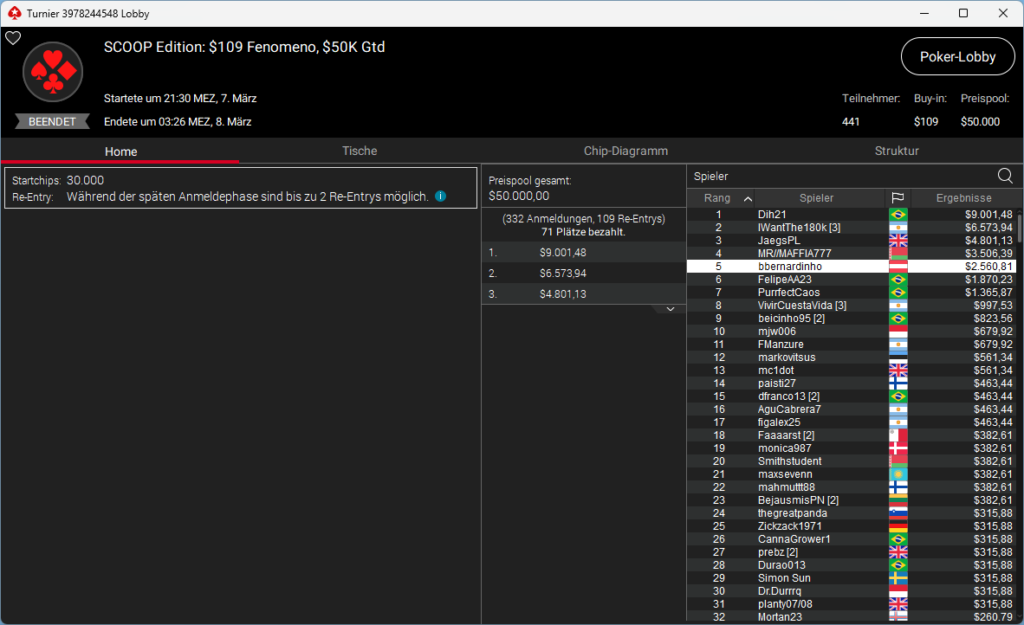 SmilleThHero verpasste beim $215 StaKOsaurus den Sieg ($5.175 + $2.166), -t,tq-,zft@z konnte das $22 Saturday Cameleon für $3.562 + $786 holen. Auch konsti1710 konnte für Rang 3 beim $75 NLH Side Event über $5.528 jubeln. aly@gauloises siegte zu später Stunde beim $109 NLO8 für $1.432 + $3.047.