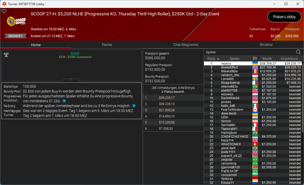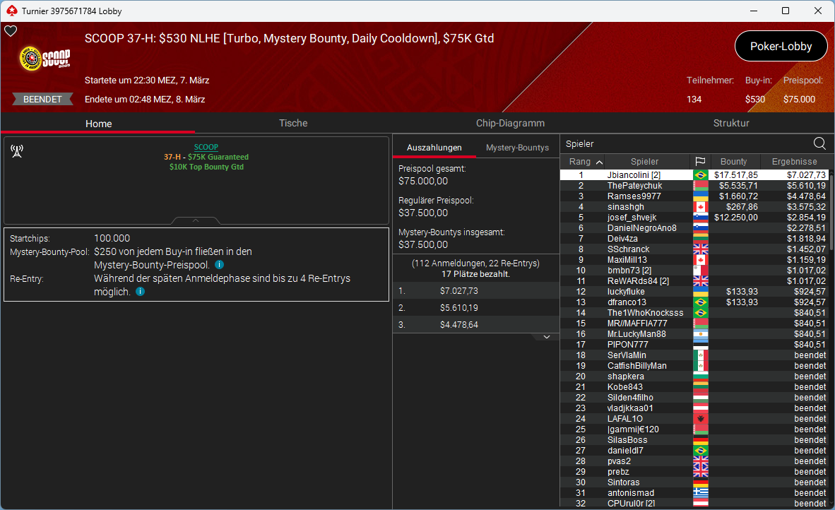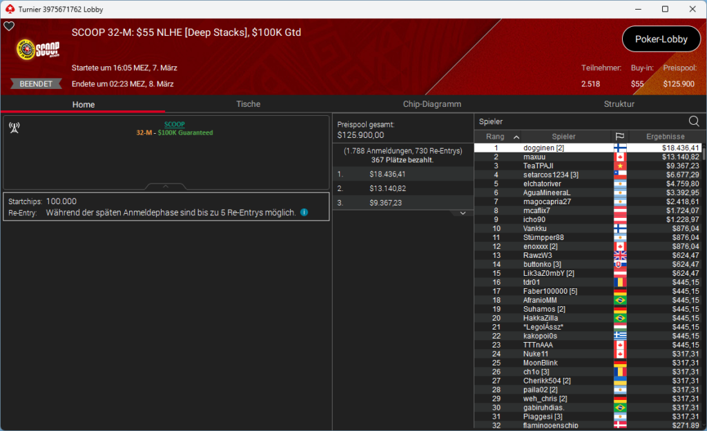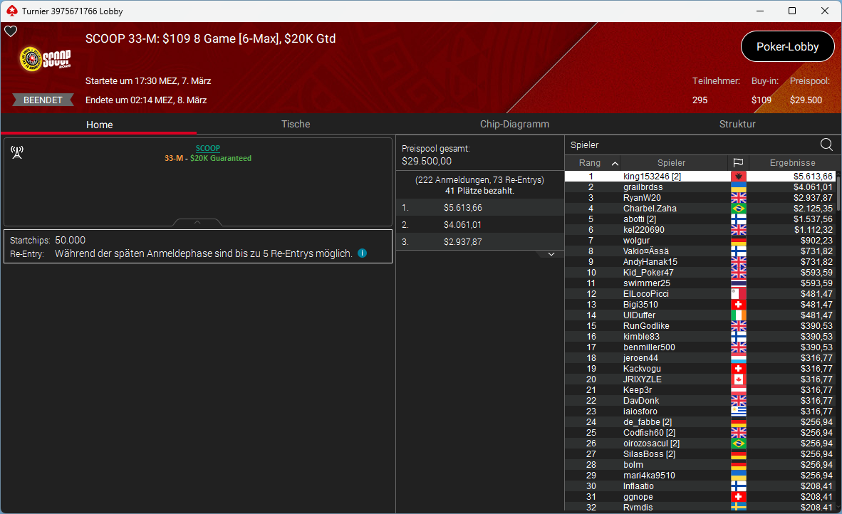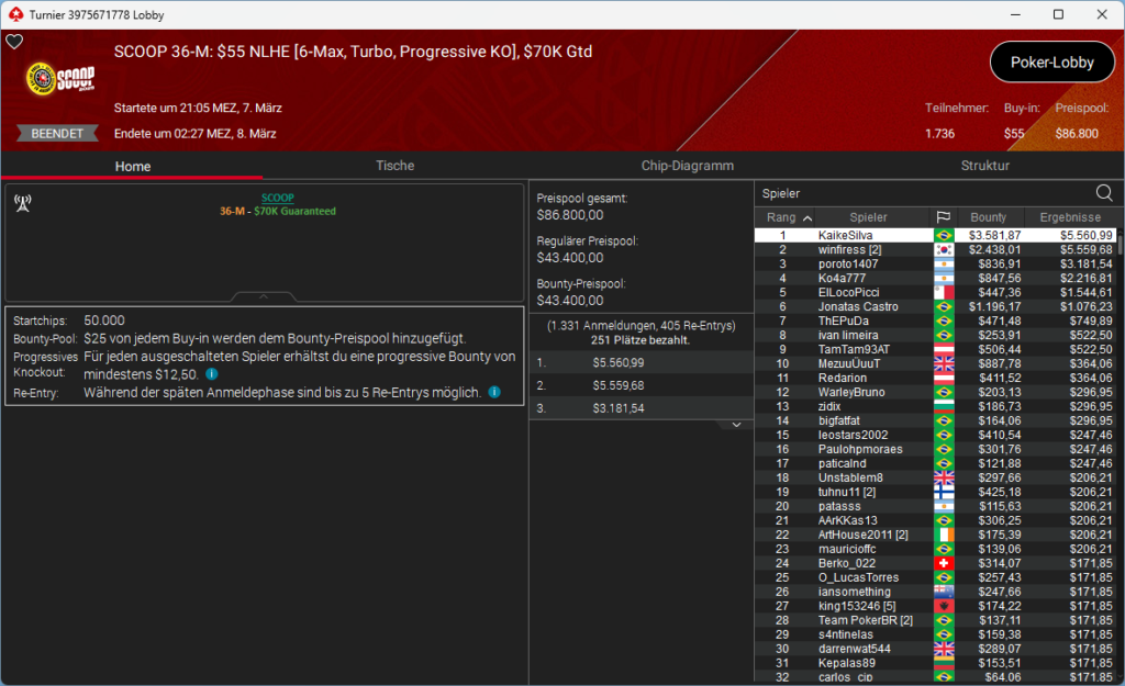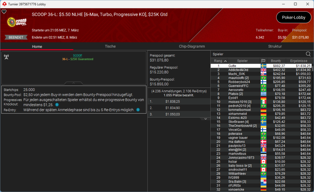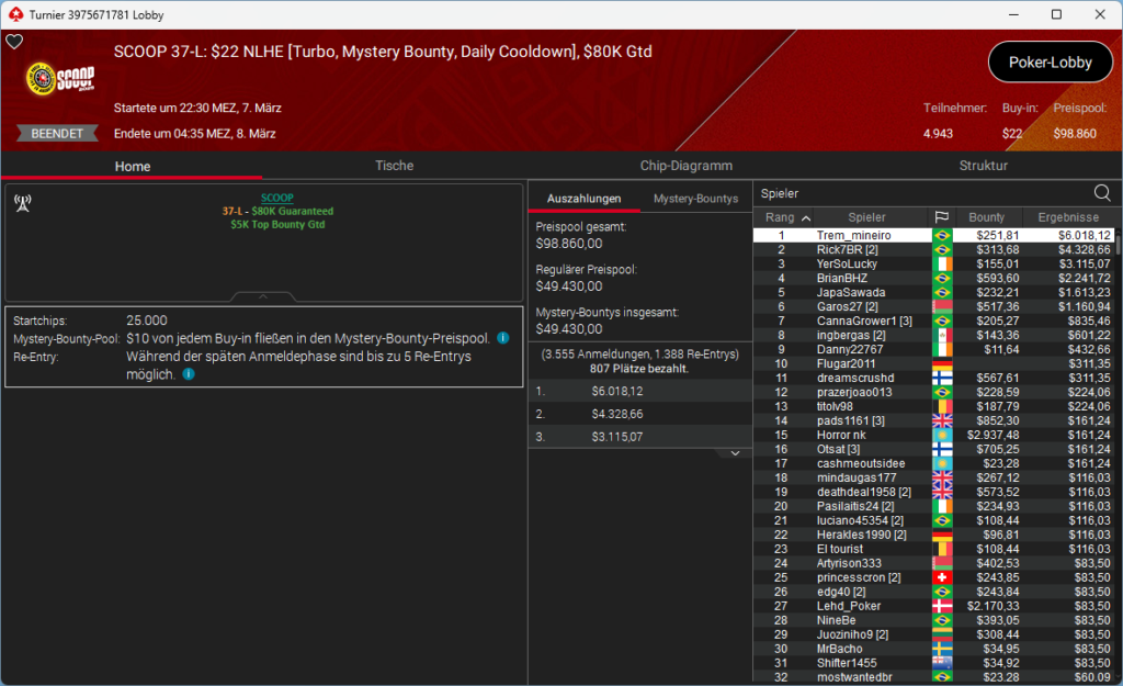 SmilleThHero verpasste beim $215 StaKOsaurus den Sieg ($5.175 + $2.166), -t,tq-,zft@z konnte das $22 Saturday Cameleon für $3.562 + $786 holen. Auch konsti1710 konnte für Rang 3 beim $75 NLH Side Event über $5.528 jubeln. aly@gauloises siegte zu später Stunde beim $109 NLO8 für $1.432 + $3.047.