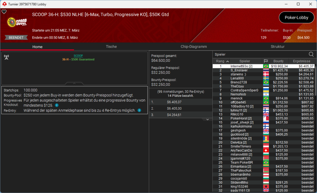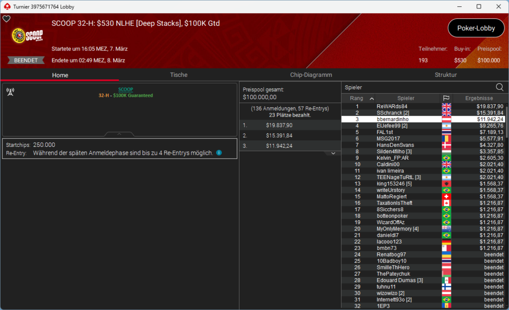 bbernardinho kam beim $530 NLH Deepstacks (32-H) auf Rang 3 und kassierte $11.942. Alexandre „ReWARds84“ Reard, der schon beim $530 Thursday Thrill (#27-M) für $22.217 + $22.298 erfolgreich war, holte auch hier Gold und $19.837. Keep3r musste sich beim $530 5-Card PLO8 mit Silber ($10.000) begnügen.