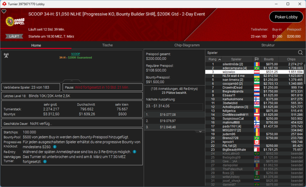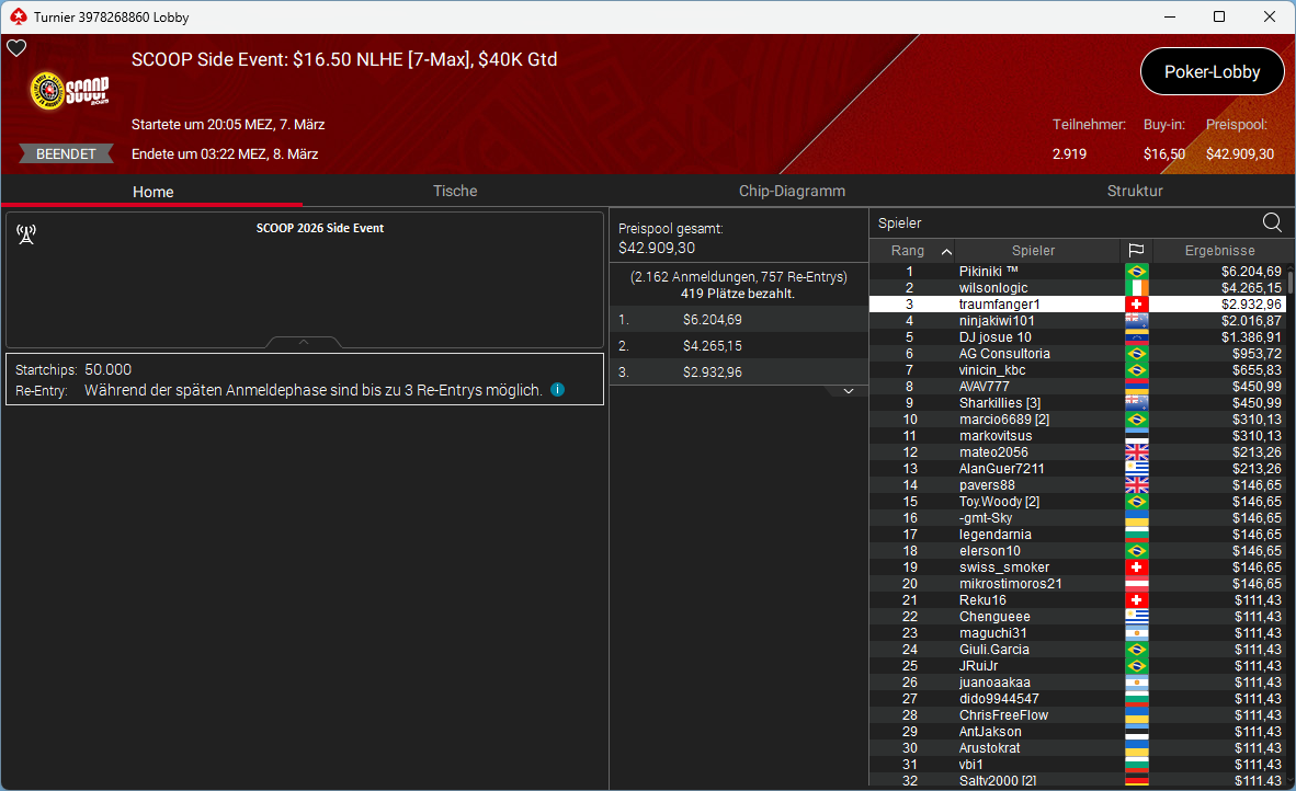 Die Brasilianer dominierten den ersten Samstag der SCOOP 2026 auf PokerStars, für die DACH Community gab es nur wenig Grund zu jubeln.