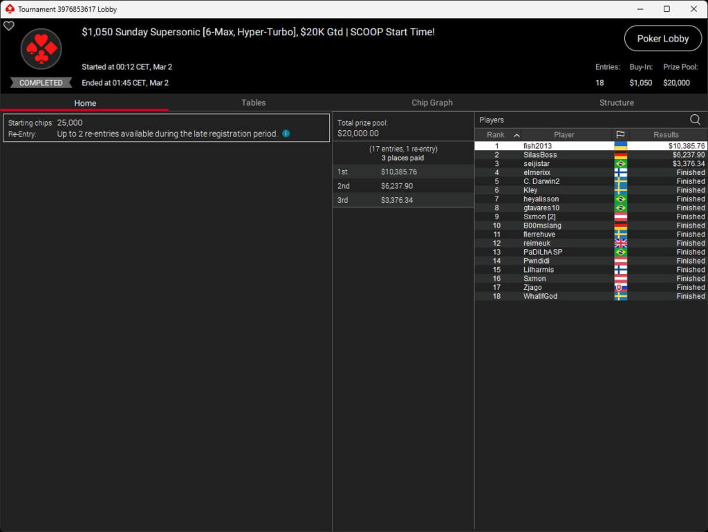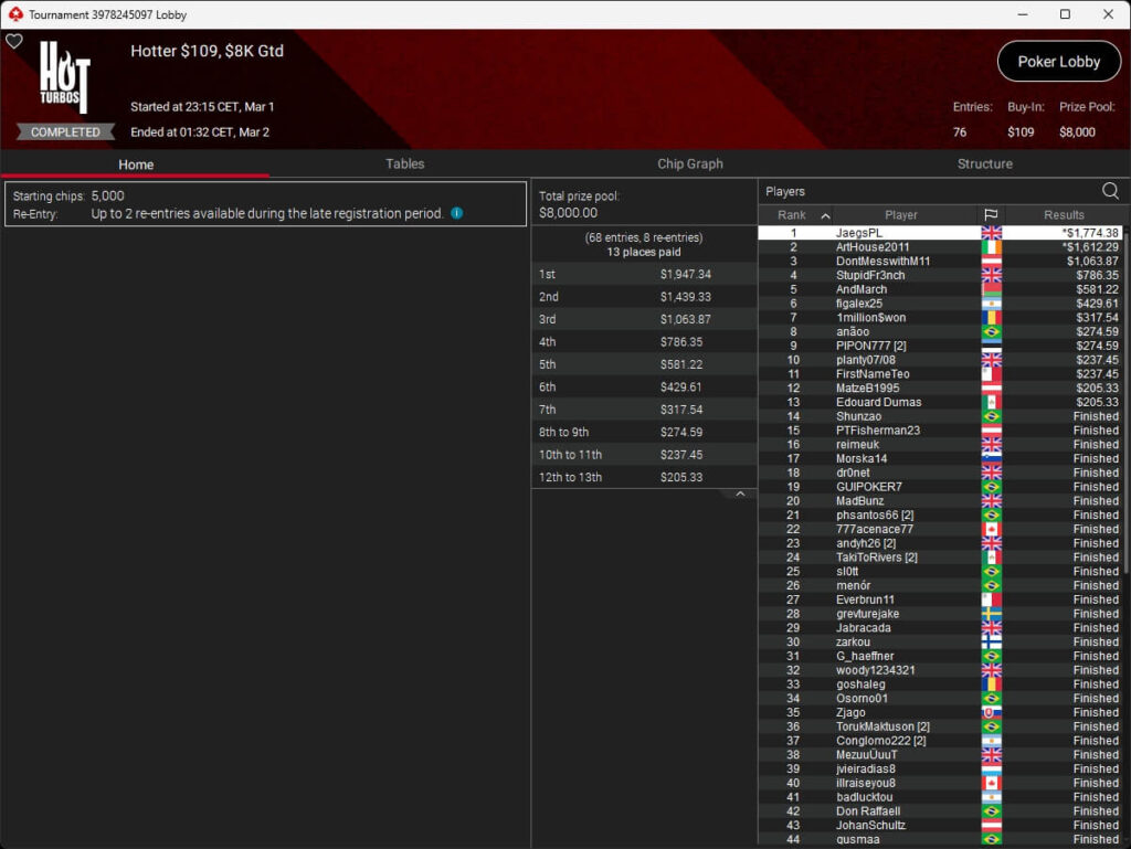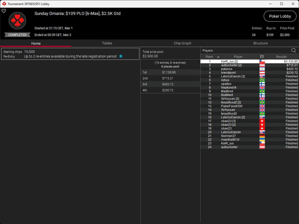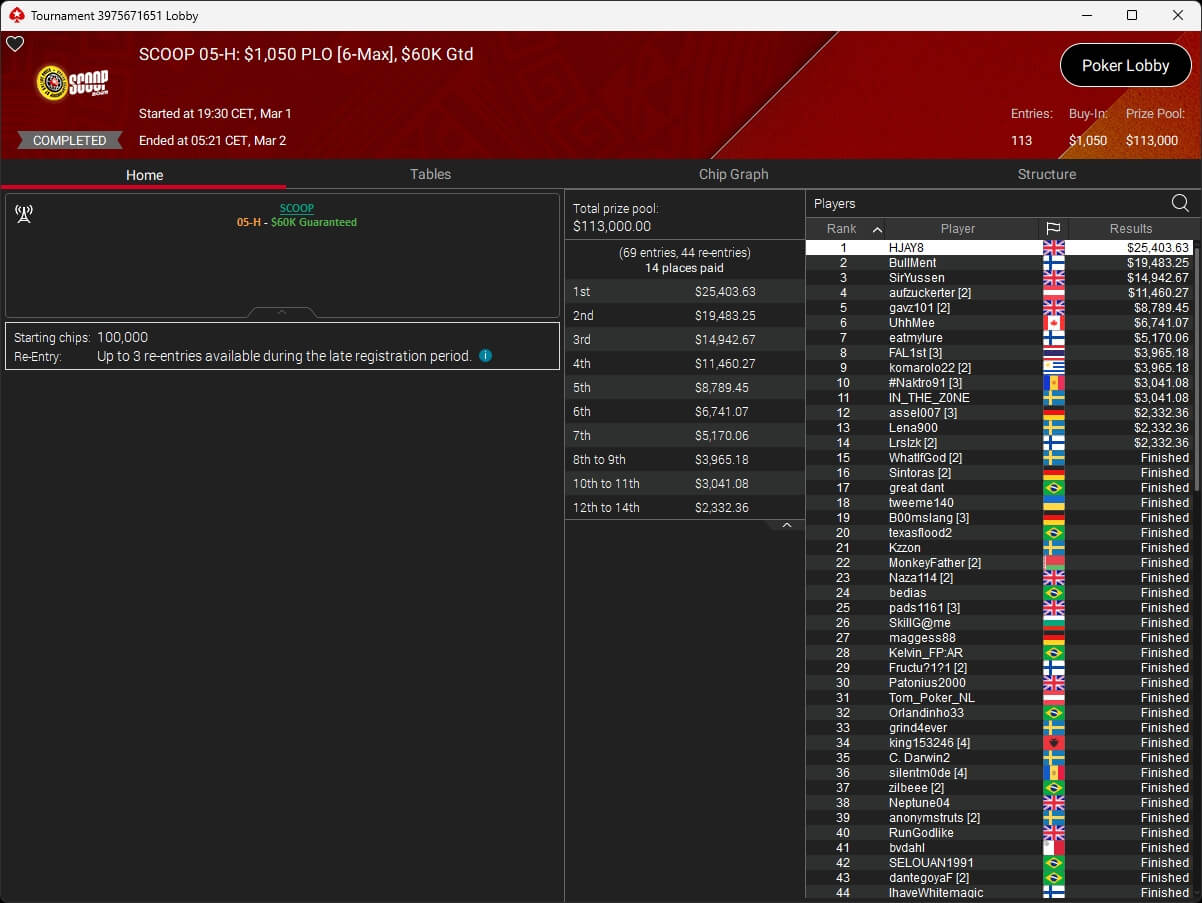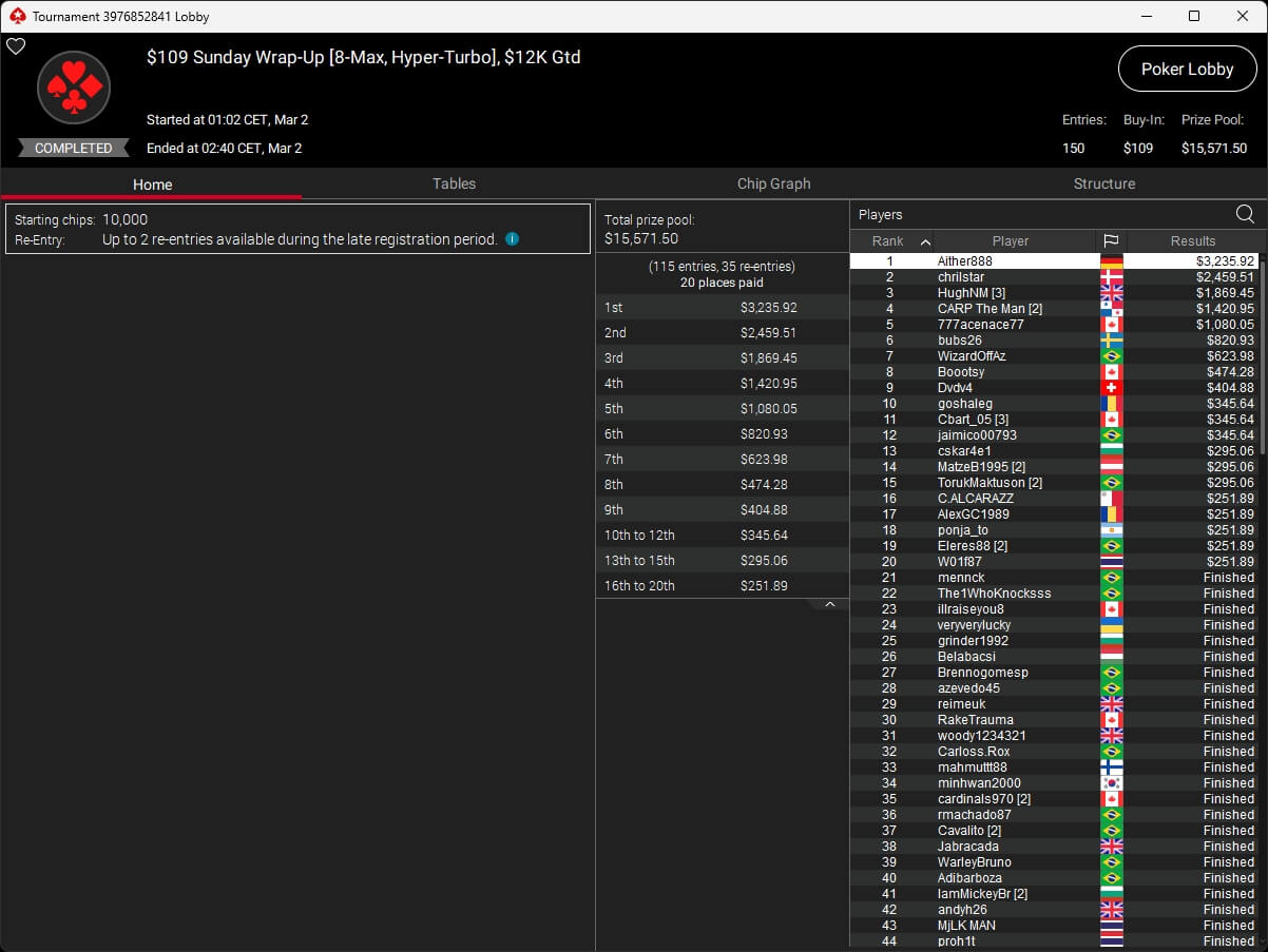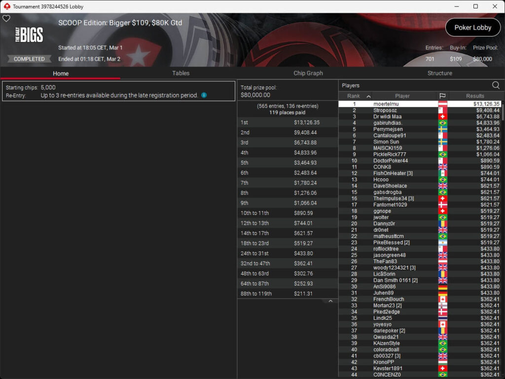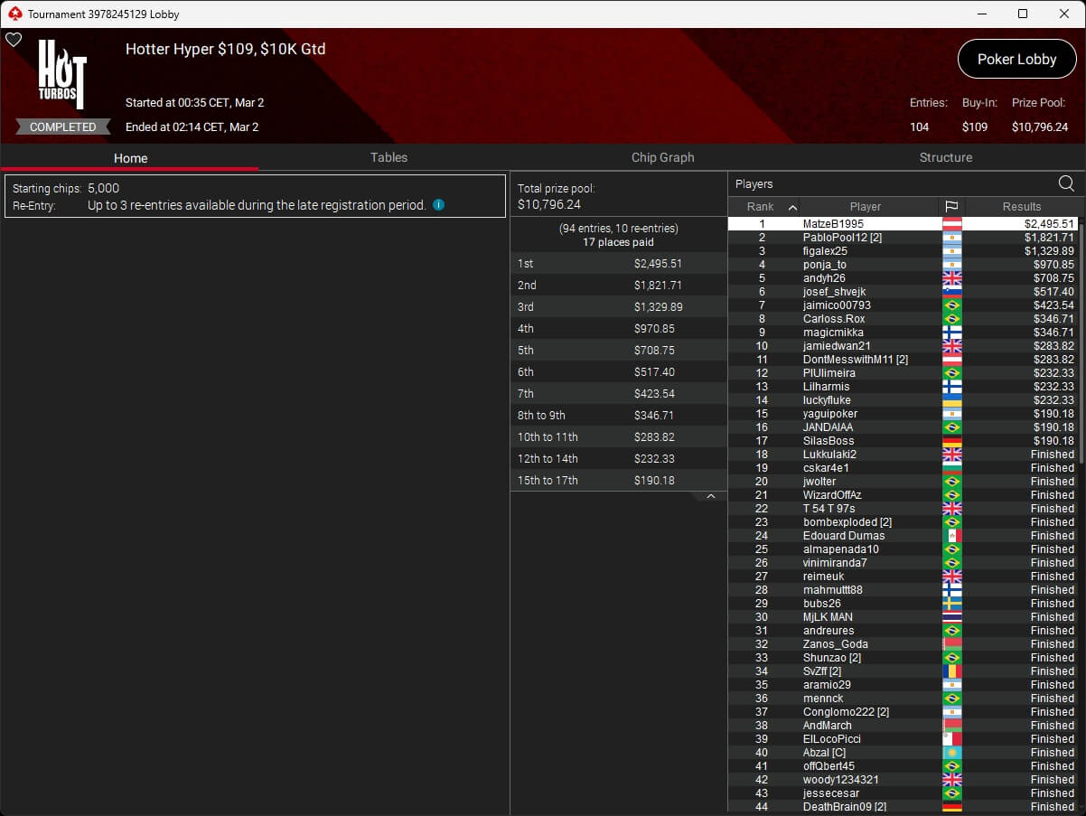 Auch bei den regulären MTTs schlug die deutschsprachige Poker-Community zu. Aither888 ($3.235,92; $109 Sunday Wrap-Up), MatzeB1995 ($2.495,51; $109 Hotter Hyper) und sunrAis3 ($438,55 + $612,50; $109 Bounty Builder) gehörten zu den Siegern.