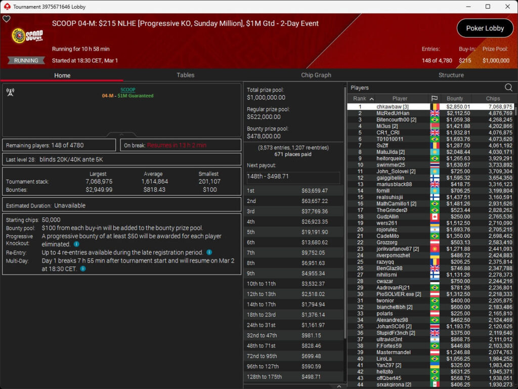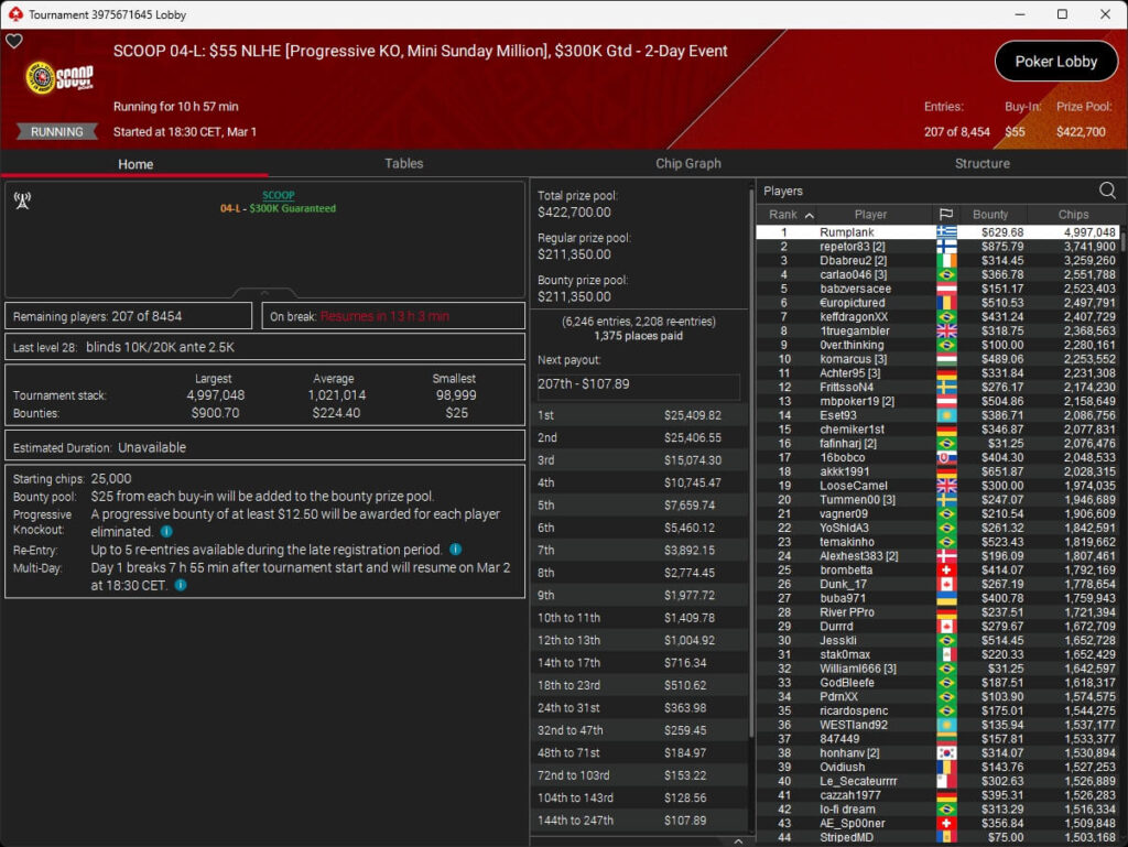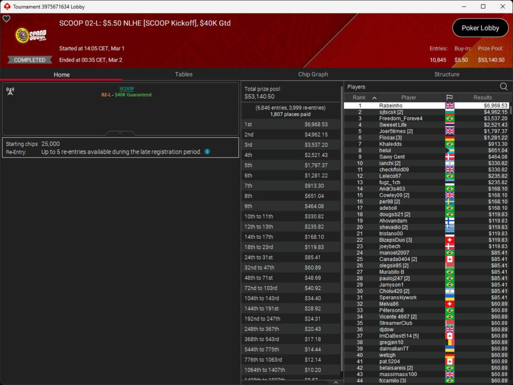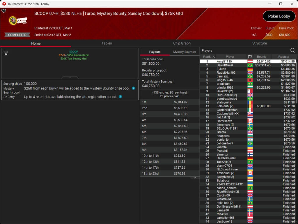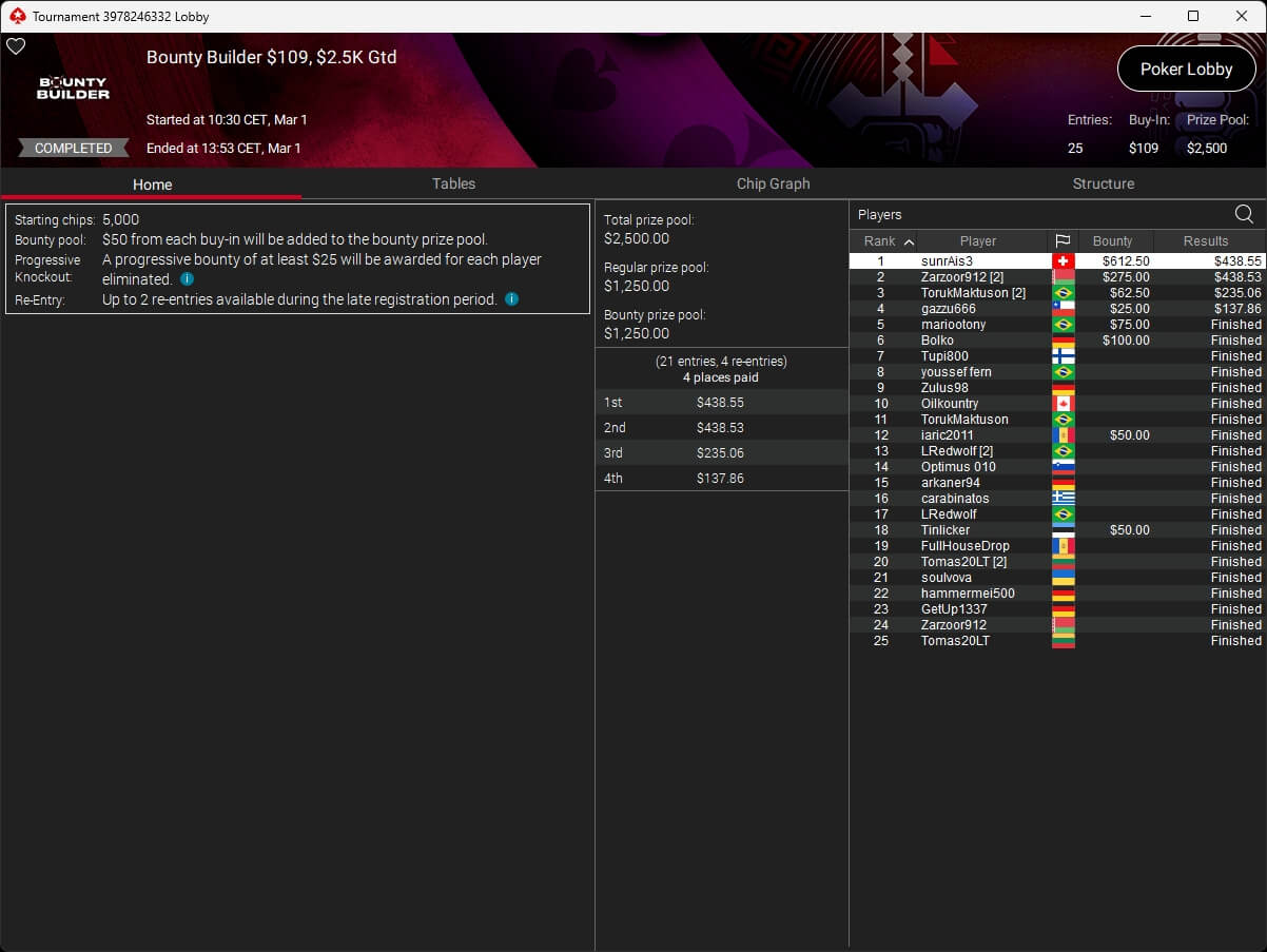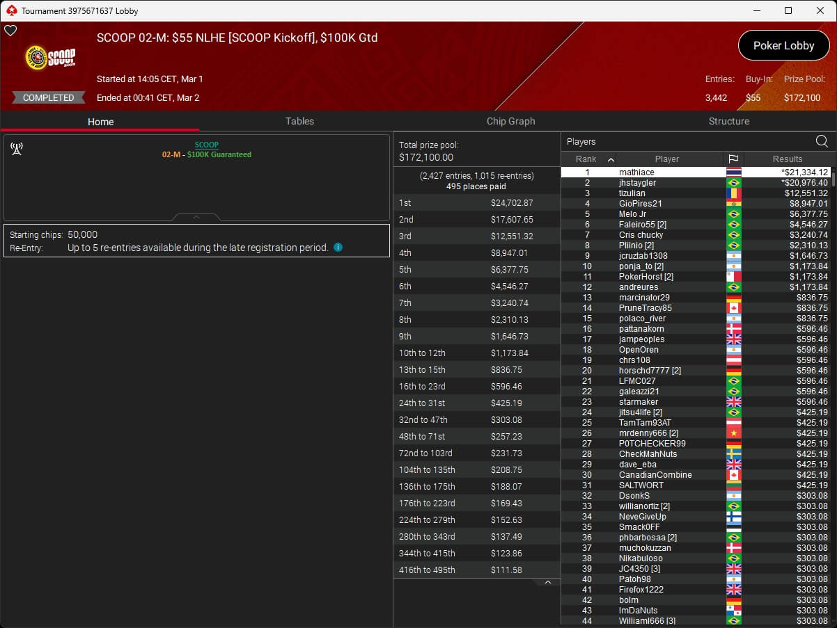 Auch bei den regulären MTTs schlug die deutschsprachige Poker-Community zu. Aither888 ($3.235,92; $109 Sunday Wrap-Up), MatzeB1995 ($2.495,51; $109 Hotter Hyper) und sunrAis3 ($438,55 + $612,50; $109 Bounty Builder) gehörten zu den Siegern.