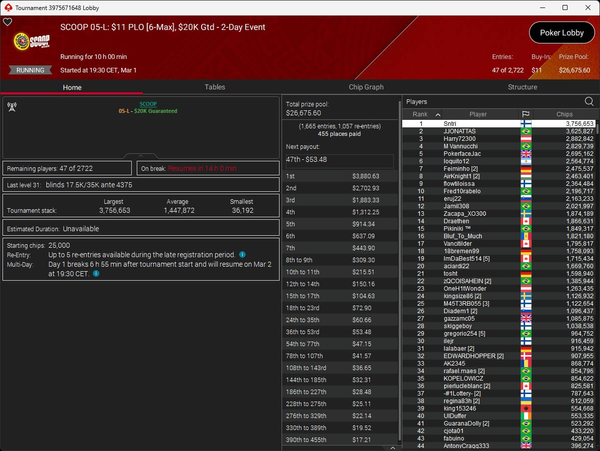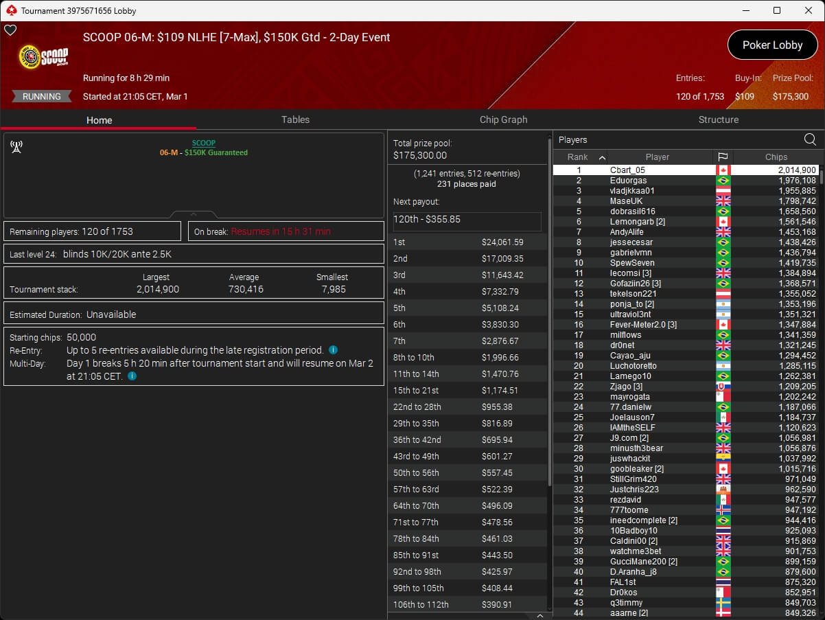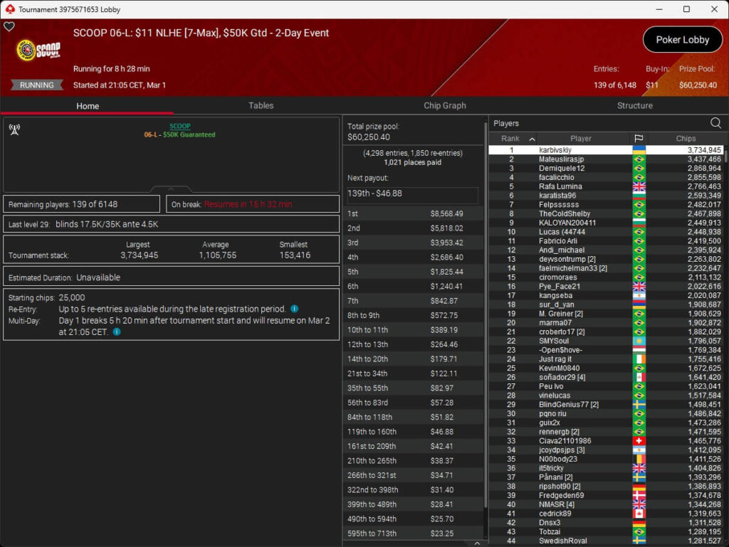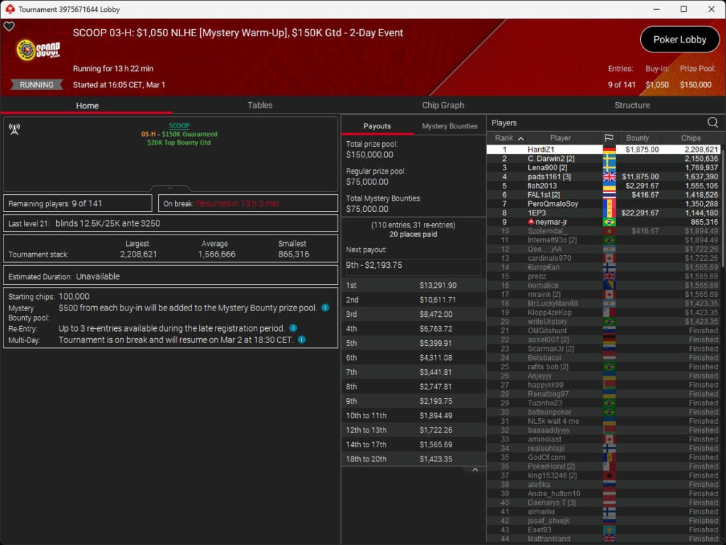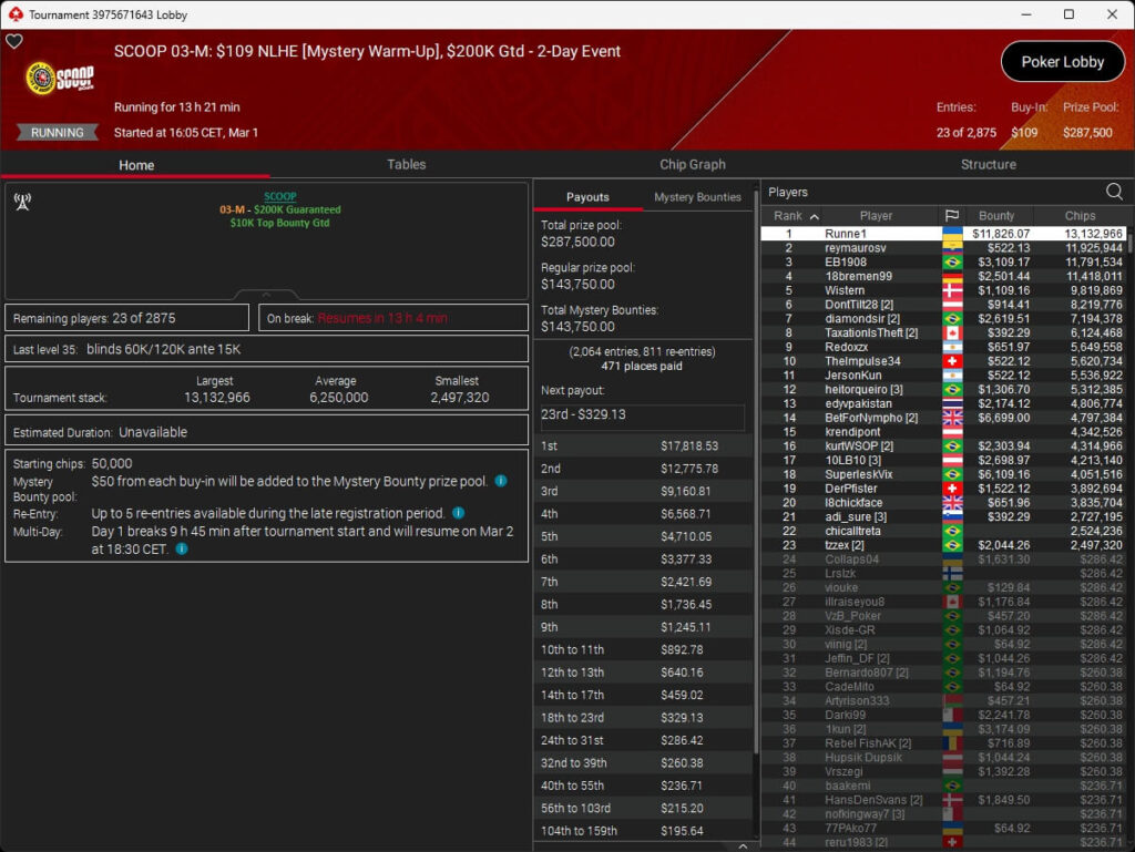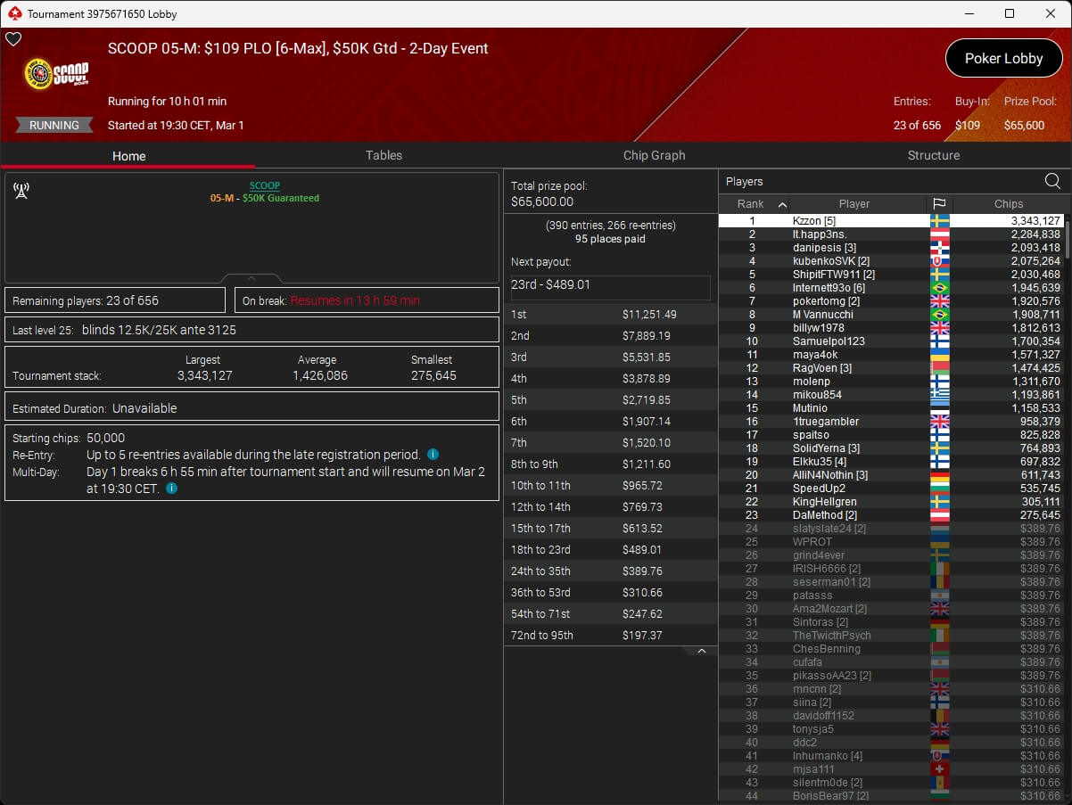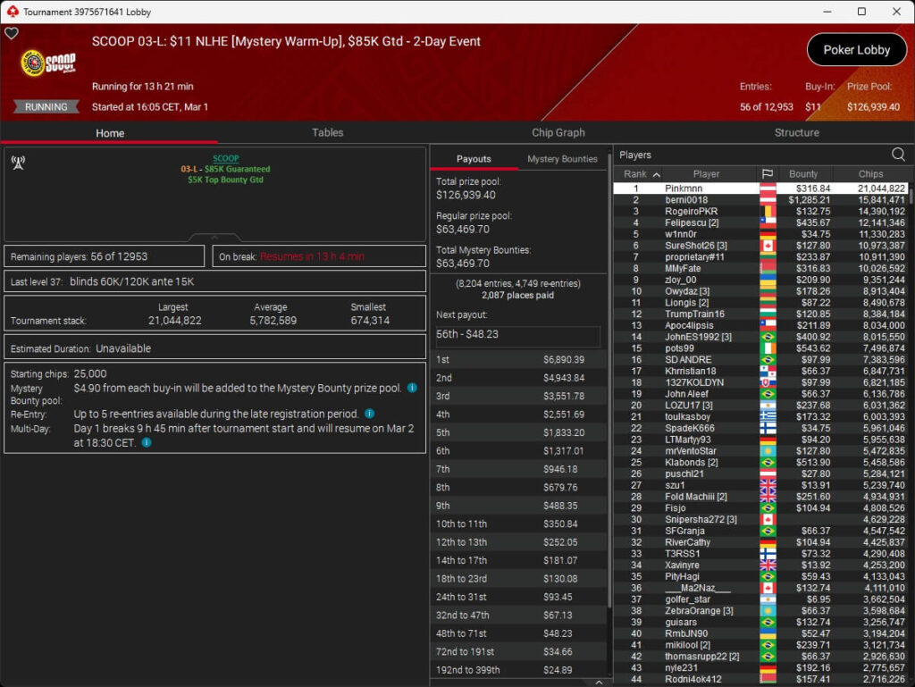 Auch bei den regulären MTTs schlug die deutschsprachige Poker-Community zu. Aither888 ($3.235,92; $109 Sunday Wrap-Up), MatzeB1995 ($2.495,51; $109 Hotter Hyper) und sunrAis3 ($438,55 + $612,50; $109 Bounty Builder) gehörten zu den Siegern.
