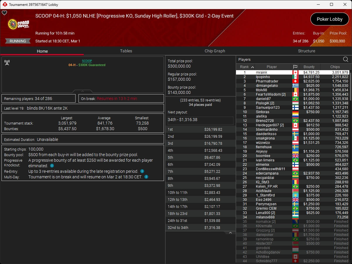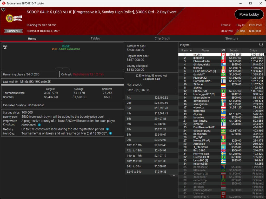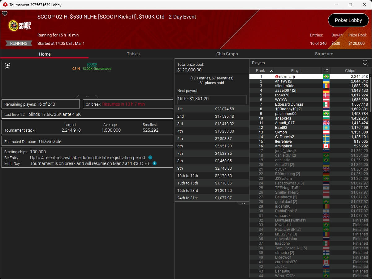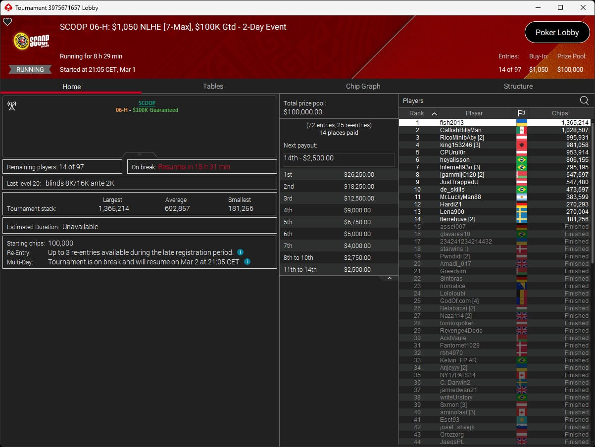 Gestern fiel auf PokerStars der Startschuss zur SCOOP 2026. Mit konsti1710 ($7.014,99 + $2.015,62; $530 Sunday Cooldown) stellte die DACH-Gemeinde direkt einen der Sieger. Dazu sicherte sich moertelmu ($13.126,35) beim $109 Bigger SCOOP Edition einen Turniersieg.