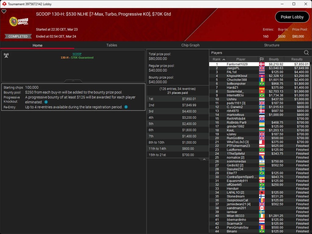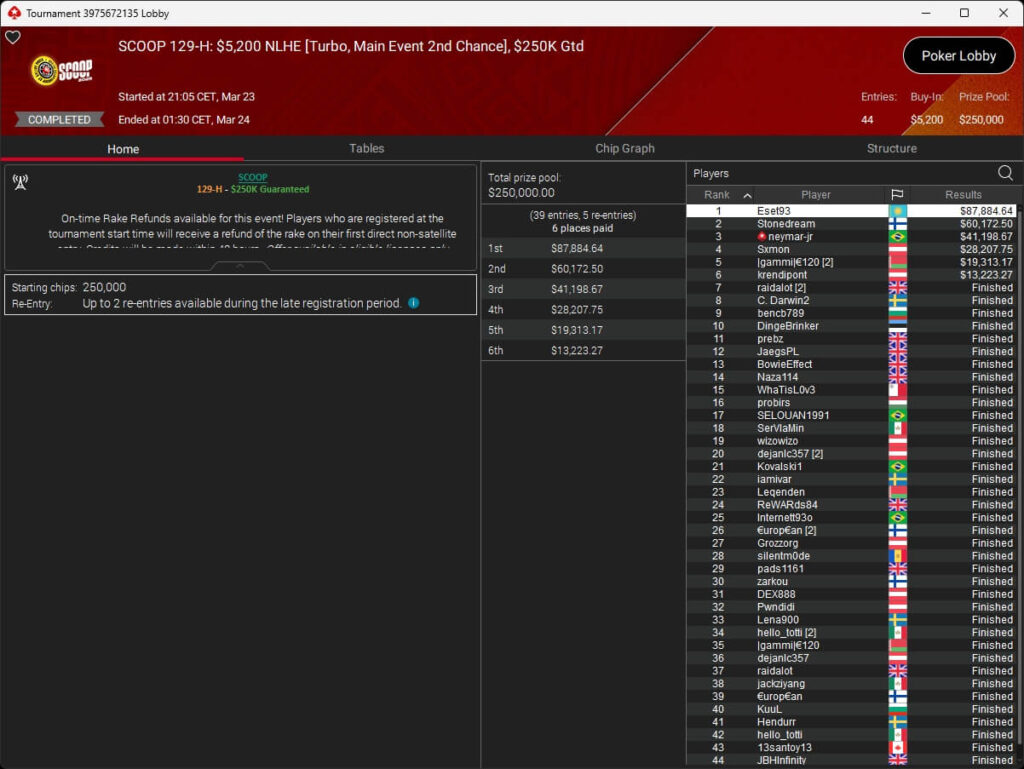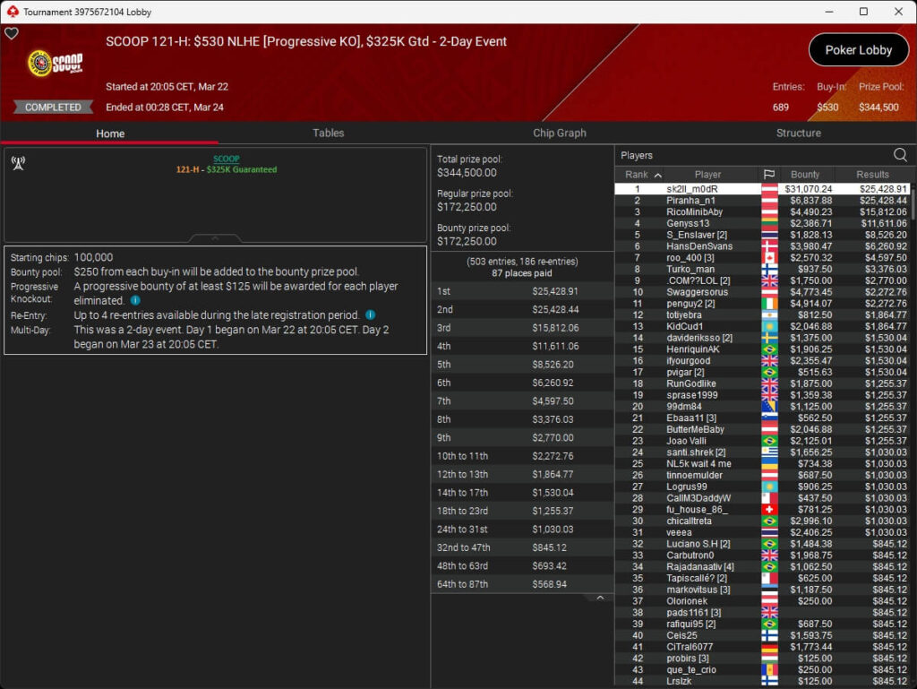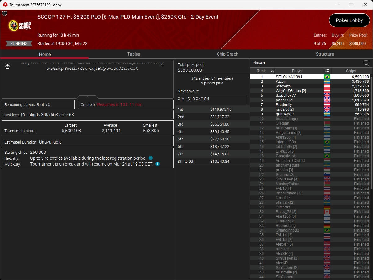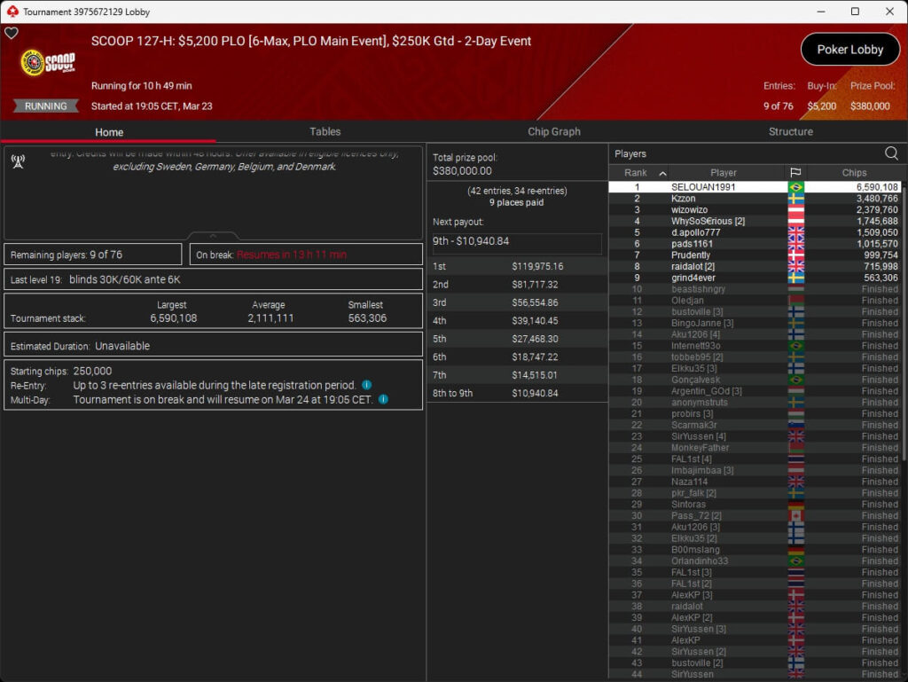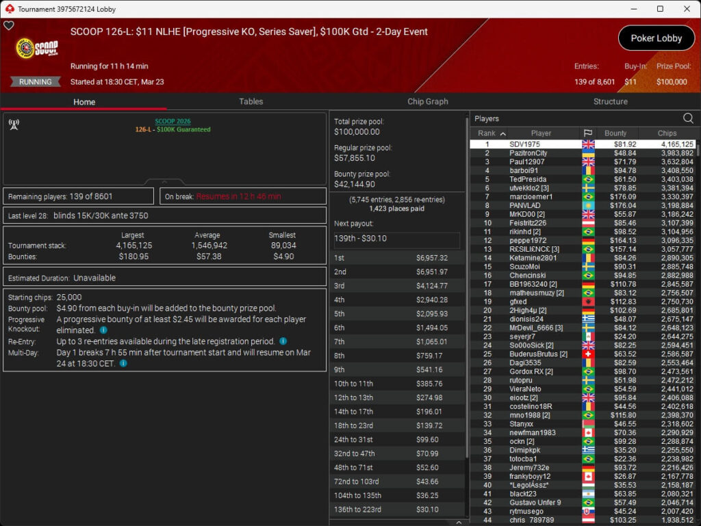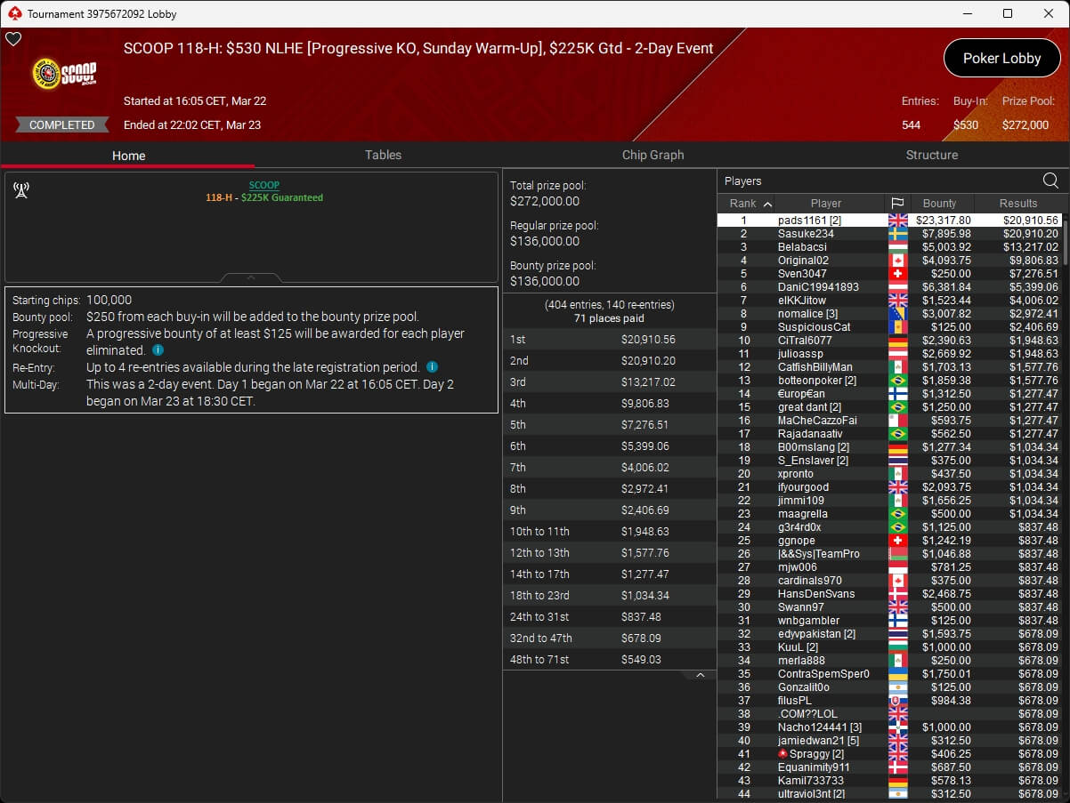Erst am Samstag verbuchte Patrick Leonard zwei Titel auf PokerStars und schraubte seine Bilanz auf insgesamt 15 SCOOP-Siege. Mit dem Titel im $530 Sunday Warm-Up baute der Brite diesen Rekord nun aus. Dazu kommen weitere 13 WCOOP-Titel, sodass der Grinder nun auf insgesamt 29 COOP-Siege kommt.