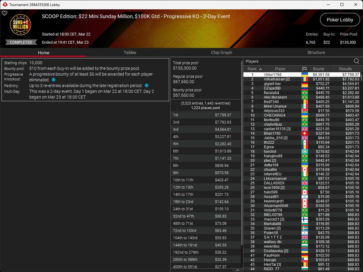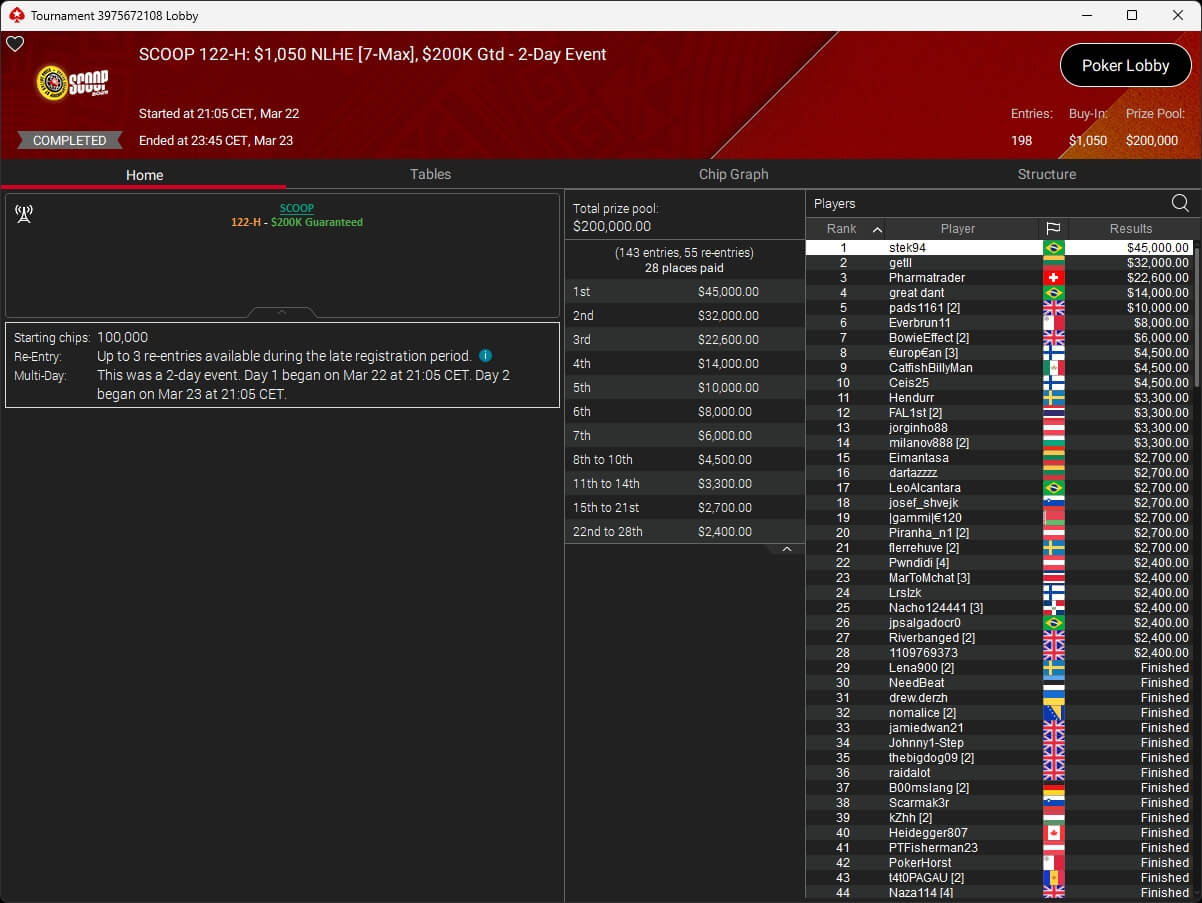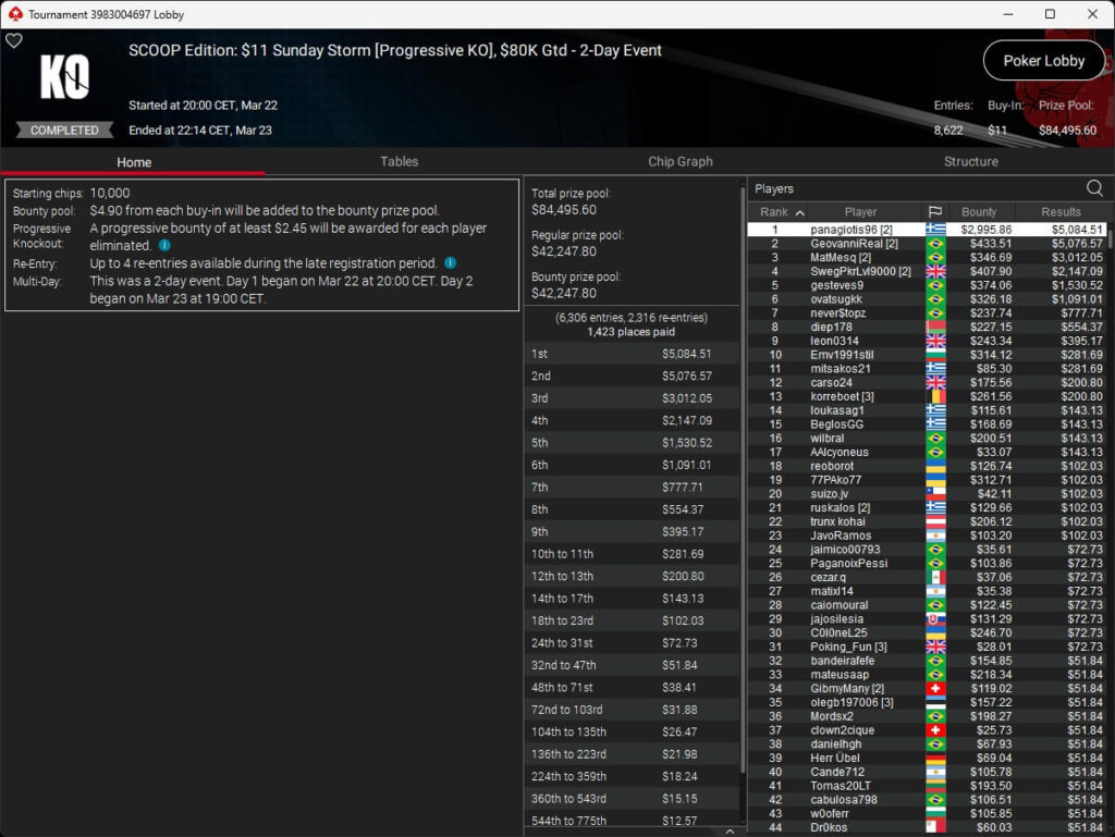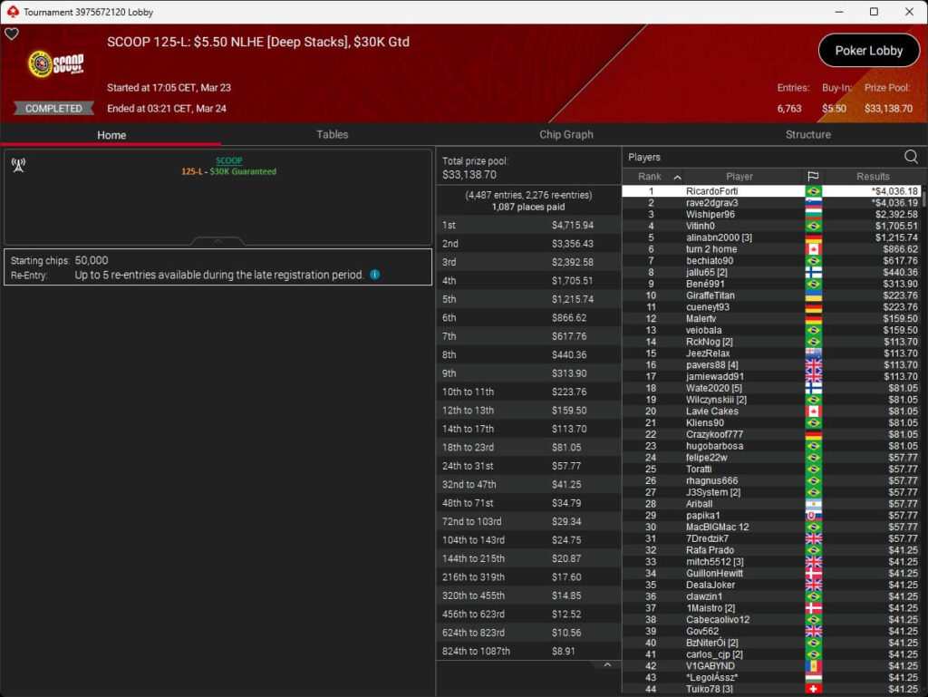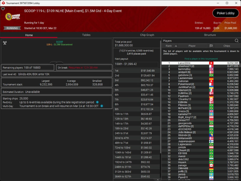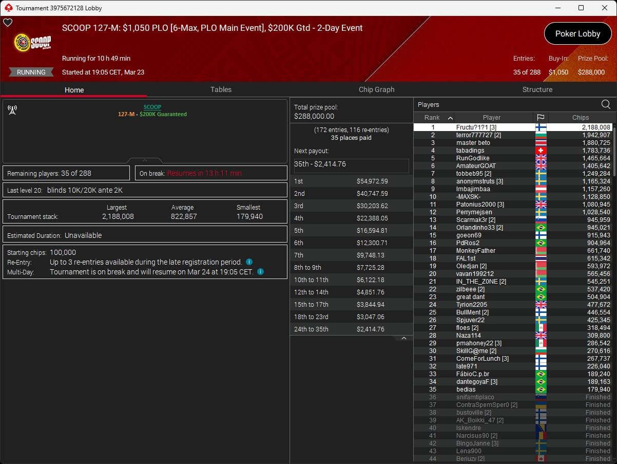 Erst am Samstag verbuchte Patrick Leonard zwei Titel auf PokerStars und schraubte seine Bilanz auf insgesamt 15 SCOOP-Siege. Mit dem Titel im $530 Sunday Warm-Up baute der Brite diesen Rekord nun aus. Dazu kommen weitere 13 WCOOP-Titel, sodass der Grinder nun auf insgesamt 29 COOP-Siege kommt.