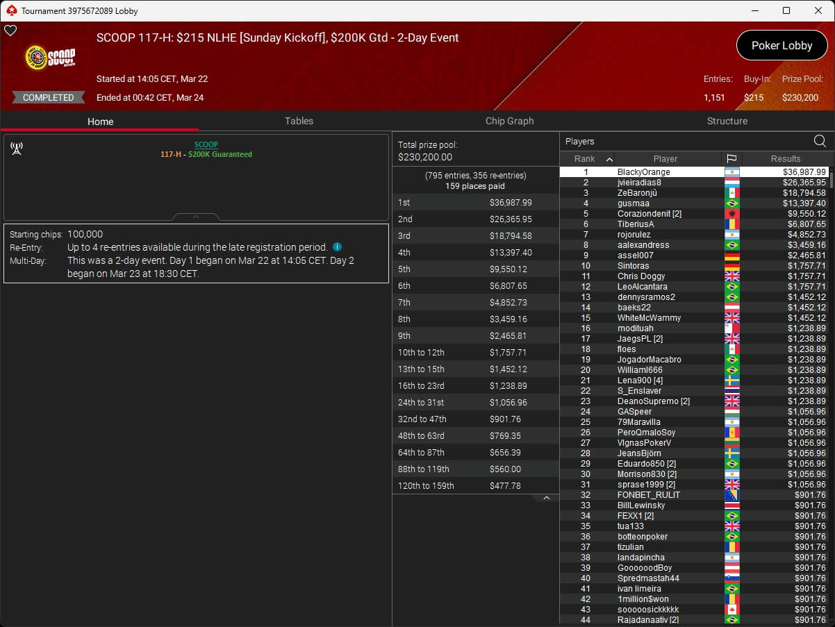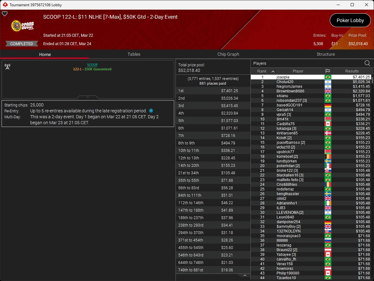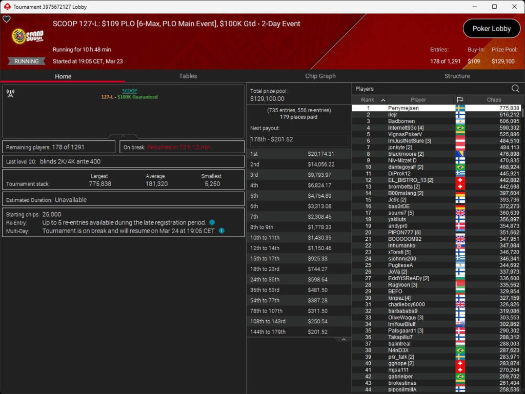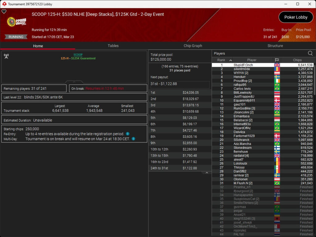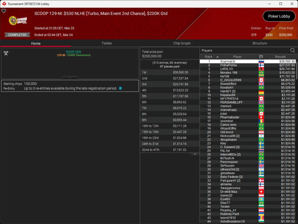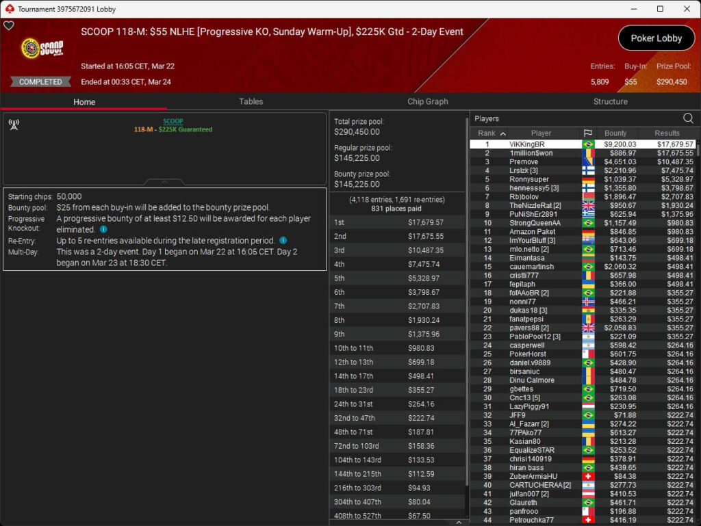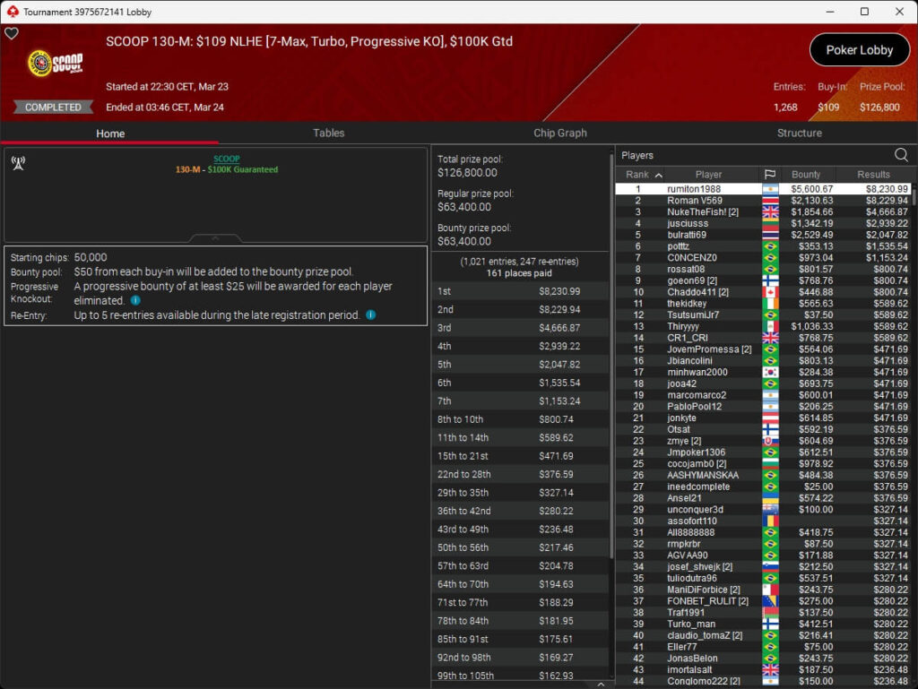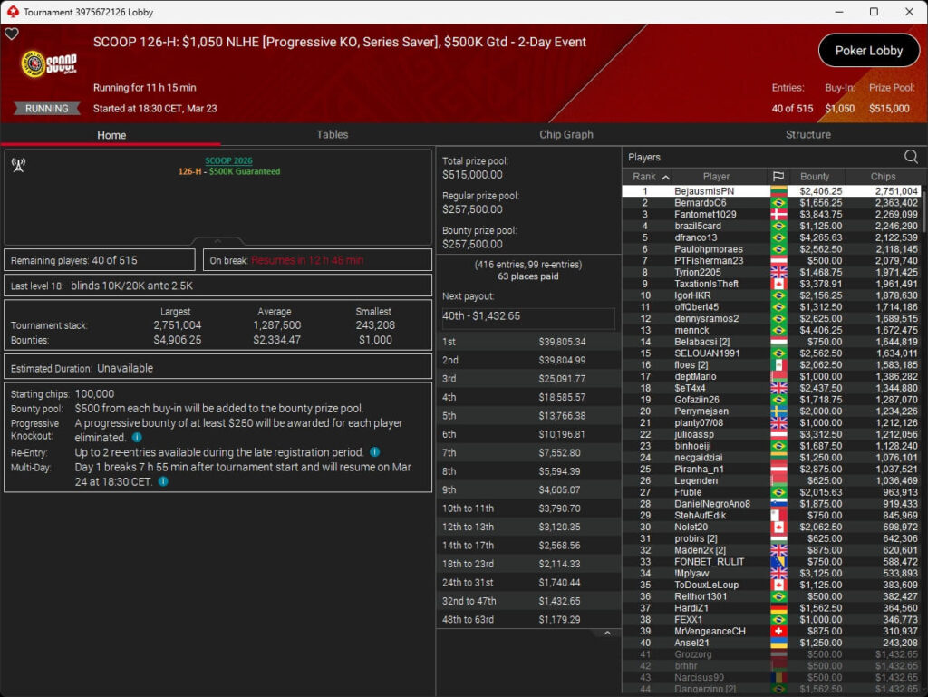 Erst am Samstag verbuchte Patrick Leonard zwei Titel auf PokerStars und schraubte seine Bilanz auf insgesamt 15 SCOOP-Siege. Mit dem Titel im $530 Sunday Warm-Up baute der Brite diesen Rekord nun aus. Dazu kommen weitere 13 WCOOP-Titel, sodass der Grinder nun auf insgesamt 29 COOP-Siege kommt.