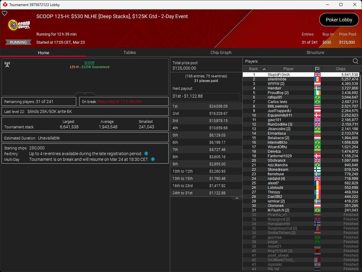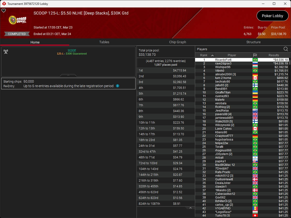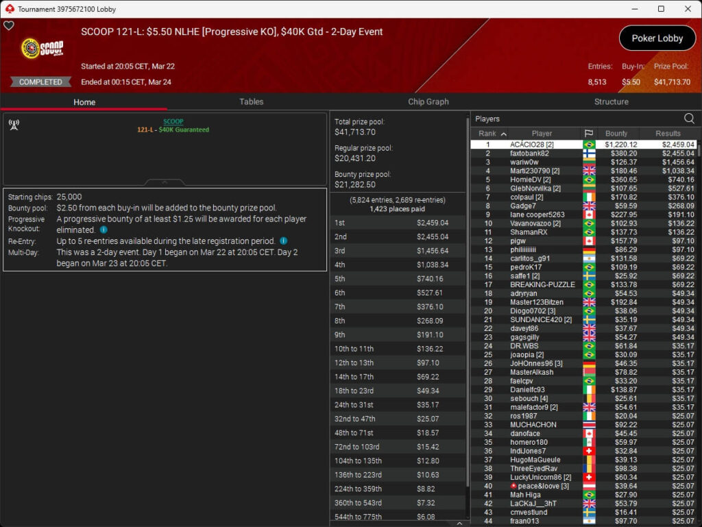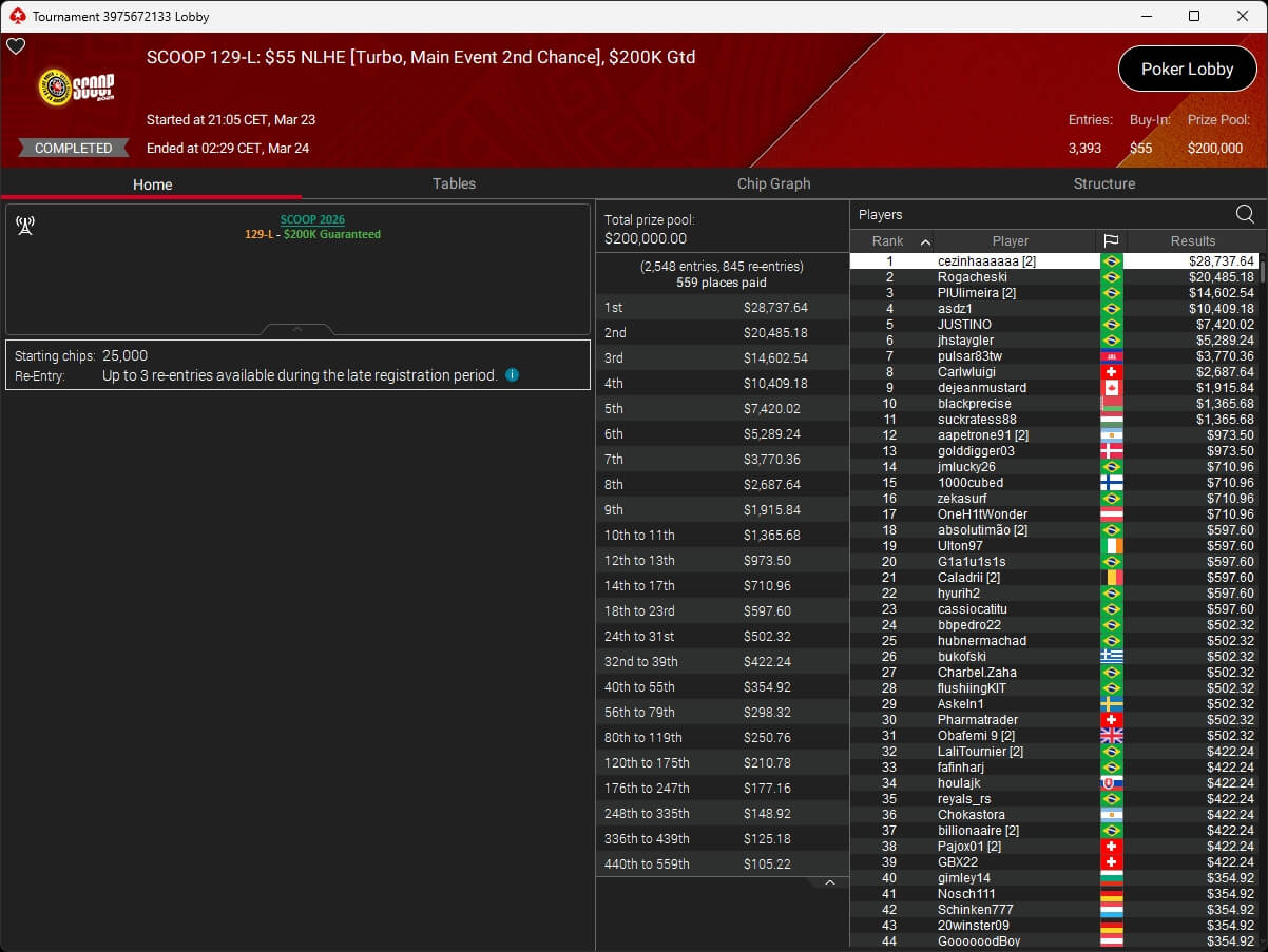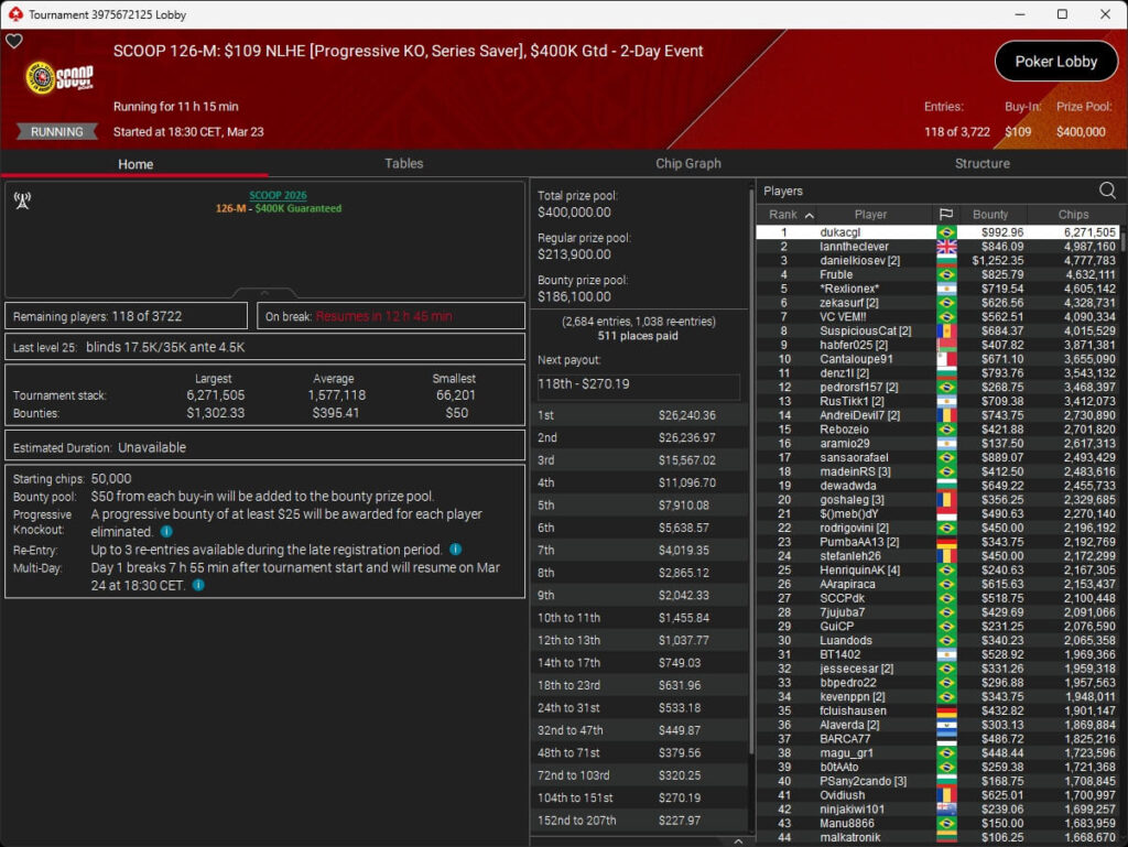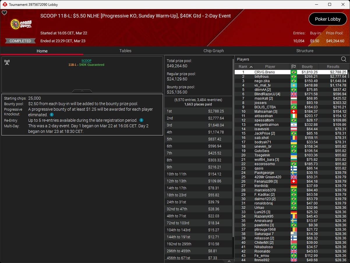 Erst am Samstag verbuchte Patrick Leonard zwei Titel auf PokerStars und schraubte seine Bilanz auf insgesamt 15 SCOOP-Siege. Mit dem Titel im $530 Sunday Warm-Up baute der Brite diesen Rekord nun aus. Dazu kommen weitere 13 WCOOP-Titel, sodass der Grinder nun auf insgesamt 29 COOP-Siege kommt.