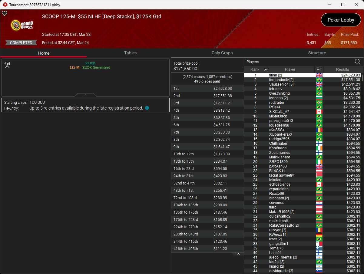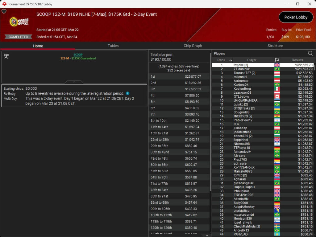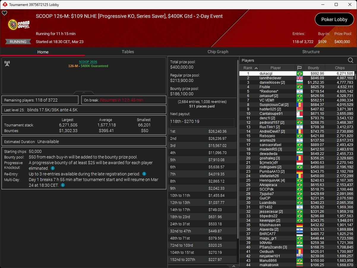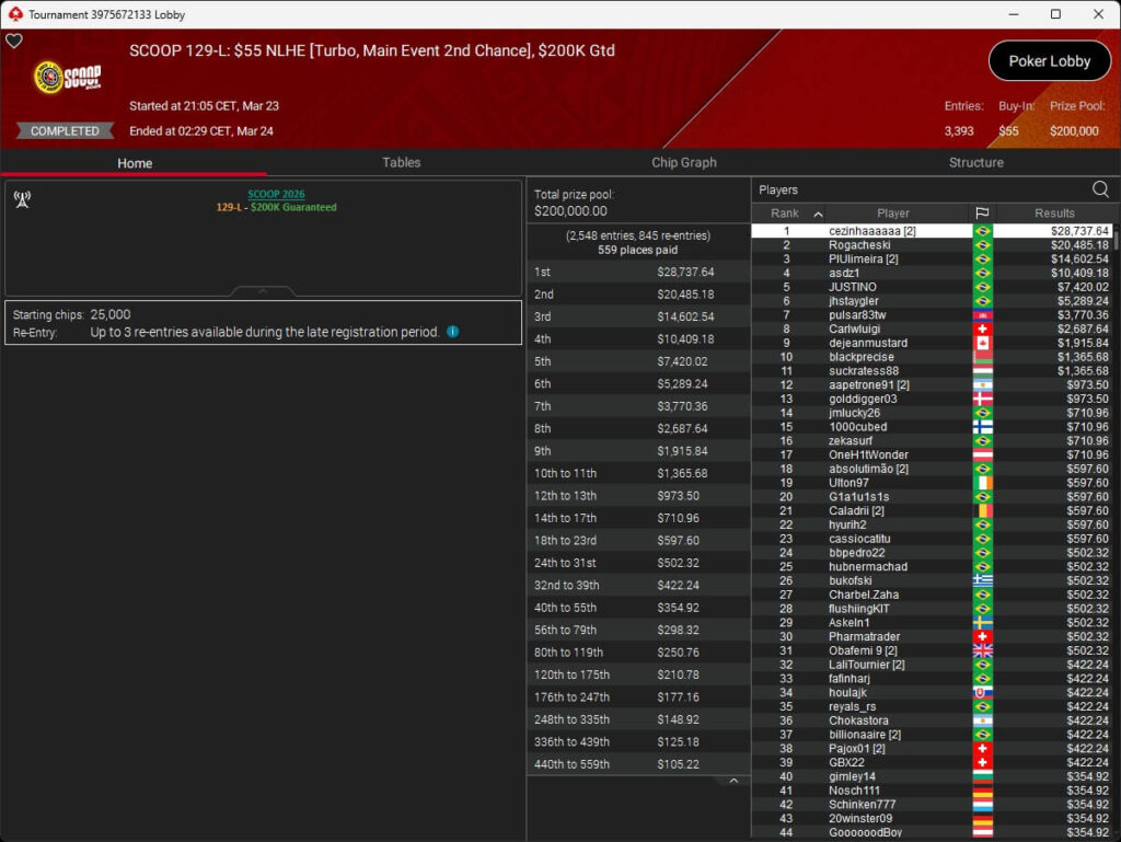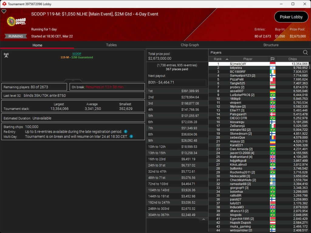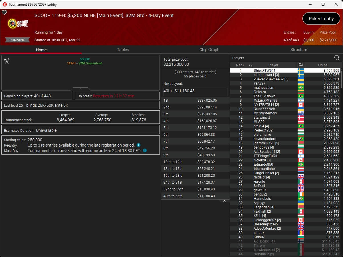 Erst am Samstag verbuchte Patrick Leonard zwei Titel auf PokerStars und schraubte seine Bilanz auf insgesamt 15 SCOOP-Siege. Mit dem Titel im $530 Sunday Warm-Up baute der Brite diesen Rekord nun aus. Dazu kommen weitere 13 WCOOP-Titel, sodass der Grinder nun auf insgesamt 29 COOP-Siege kommt.