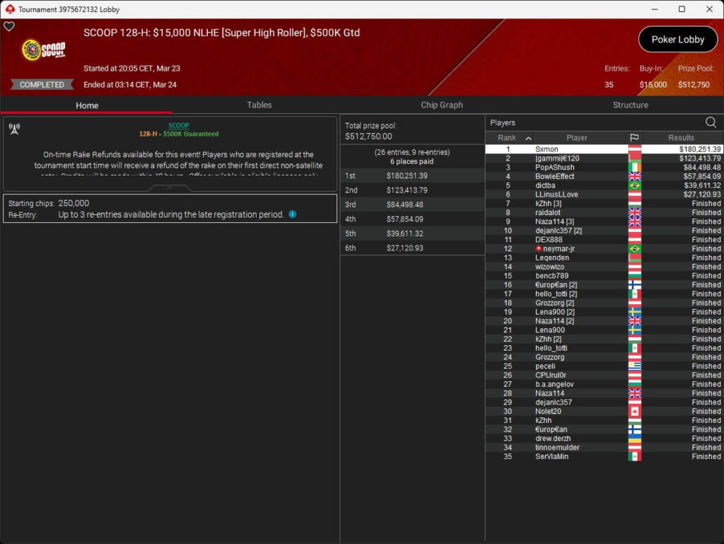 Patrick „pads1161“ Leonard hat bei der PokerStars Spring Championship of Online Poker 2026 den nächsten Sieg geholt. Sxmon aus Österreich sicherte sich den Titel im Super High Roller.