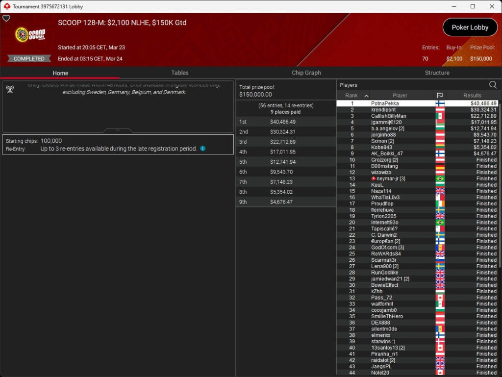 Die deutschsprachige Poker-Community ist ebenfalls weiterhin erfolgreich. Im $530 NLHE PKO setzte sich sk2ll_m0dR ($25.428,91 + $31.070,24) gegen Piranha_n1 (2./$25.428,44 + $6.837,88) und RicoMinibAby (3./$15.812,06 + $4.490,23) durch. Knapp an Gold vorbeigeschrammt sind unter anderem krendipont (2./$30.324,31; $2.100 NLHE) sowie Pharmatrader (3./$22.600; $1.050).