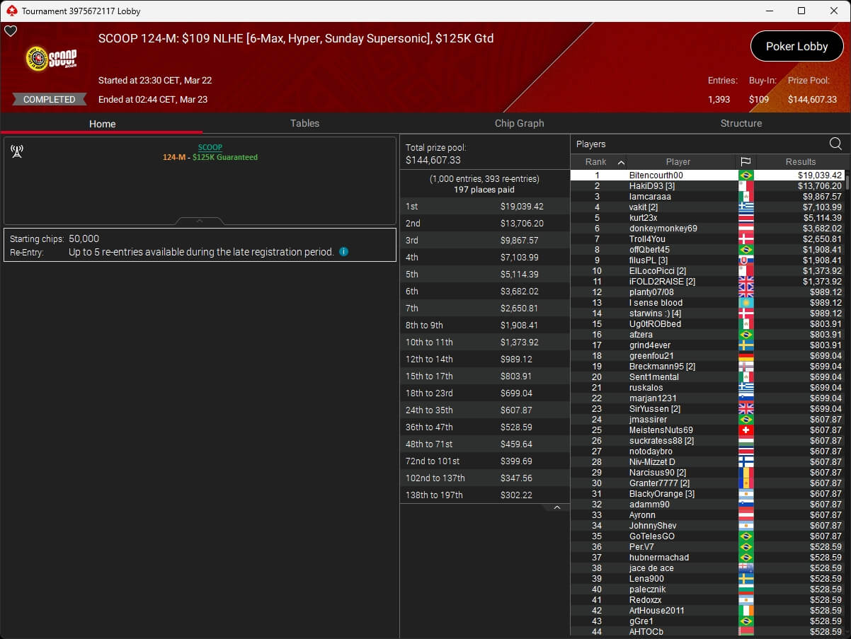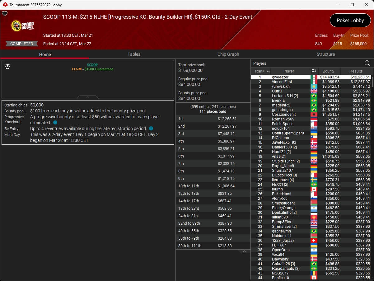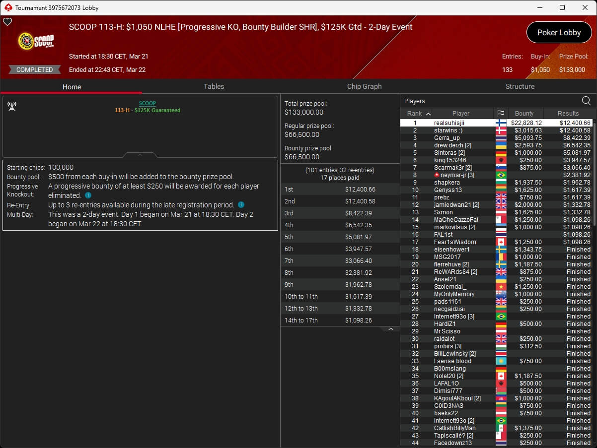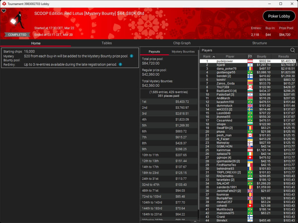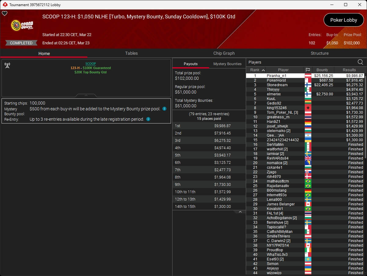 Die DACH-Gemeinde bleibt bei der SCOOP 2026 auf PokerStars weiterhin erfolgreich. Am Sonntag setzte sich Piranha_n1 ($9.986,87 + $25.156,25) im $1.050 Sunday Cooldown durch. Bei den Side Events spielten pudelpower ($5.403,72 + $602,94; $44 Red Lotus) und ShoveShuva ($6.467,76 + $6.190,59; $215 Sunday StacKOsaurus) Turniersiege ein.