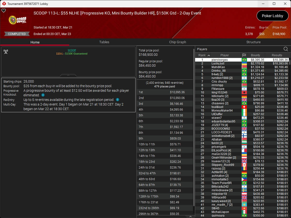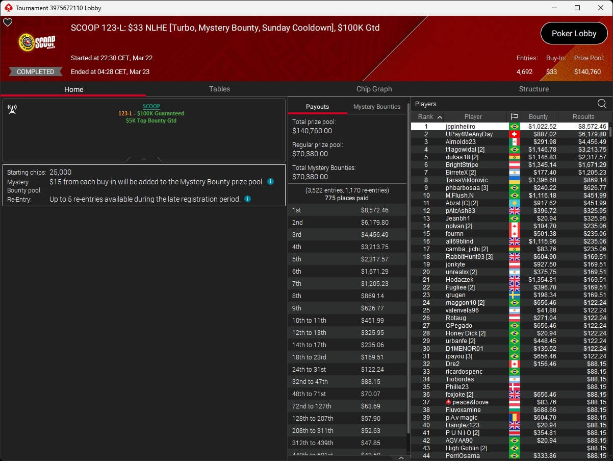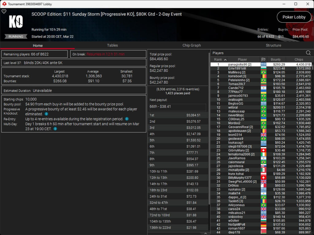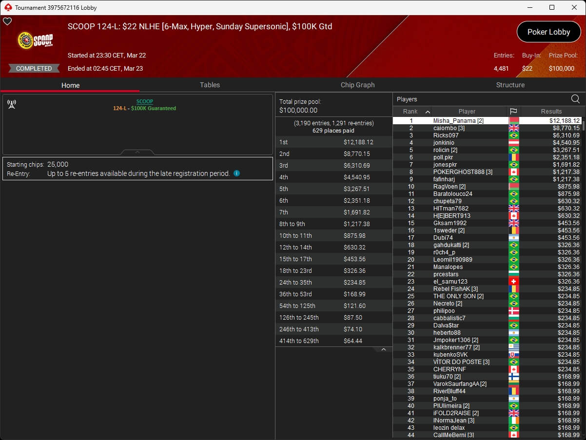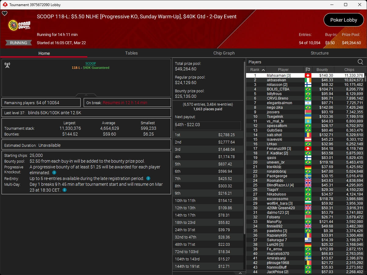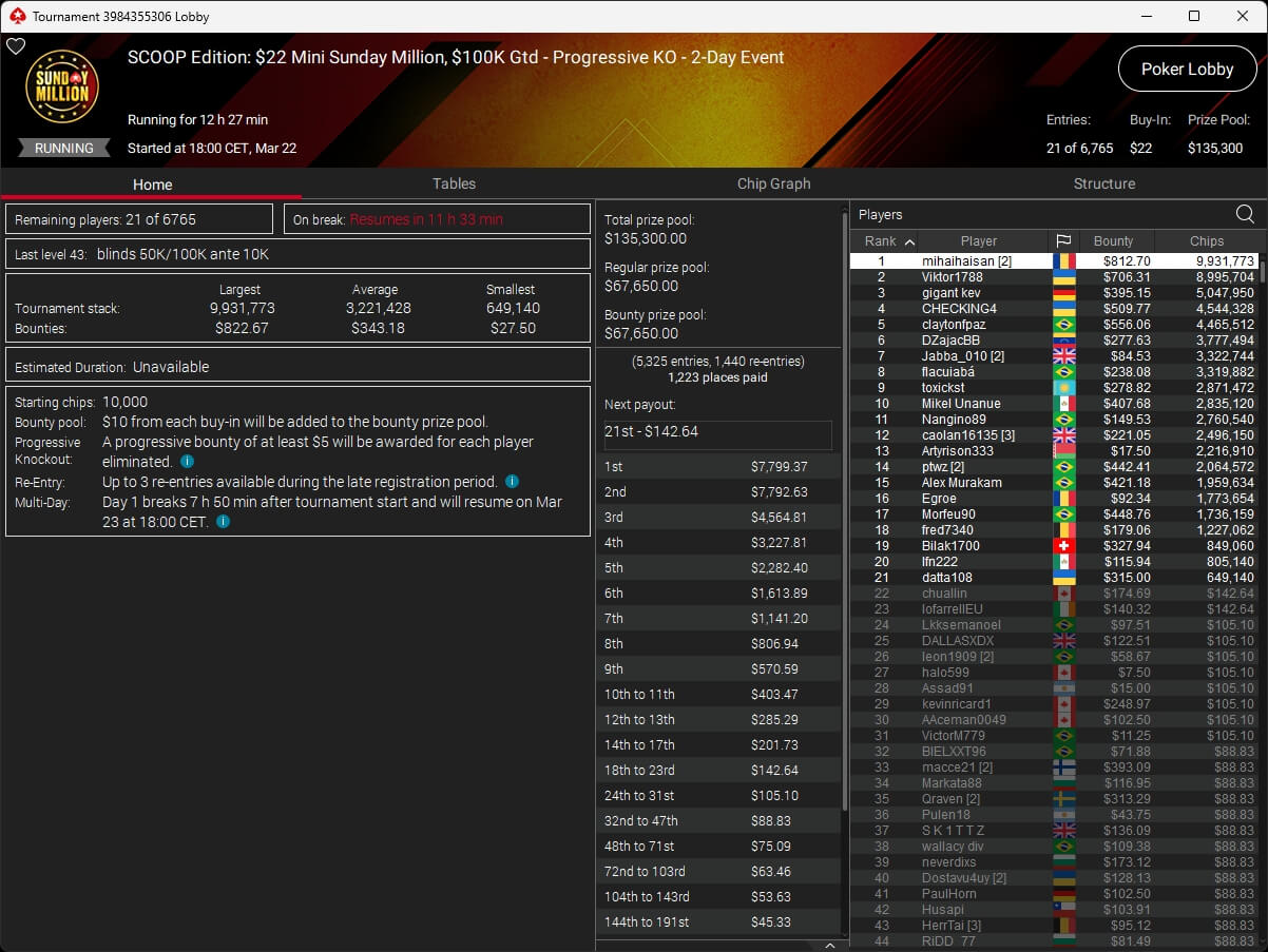 Die DACH-Gemeinde bleibt bei der SCOOP 2026 auf PokerStars weiterhin erfolgreich. Am Sonntag setzte sich Piranha_n1 ($9.986,87 + $25.156,25) im $1.050 Sunday Cooldown durch. Bei den Side Events spielten pudelpower ($5.403,72 + $602,94; $44 Red Lotus) und ShoveShuva ($6.467,76 + $6.190,59; $215 Sunday StacKOsaurus) Turniersiege ein.