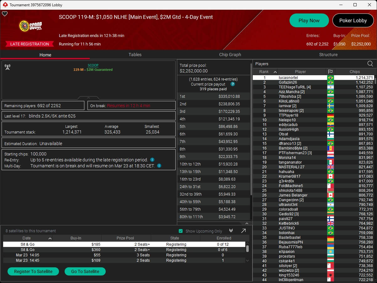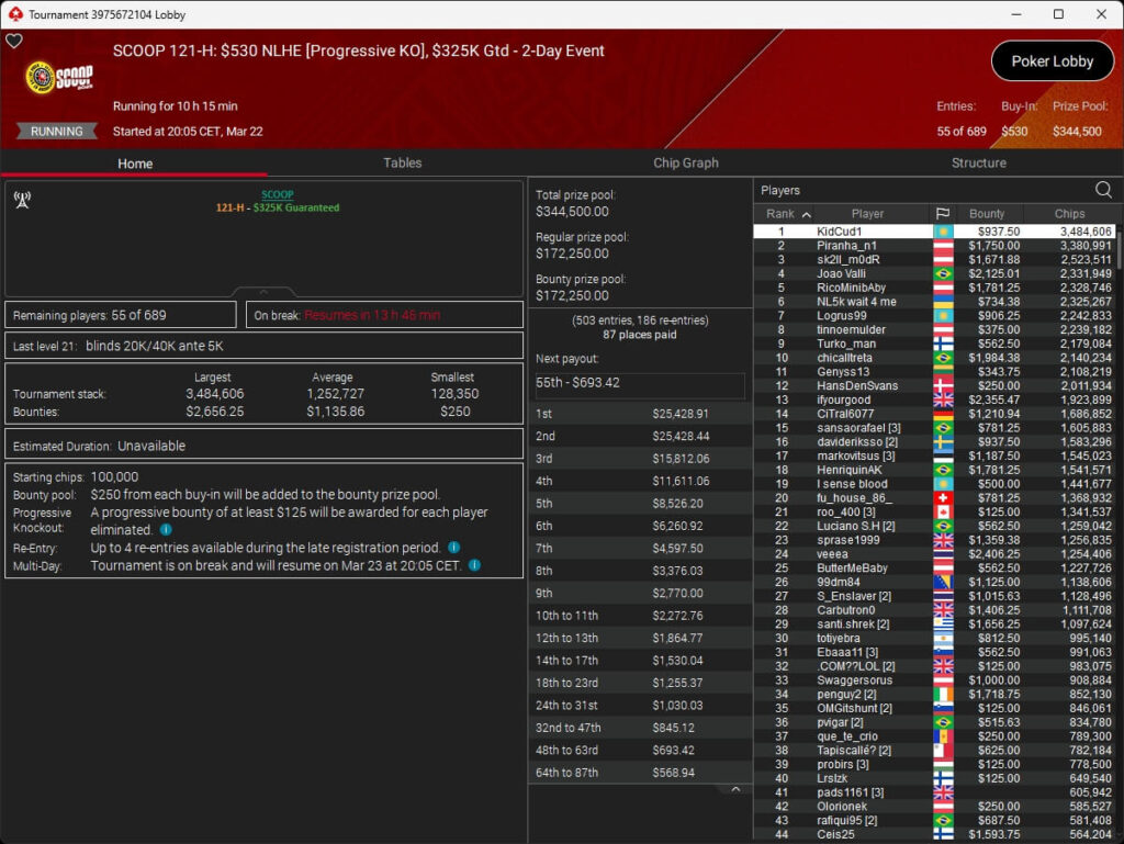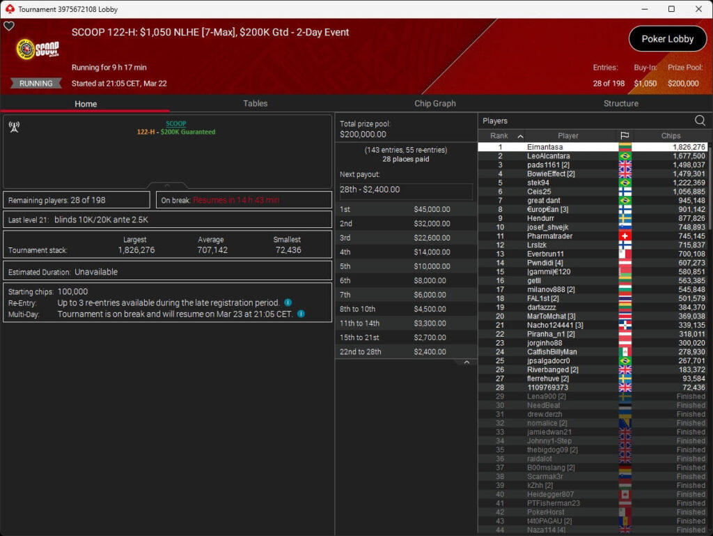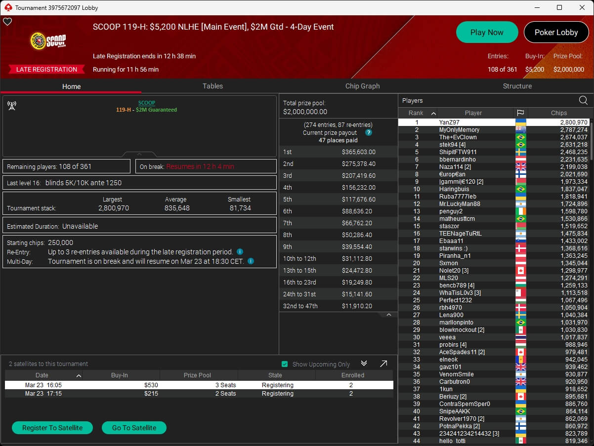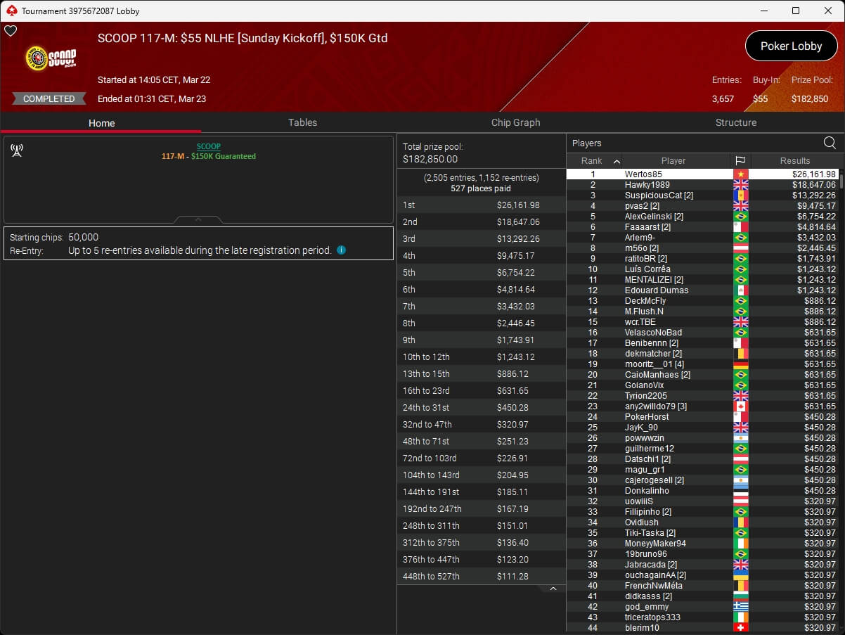 Die SCOOP 2026 neigt sich dem Ende zu. Gestern startete das Main Event. Alle drei Turniere sind auf vier Tage angesetzt und die Anmeldung ist noch möglich. Im $1.050 Main Event wurde die Garantie bereits geknackt. Aktuell liegen $2,25 Millionen in der Mitte.