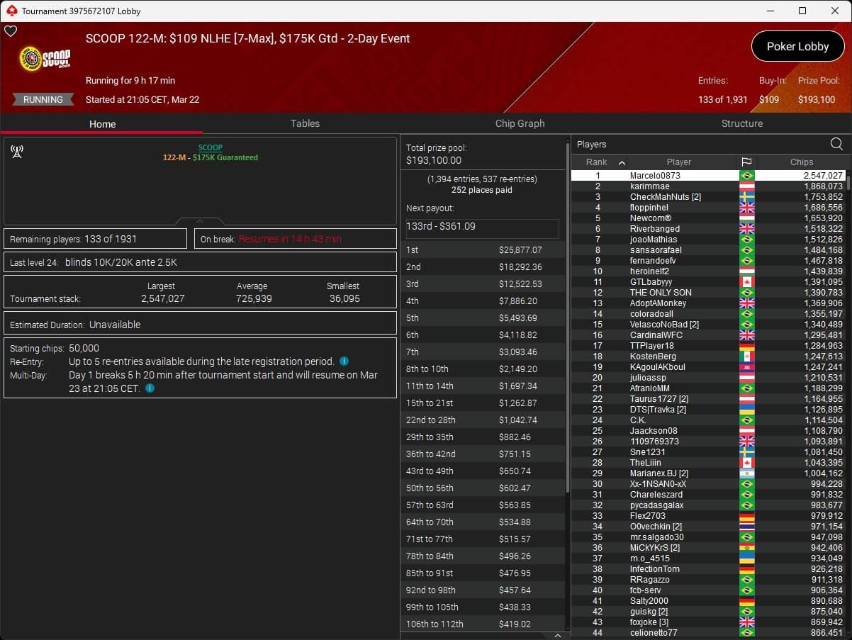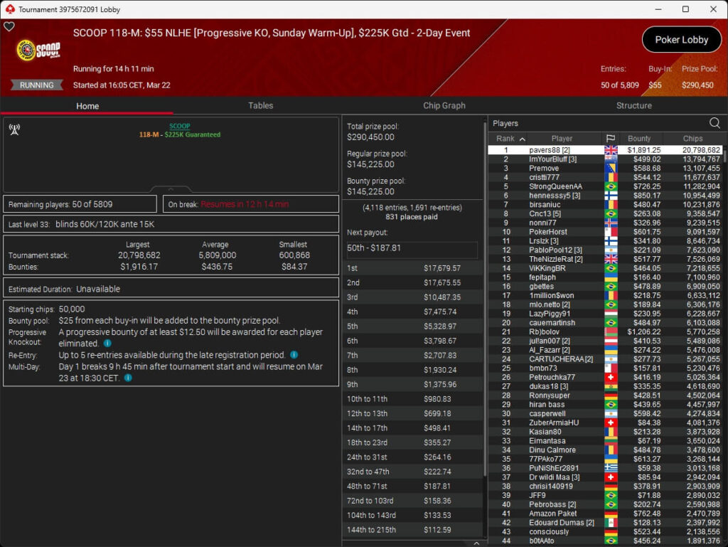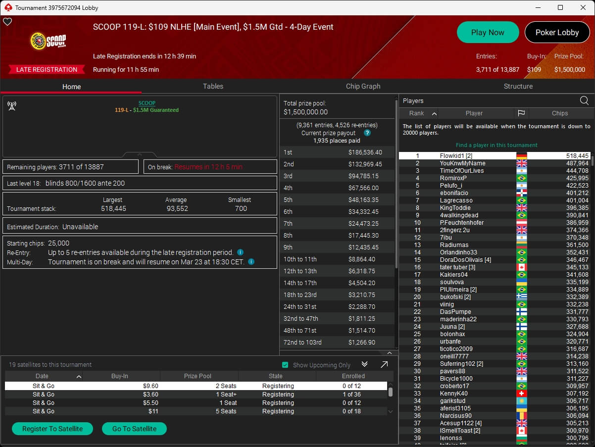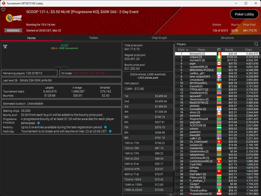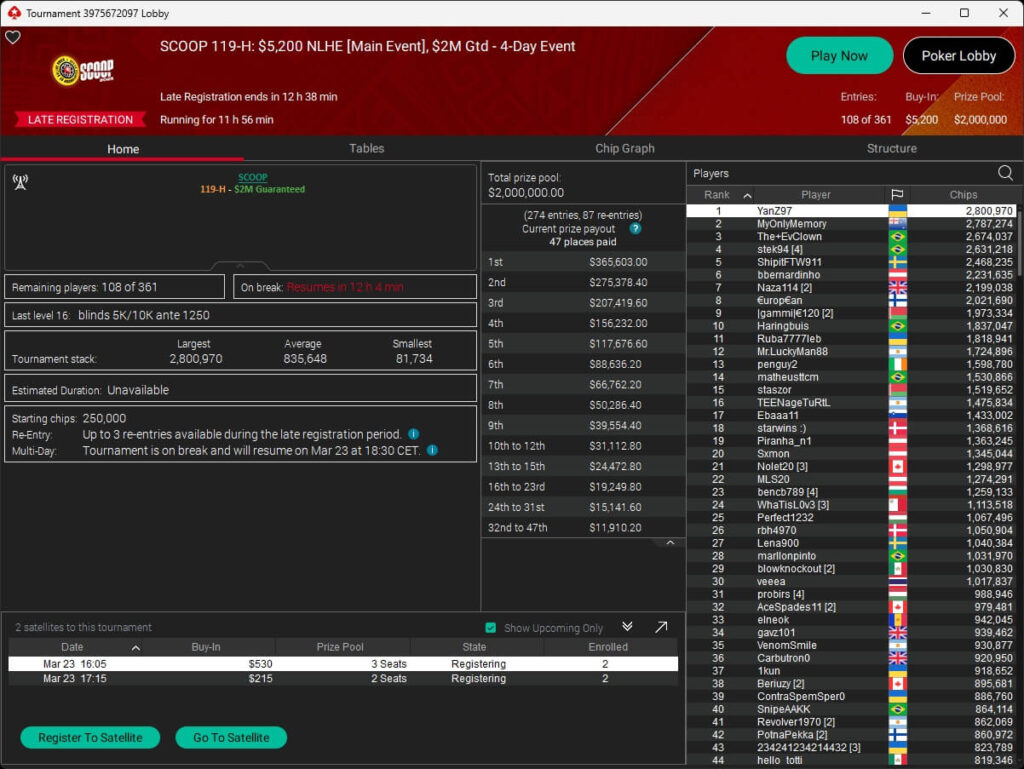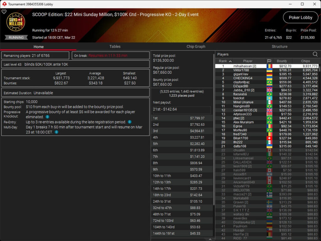 Die SCOOP 2026 neigt sich dem Ende zu. Gestern startete das Main Event. Alle drei Turniere sind auf vier Tage angesetzt und die Anmeldung ist noch möglich. Im $1.050 Main Event wurde die Garantie bereits geknackt. Aktuell liegen $2,25 Millionen in der Mitte.
