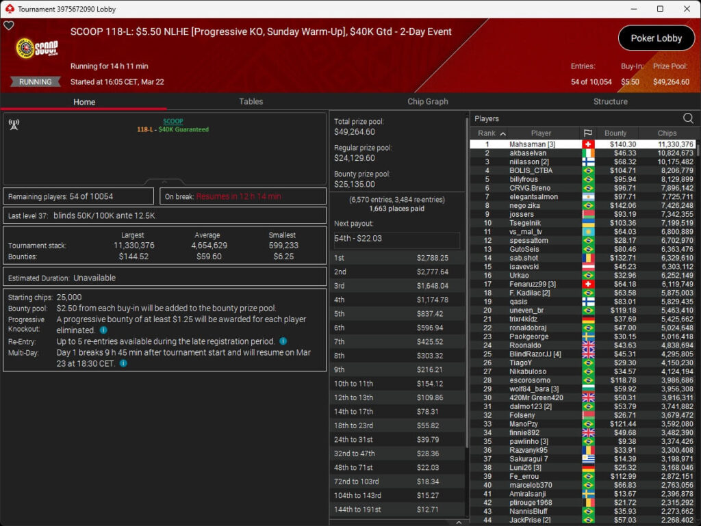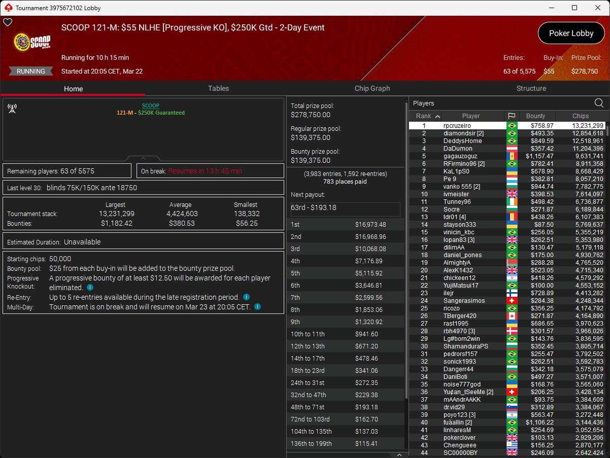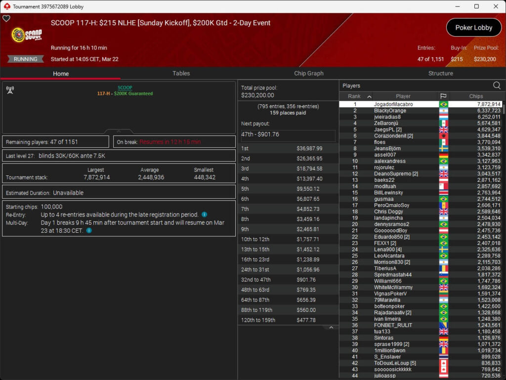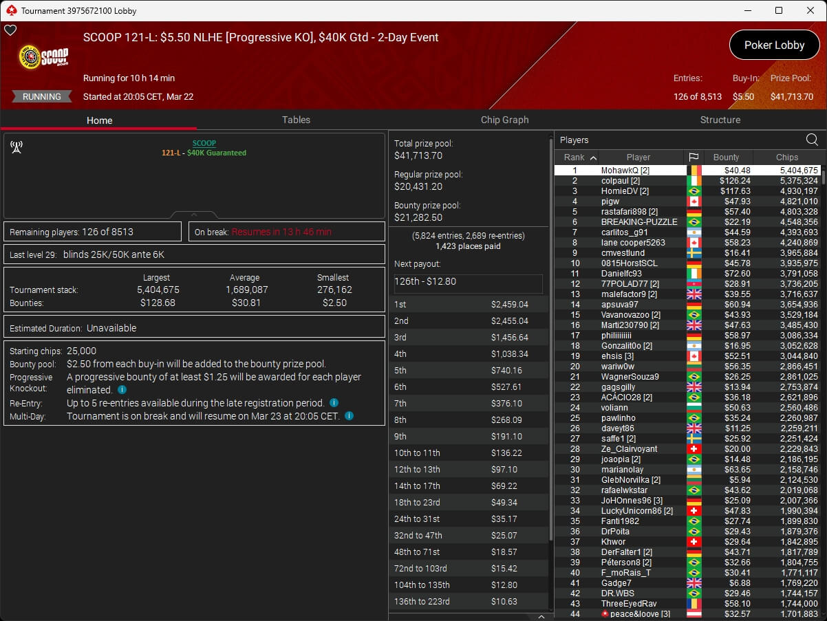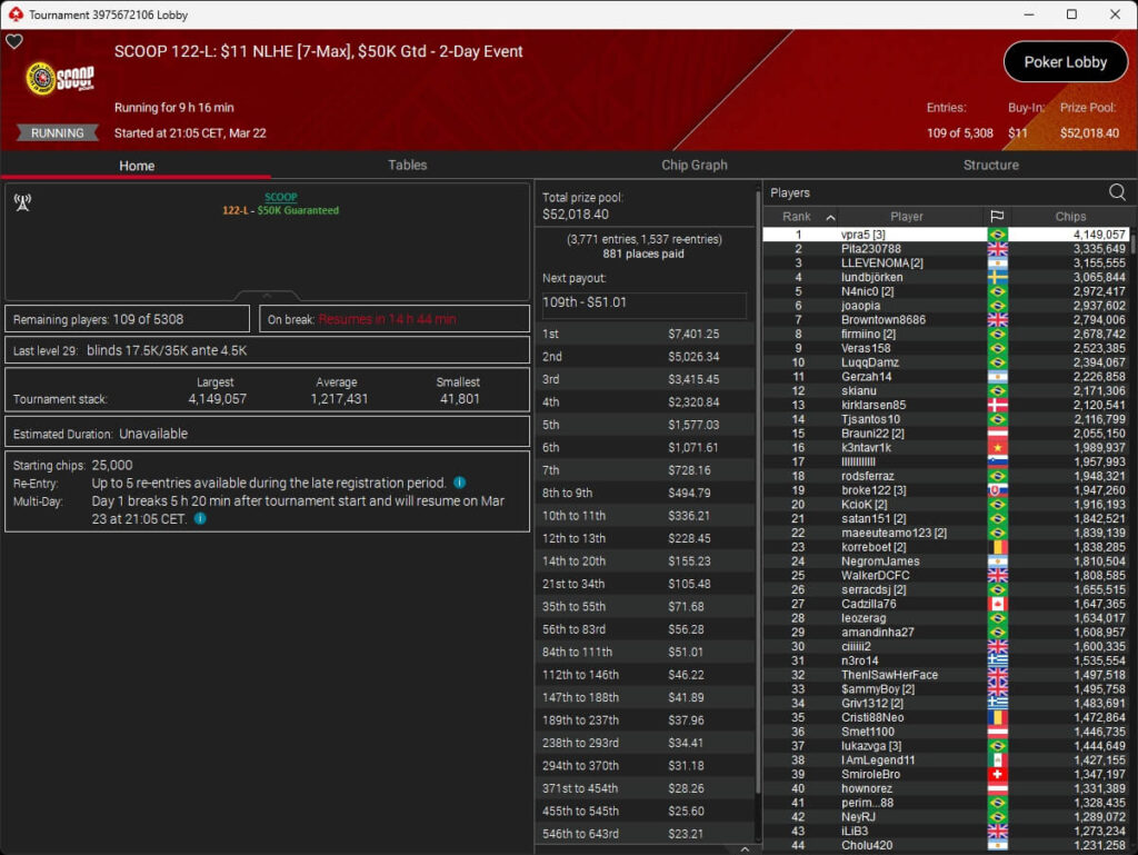 Die SCOOP 2026 neigt sich dem Ende zu. Gestern startete das Main Event. Alle drei Turniere sind auf vier Tage angesetzt und die Anmeldung ist noch möglich. Im $1.050 Main Event wurde die Garantie bereits geknackt. Aktuell liegen $2,25 Millionen in der Mitte.