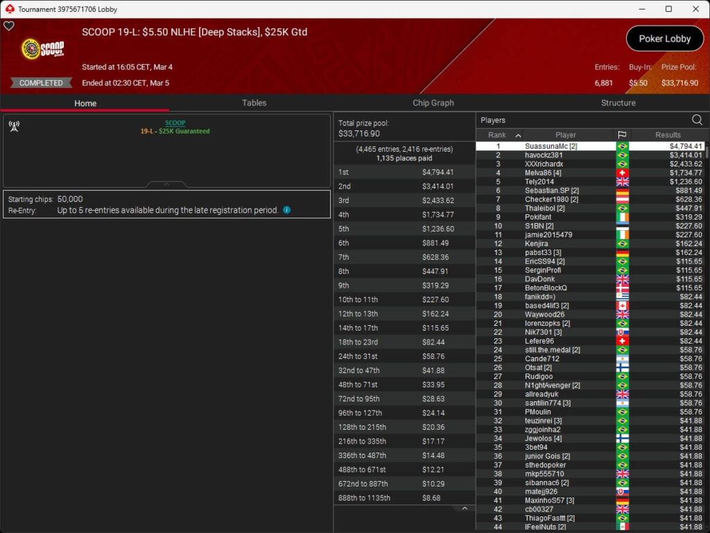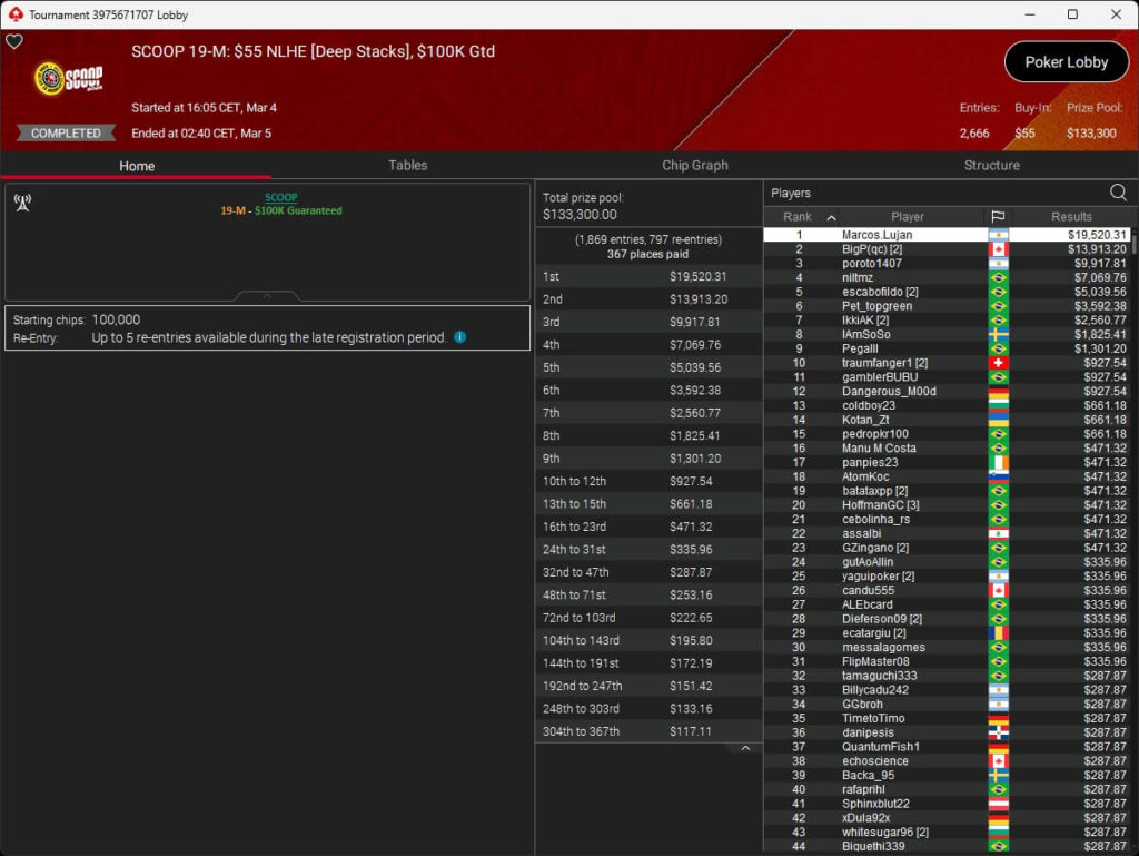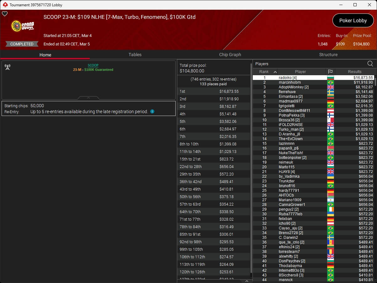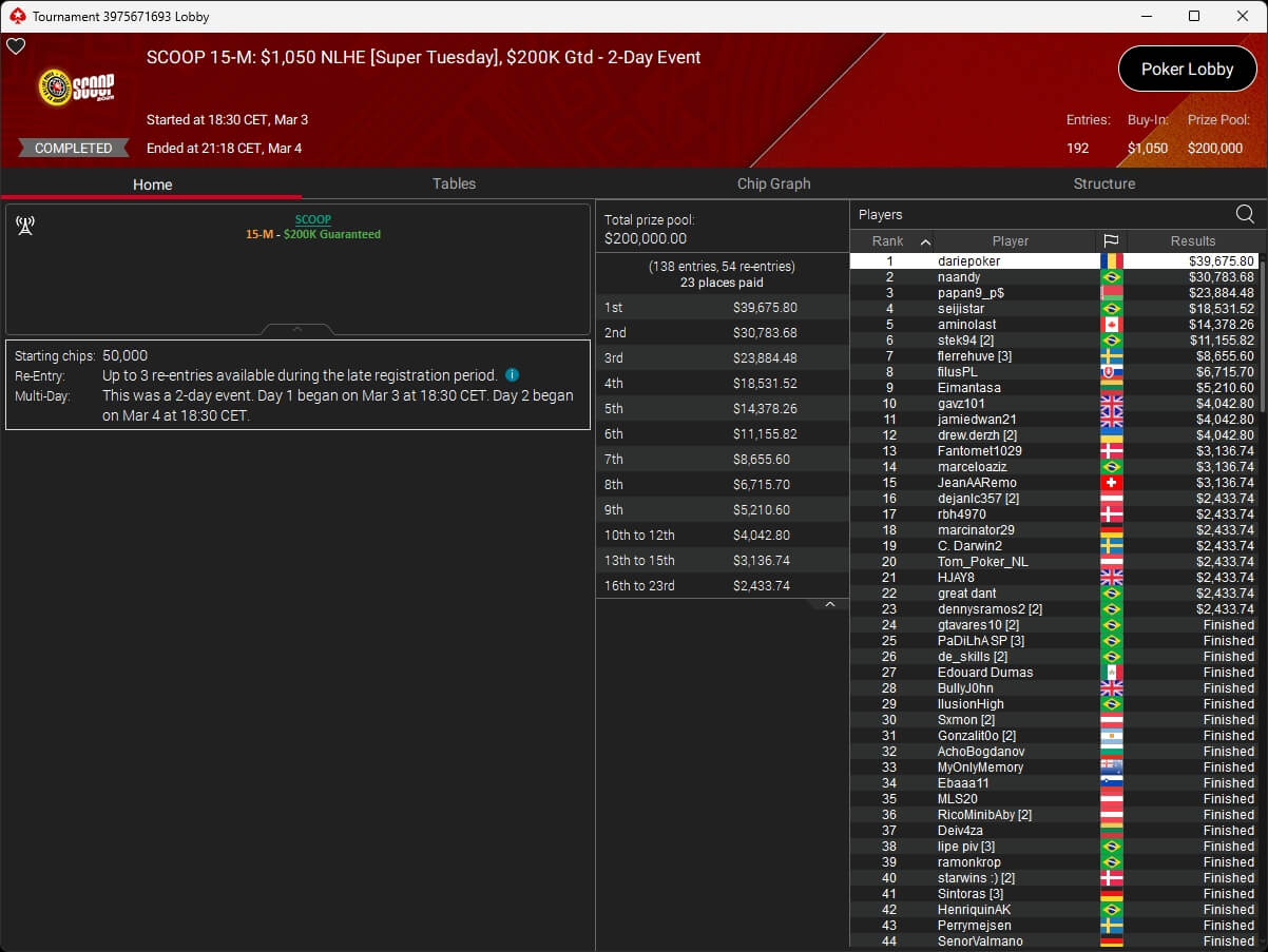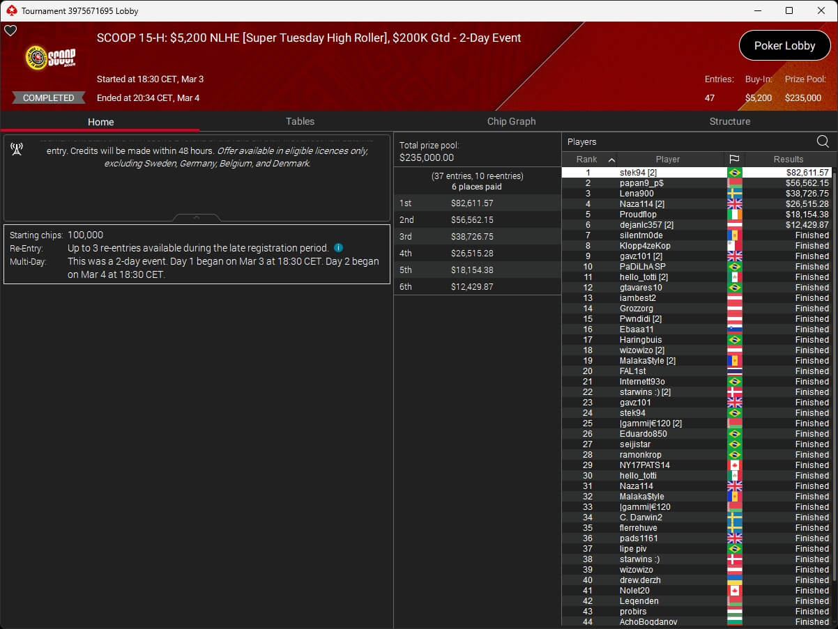 Iago „stek94“ Botelho hat das $5k Super Tuesday Event der PokerStars Spring Championship of Online Poker 2026 gewonnen. Sintoras spielte ebenfalls einen Titel ein.