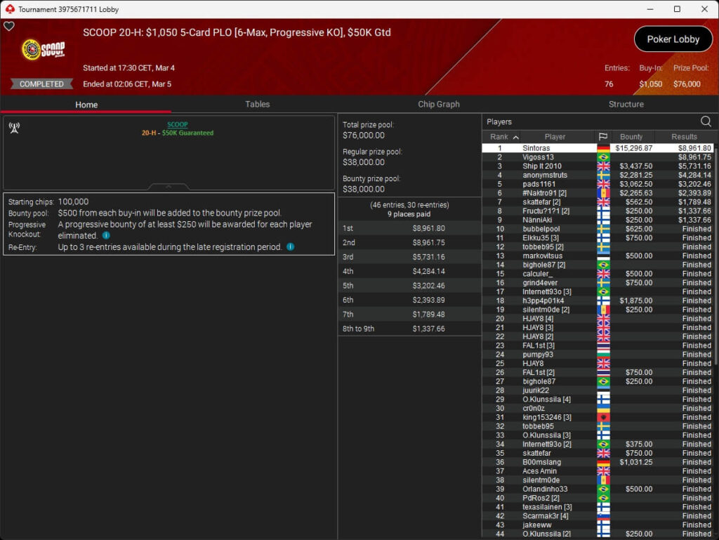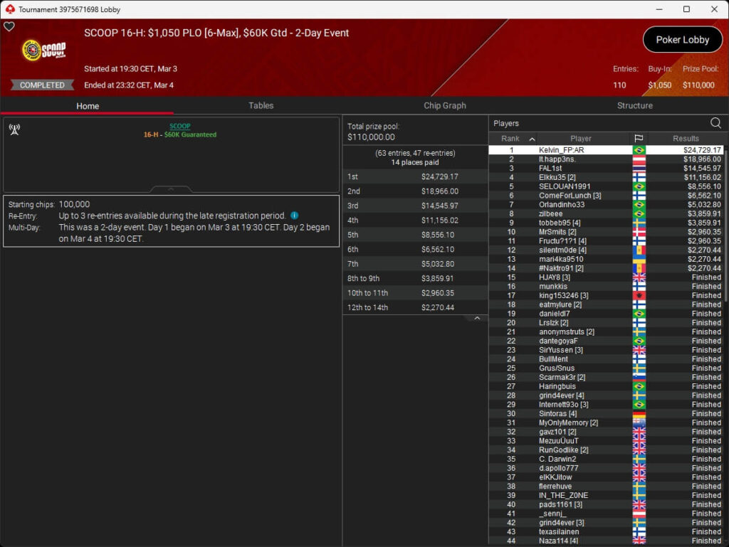 Im $1.050 PLO 6-Max setzte sich Poker-Pro Kelvin „Kelvin_FP:AR“ Kerber ($24.729,17) gegen It.happ3ns. (2./$18.966) aus Österreich durch. Gold gab es für die DACH-Gemeinde im $1.050 5-Card PLO 6-Max PKO. Dort setzte sich Sintoras ($8.961,80 + $15.296,87) aus Deutschland durch.