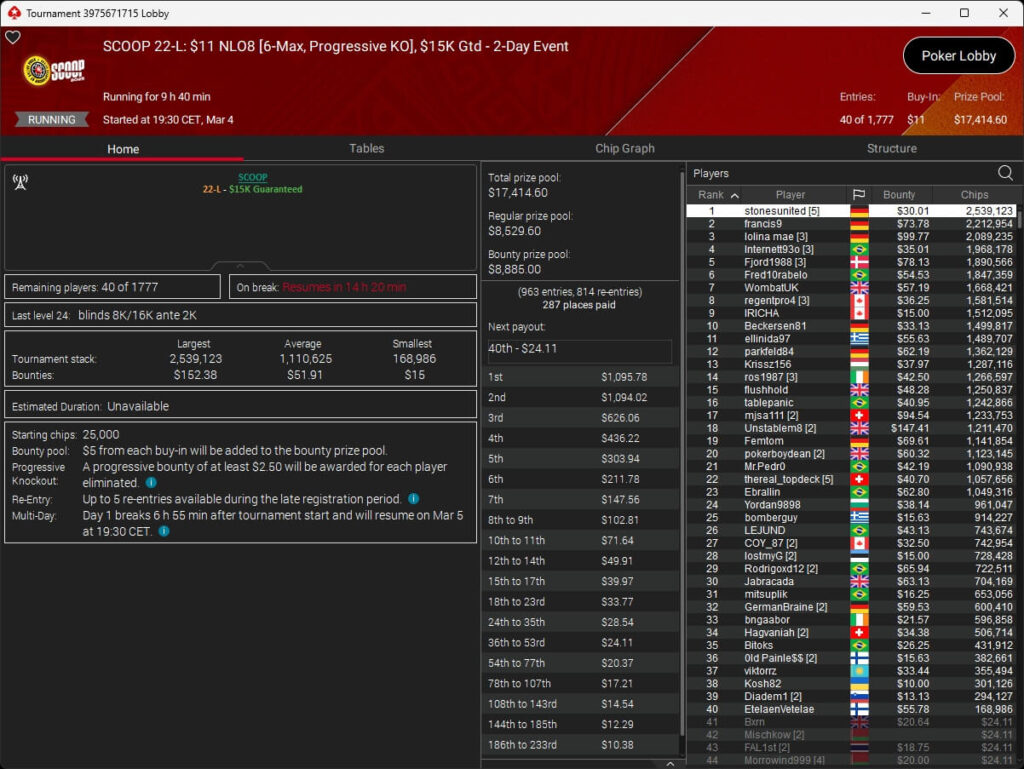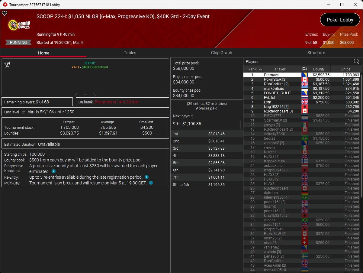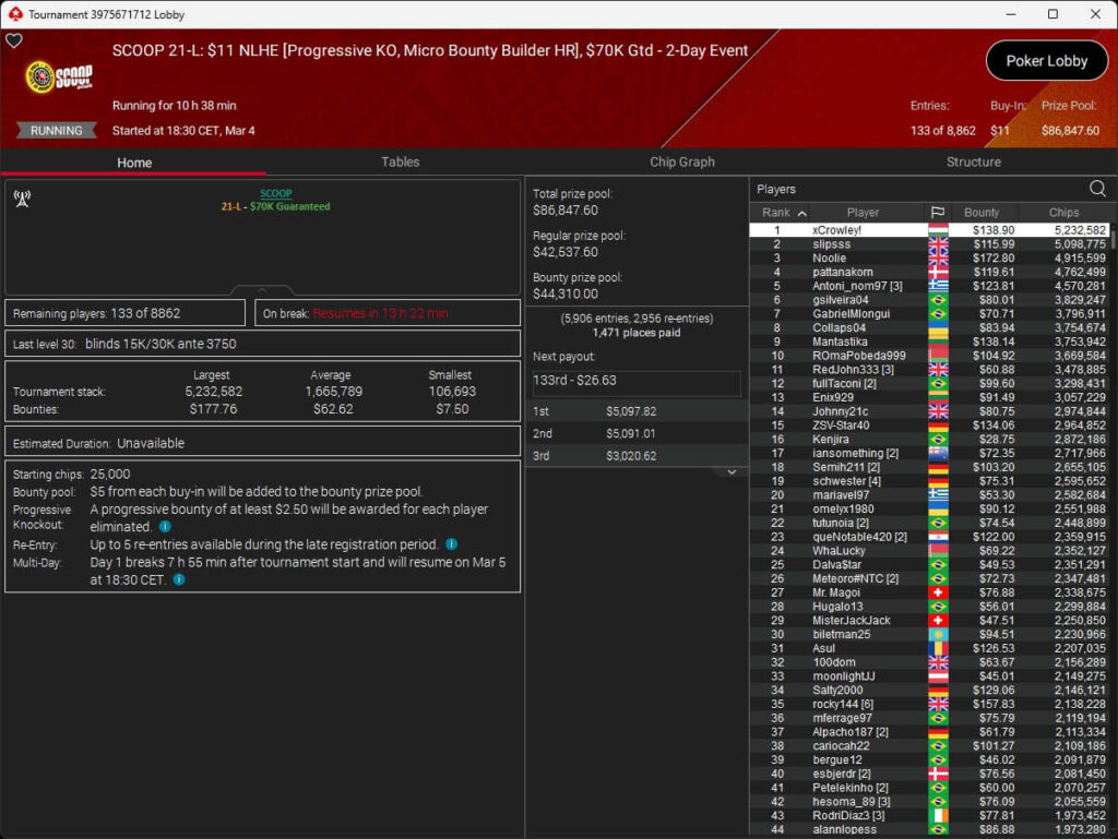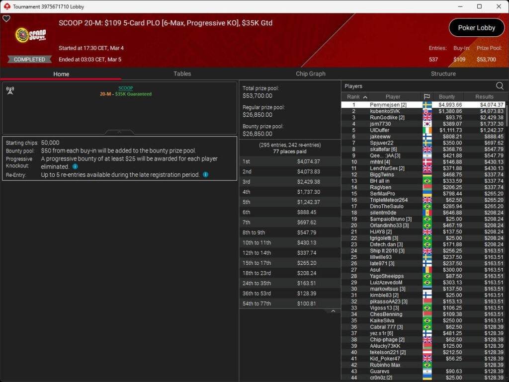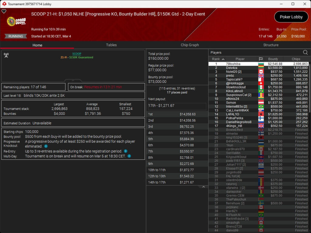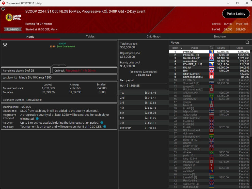 Der vierte Tag der SCOOP 2026 auf PokerStars brachte das Finale im $5.200 Super Tuesday High Roller. Pavel „silentm0de“ Plesuv war der Bubble Boy, die $235.000 an Preisgeldern verteilten sich auf sechs Plätze.