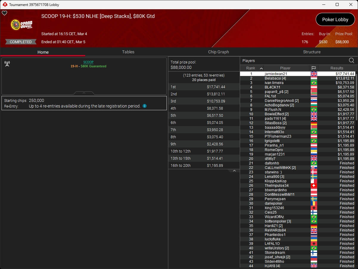 Der Sieg ging an den Brasilianer Iago Botelho ($82.611,57), Runner-Up wurde Viktor „papan9_p$“ Ustimov ($56.562,15). Niklas „Lena900“ Åstedt (3./$38.726,75), João „Naza114“ Vieira (4./$26.515,28), Jonathan „proudflop“ Proudfoot (5./$18.154,38) und Dejan „dejanlc357“ Kaladjurdjevic (6./$12.429,87) sicherten sich ebenfalls einen Cash.