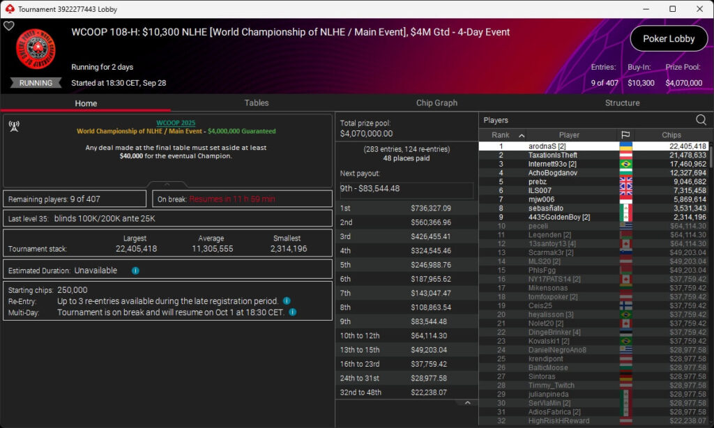 Heute wird das NLH Main Event entschieden. Im $109 Main Event erwischte es mit Slaaasch ($5.139,33) den letzten DACH-Spieler auf Rang 15. Im $1k Main Event führt Konstantin „kobyy“ Held die Finalisten an, dort warten $487.131 auf den Sieger. Im $10k Main Event sind $736.327 auf den Sieg ausgeschrieben.