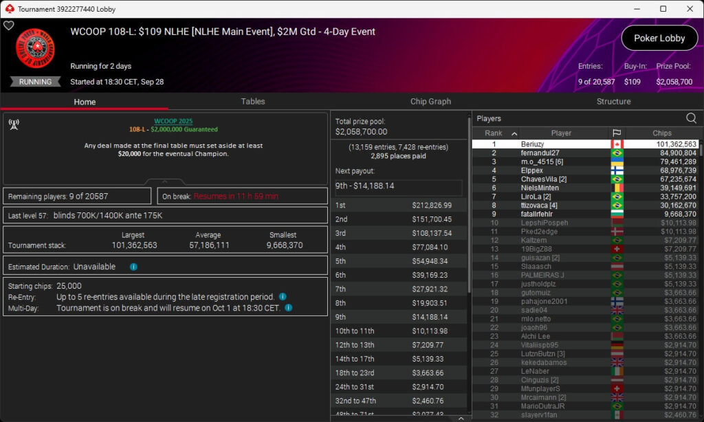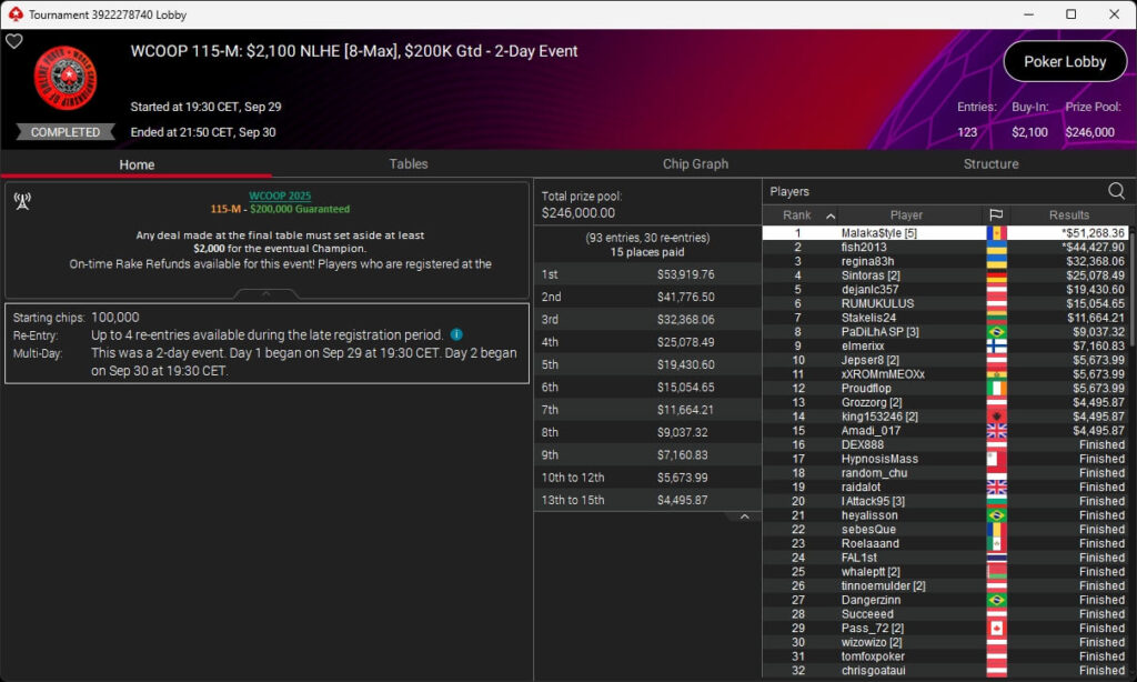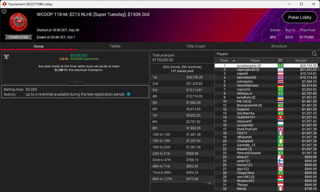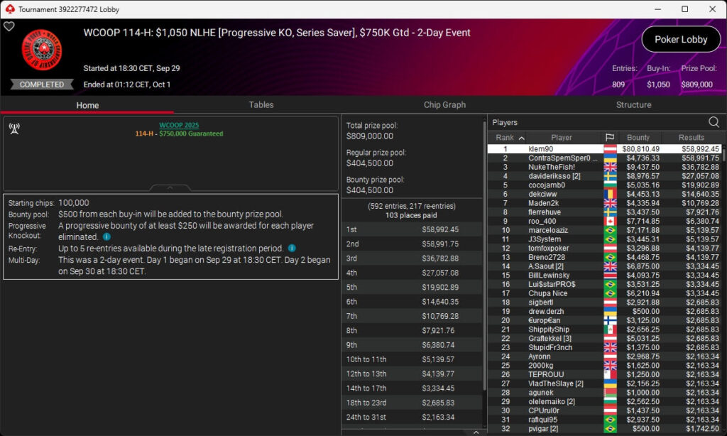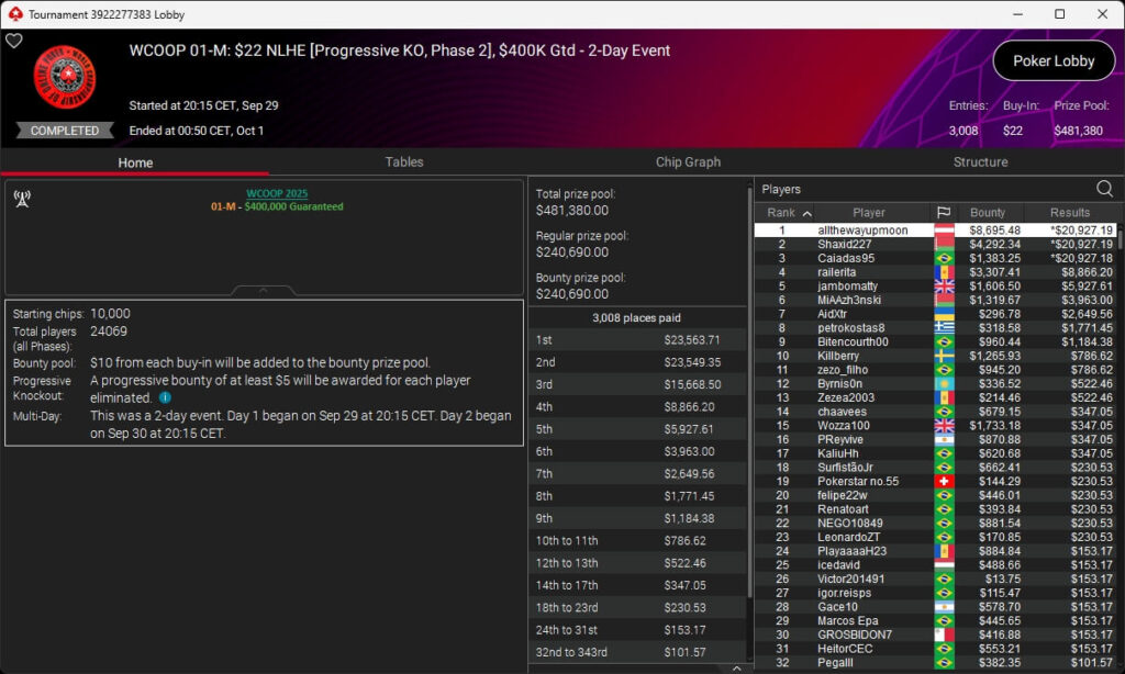 allthewayupmoon hat bei der PokerStars World Championship of Online Poker 2025 einen Sieg geholt.0ULIP0 und DEX888 holten ebenfalls WCOOP-Gold. Konstantin Held führt im $1k Main Event.