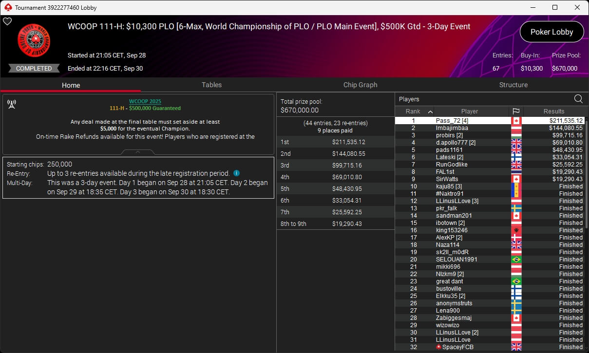 Im $10k PLO Main Event ging der Sieg an den Kanadier Pascal „Pass_72“ Lefrançois ($211.535,12). Martin „Imbajimbaa“ Dam (2./$144.080,55) und Andras „probirs“ Nemeth (3./$99.715,16) standen auf dem Treppchen.