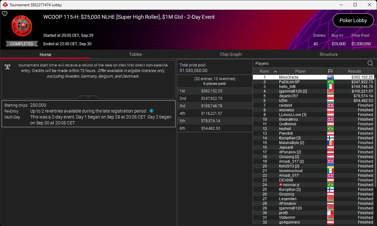 Das teuerste Turnier war das $25.000 Super High Roller. Dort machten David „MissOracle“ Yan ($362.102,25), Pedro „PaDiLhA SP“ Padilha (2./$247.922,73) und Arsenii „hello_totti“ Malinov (3./$169.746,78) den Sieg unter sich aus. Dejan Kaladjurdjevic ($79.574,14) belegte Rang 5.