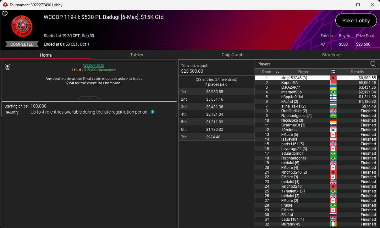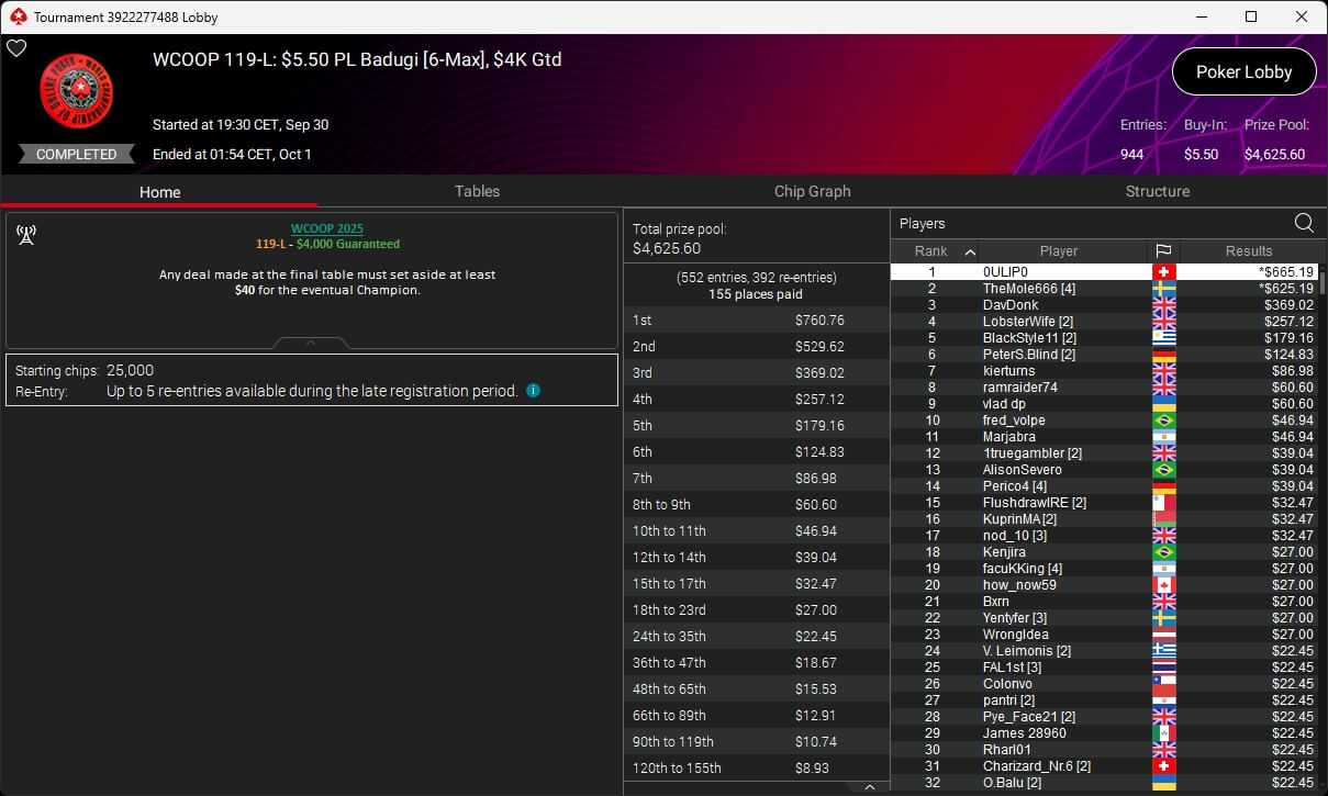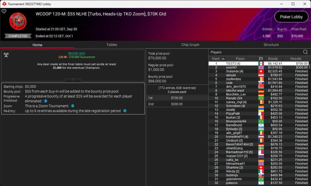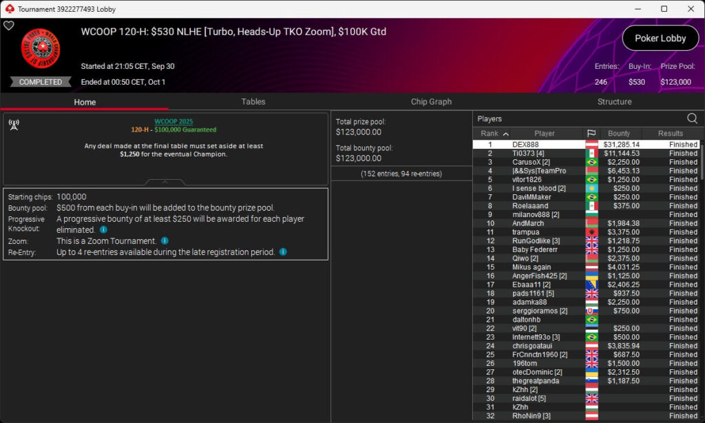 Dicke Cashes und viermal Gold. Die deutschsprachige Poker-Community verbuchte bei der WCOOP 2025 auf PokerStars einen erfolgreichen Tag. DEX888 ($31.285,14; $530 Heads-Up Total PKO Zoom), allthewayupmoon ($20.927,19 + $8.695,48; $22 NLHE PKO Phase) und 0ULIP0 ($665,19; $5,50 PL Badugi) spielten ebenfalls Titel ein.