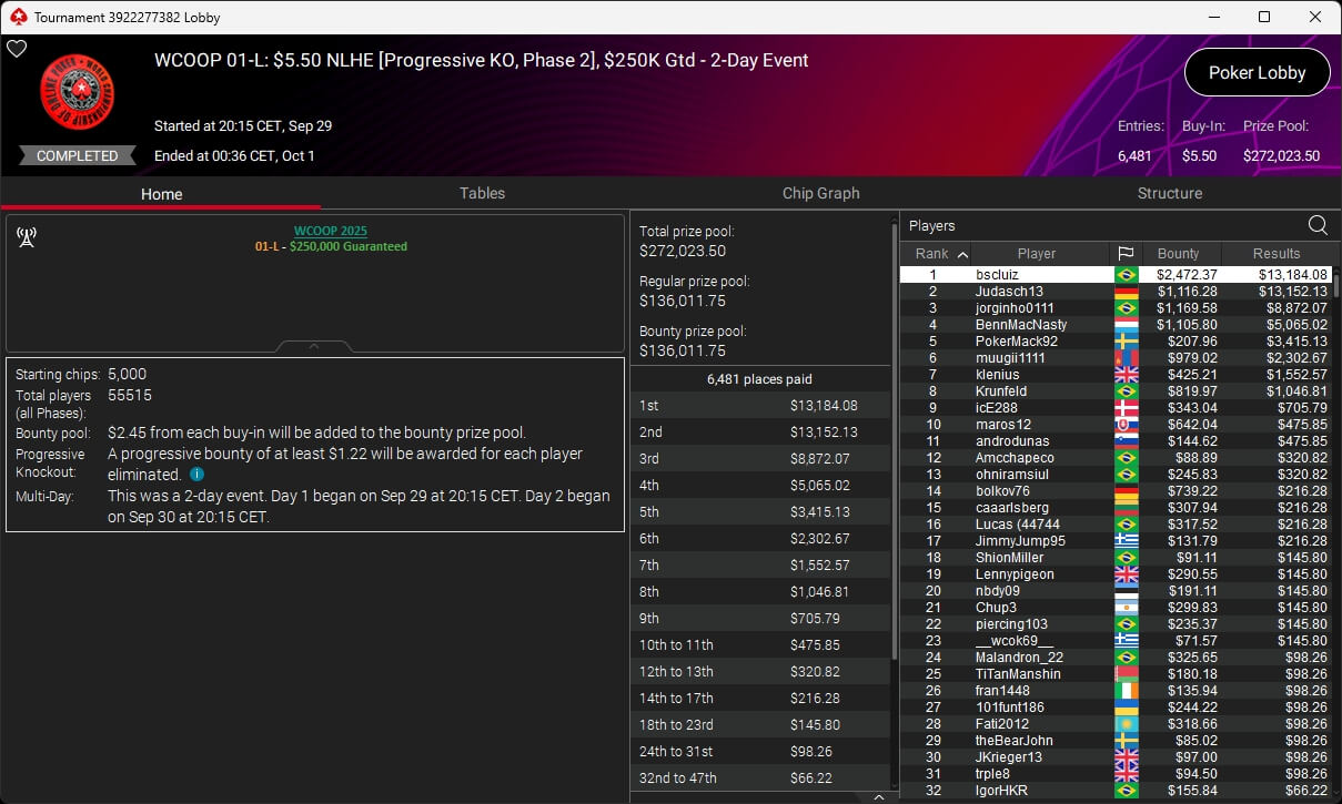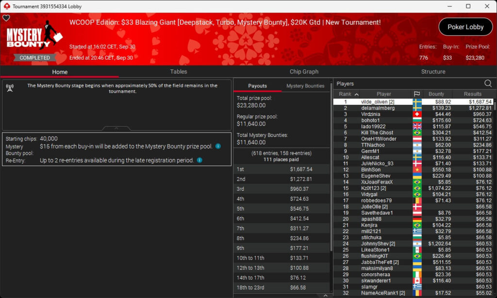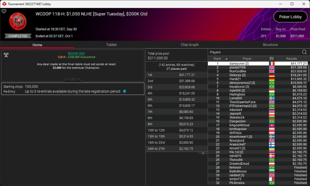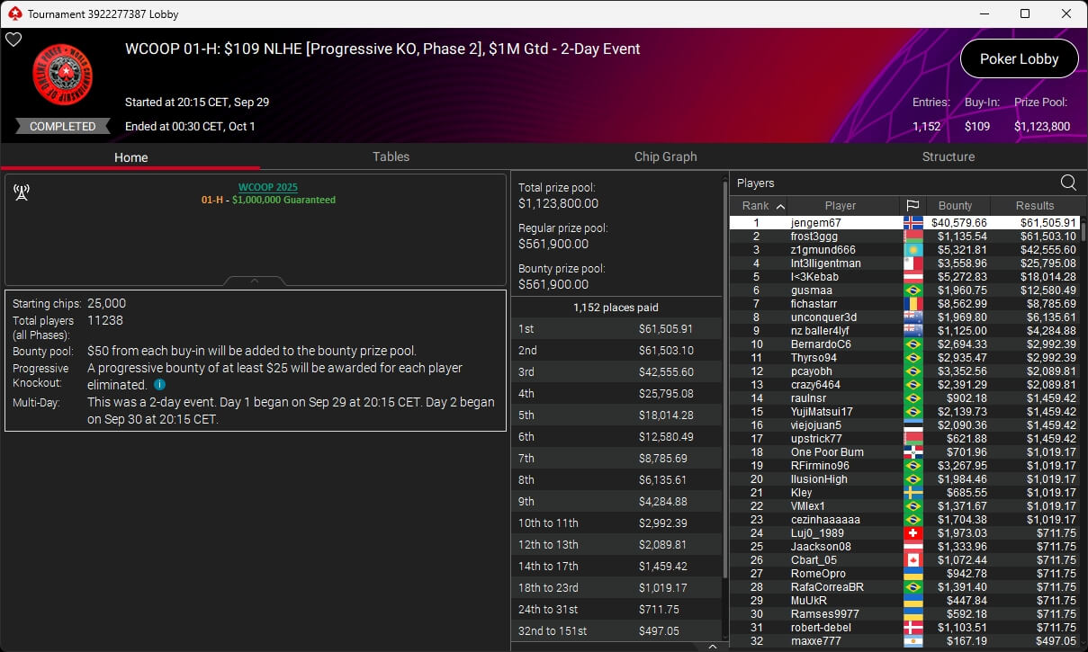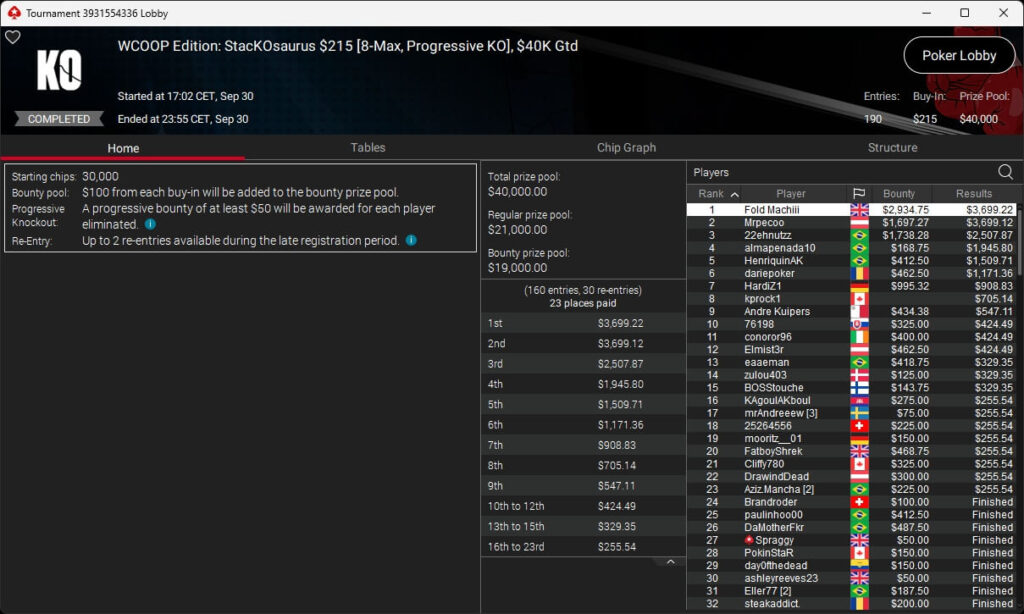 Dicke Cashes und viermal Gold. Die deutschsprachige Poker-Community verbuchte bei der WCOOP 2025 auf PokerStars einen erfolgreichen Tag. DEX888 ($31.285,14; $530 Heads-Up Total PKO Zoom), allthewayupmoon ($20.927,19 + $8.695,48; $22 NLHE PKO Phase) und 0ULIP0 ($665,19; $5,50 PL Badugi) spielten ebenfalls Titel ein.