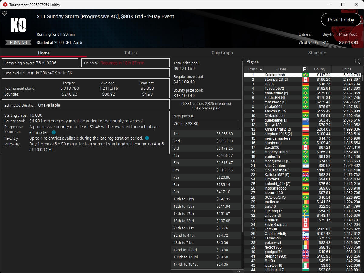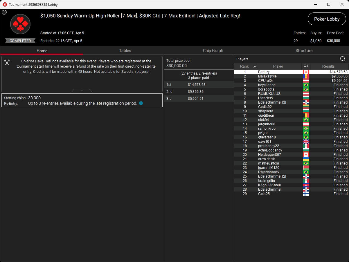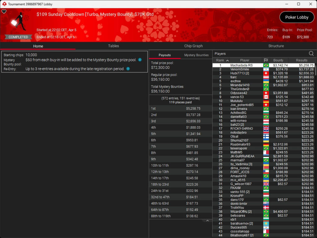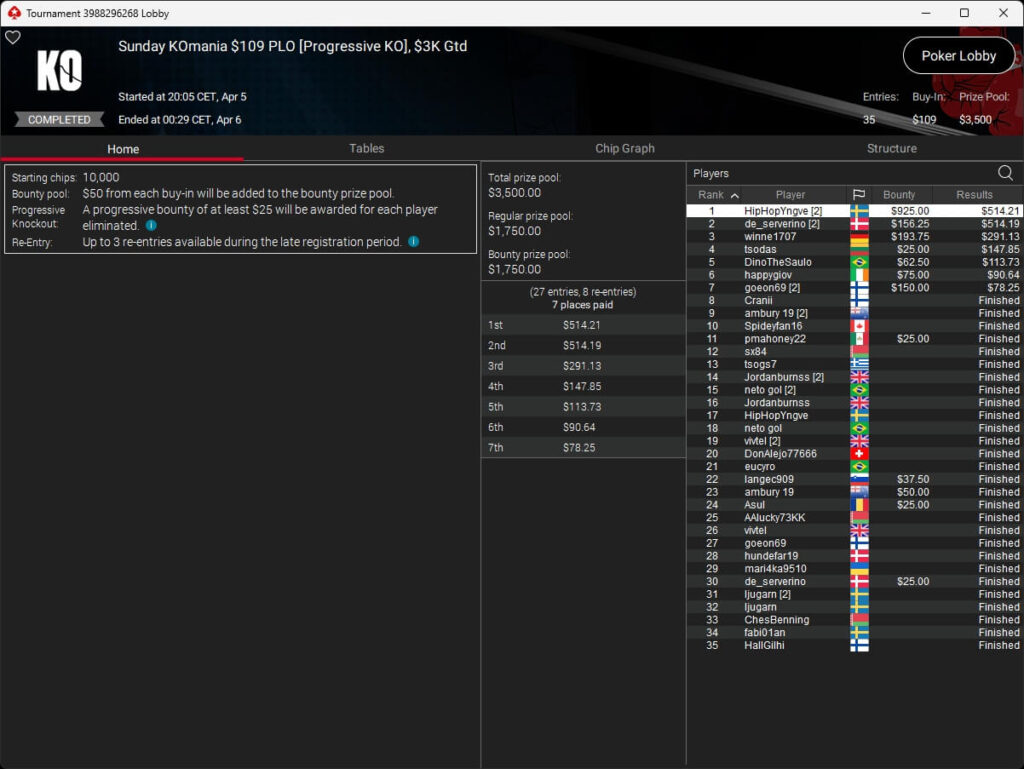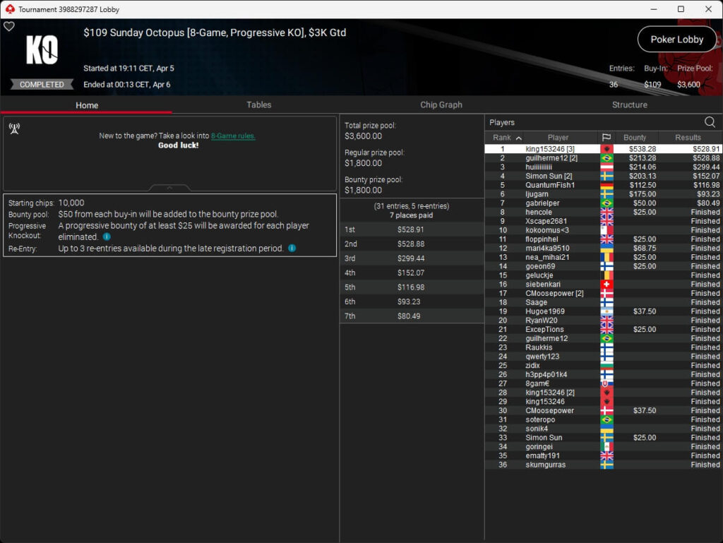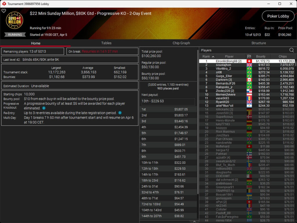 Im $109 Sunday Special trugen 3.737 Teilnehmer insgesamt $487.500 zusammen. 61 Spieler werden heute zu Day 2 zurückkehren. Ebenfalls auf zwei Tage angesetzt ist das $22 Mini Sunday Million. Dort führt ElronMcBong88 aus der Schweiz ein Feld von 13 Teilnehmern an.