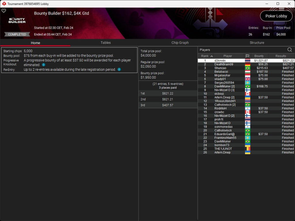 Den Sieg sicherte sich am Ende Solmir206 ($24.768,30 + $15.674,98) aus der Ukraine. Alexandre „aalexandress“ Souza ($24.763,93 + $2.312,06) wurde Runner-Up, sein Landsmann Fabuloson ($14.693,05 + $3.118,72) belegte Rang 3.