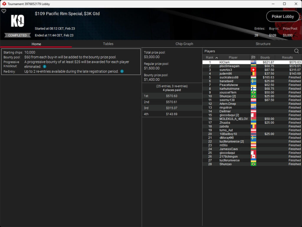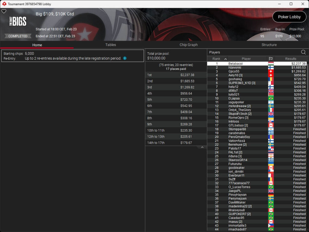 Solmir206 sicherte sich den Sieg im $75 Sunday Special auf PokerStars. Erfolgreichster DACH-Spieler war Sietze2801.