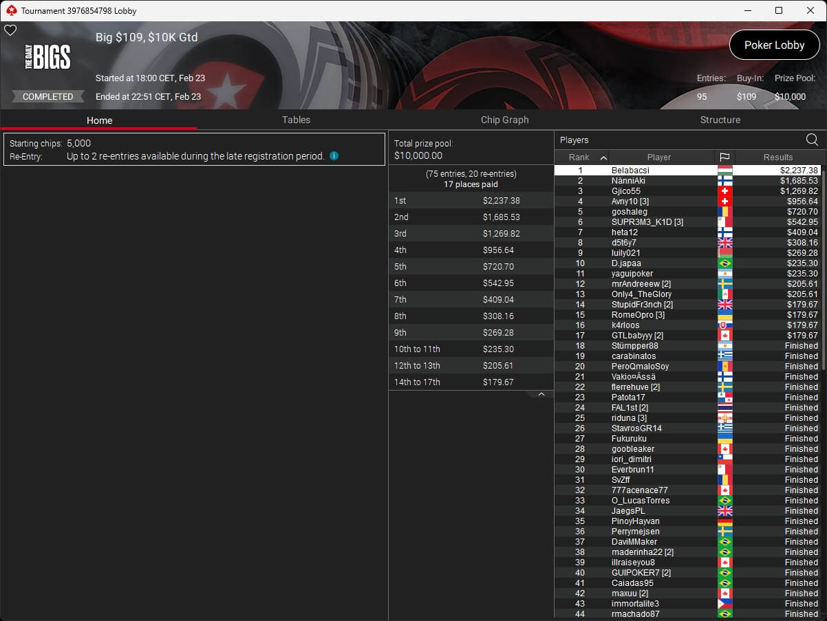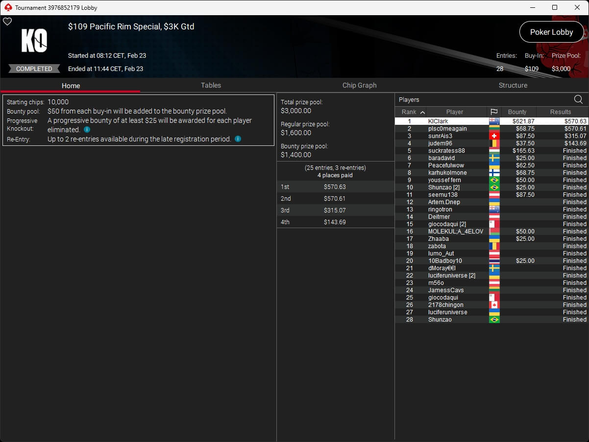 67 verbliebene Spieler kehrten zu Tag 2 im Sunday Special auf PokerStars zurück. DoePopoe aus Deutschland startete von Rang 2 aus in die Entscheidung. Für den Deutschen kam das Ende auf Rang 18 ($497,74 + $1.192,32). Erfolgreichster Spieler aus unseren Breitengraden war Sietze2801 ($1.374,19 + $936,91), den es an der Final Table Bubble erwischte.