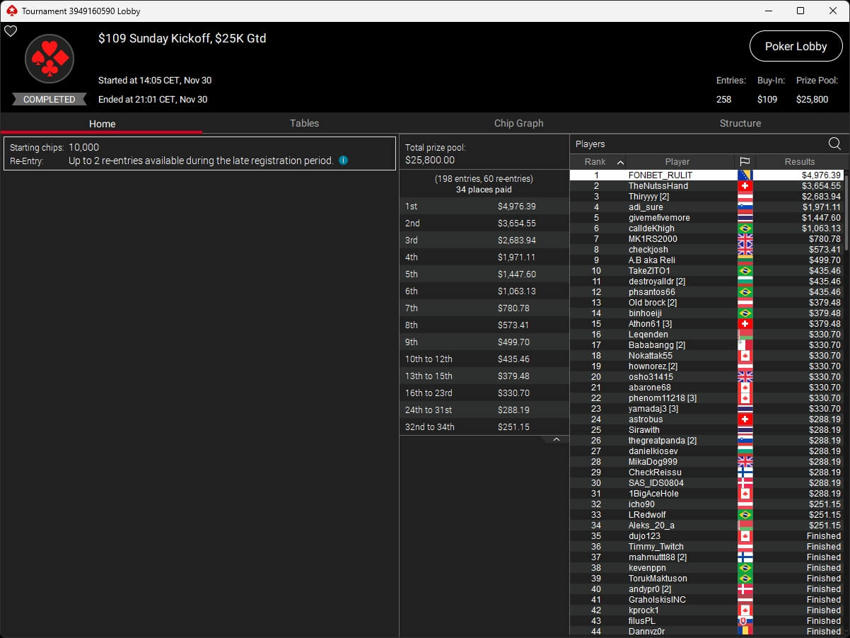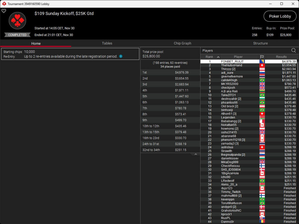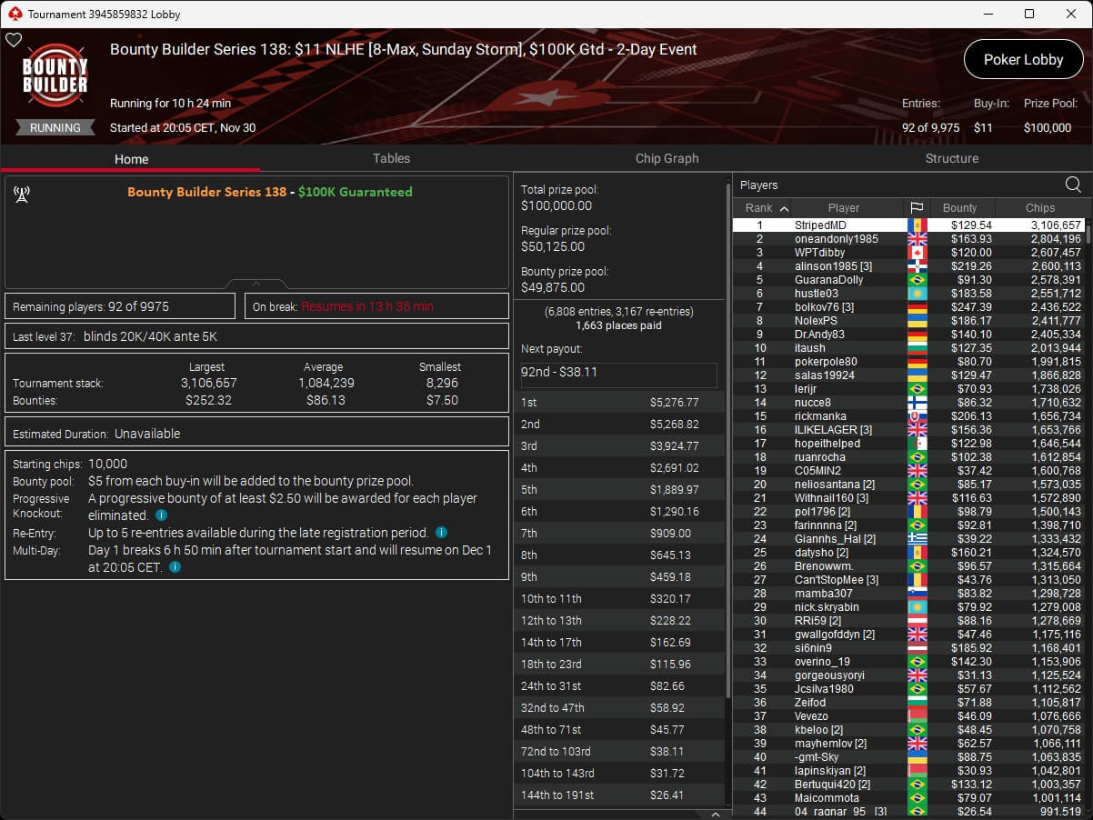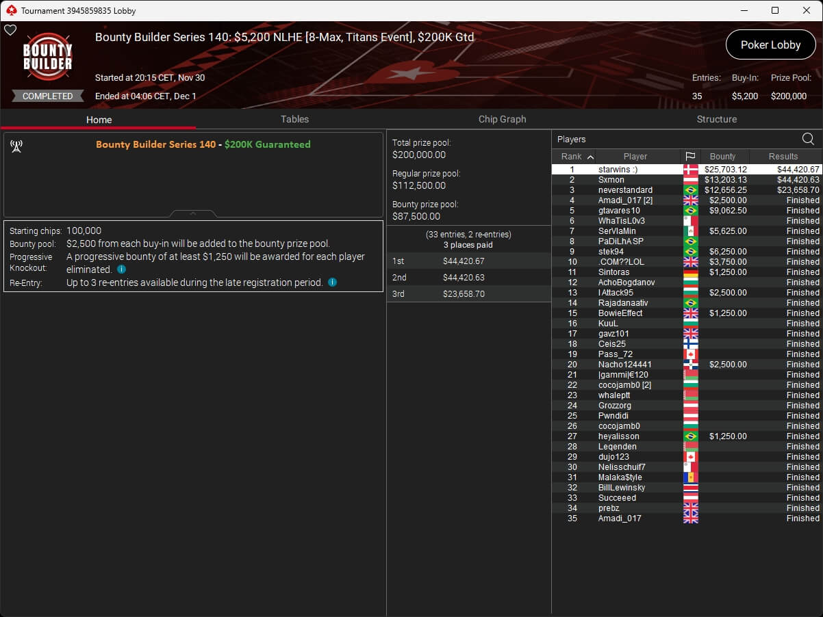 Im $5.200 Titans reichten 33 Starter und zwei Re-Entries nicht aus, um die $200.000 GTD zu überbieten. Daniel „starwins :)“ Sternald Petersen ($44.420,67 + $25.703,12) setzte sich am Ende gegen Sxmon (2./$44.420,63 + $13.203,13) aus Österreich sowie Iago „neverstandard“ Savino (3./$23.658,70 + $12.656,25) durch.