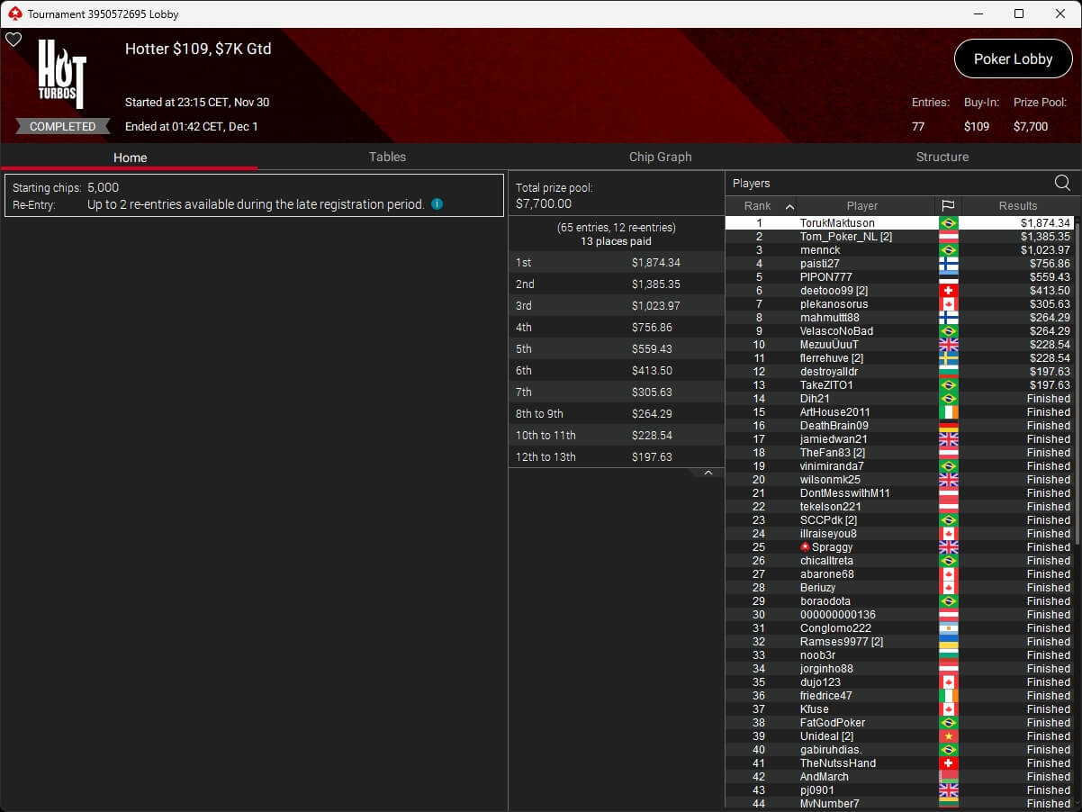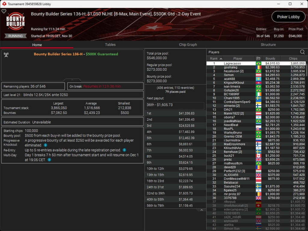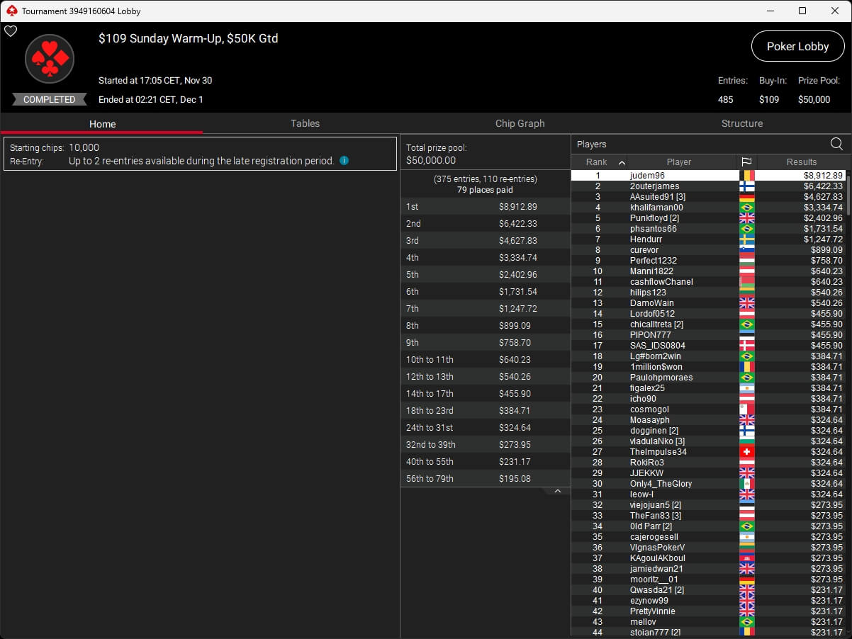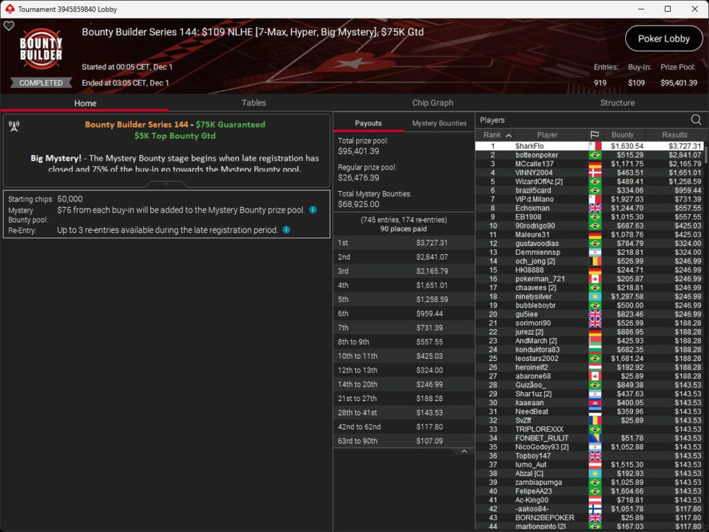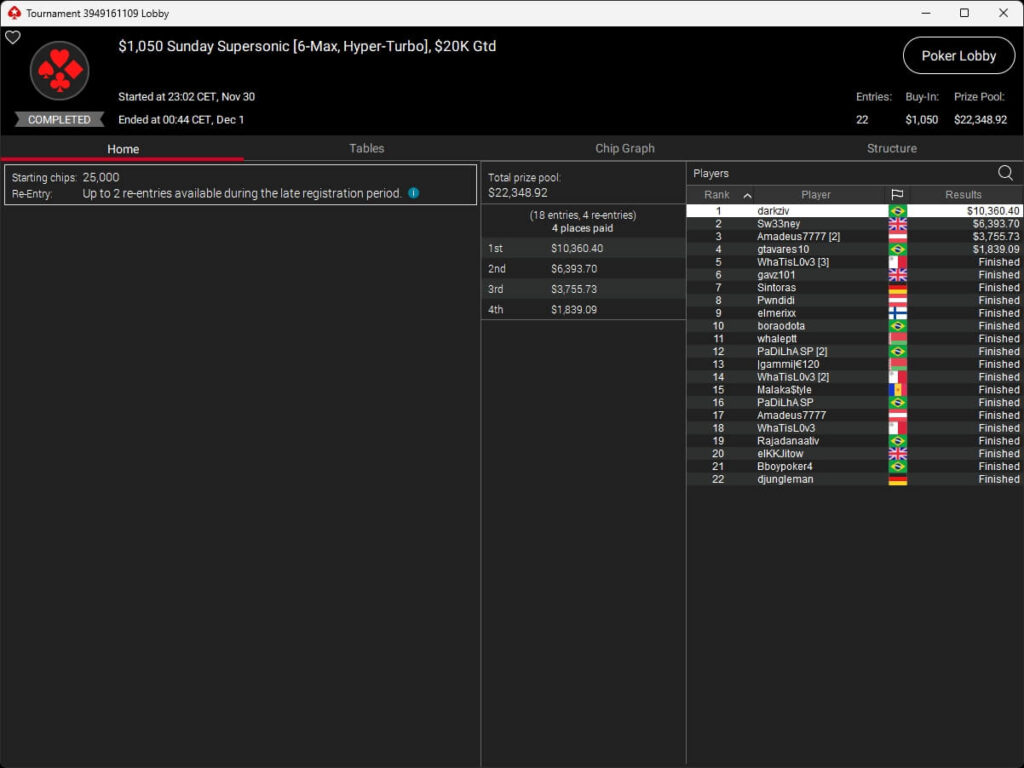 Im $5.200 Titans reichten 33 Starter und zwei Re-Entries nicht aus, um die $200.000 GTD zu überbieten. Daniel „starwins :)“ Sternald Petersen ($44.420,67 + $25.703,12) setzte sich am Ende gegen Sxmon (2./$44.420,63 + $13.203,13) aus Österreich sowie Iago „neverstandard“ Savino (3./$23.658,70 + $12.656,25) durch.