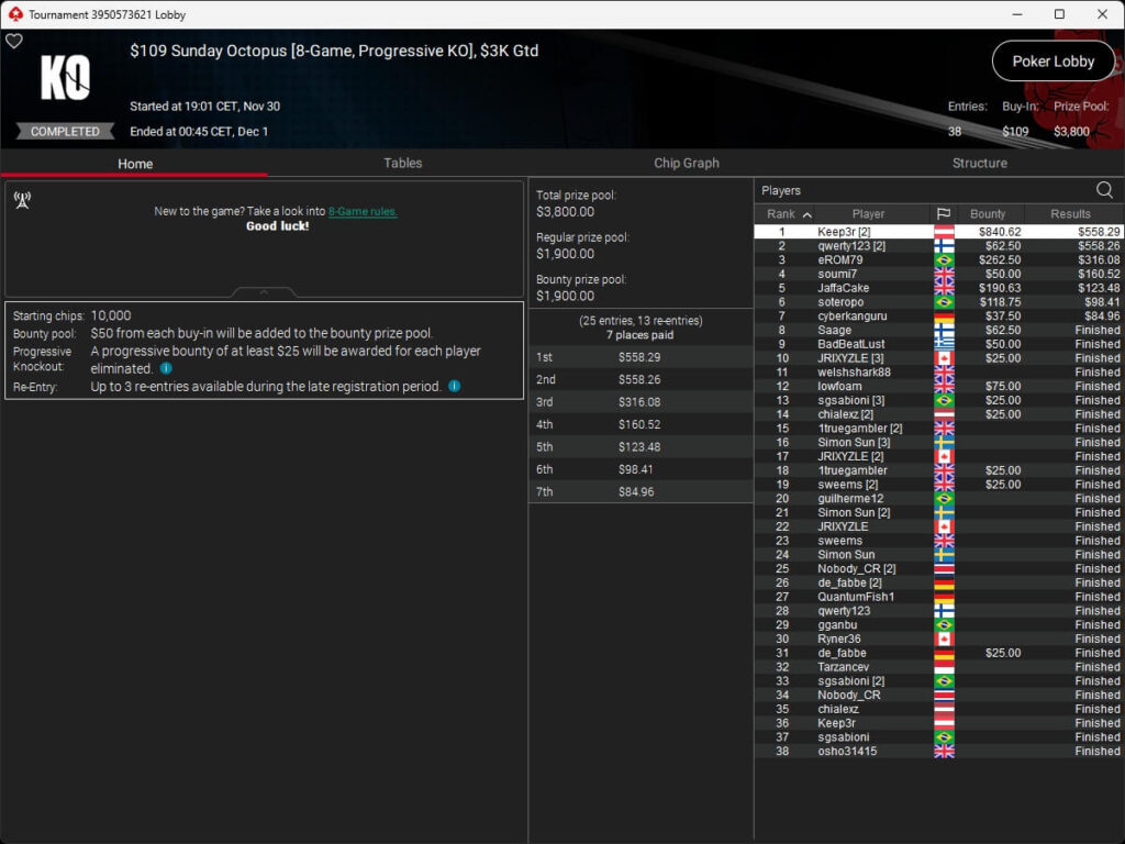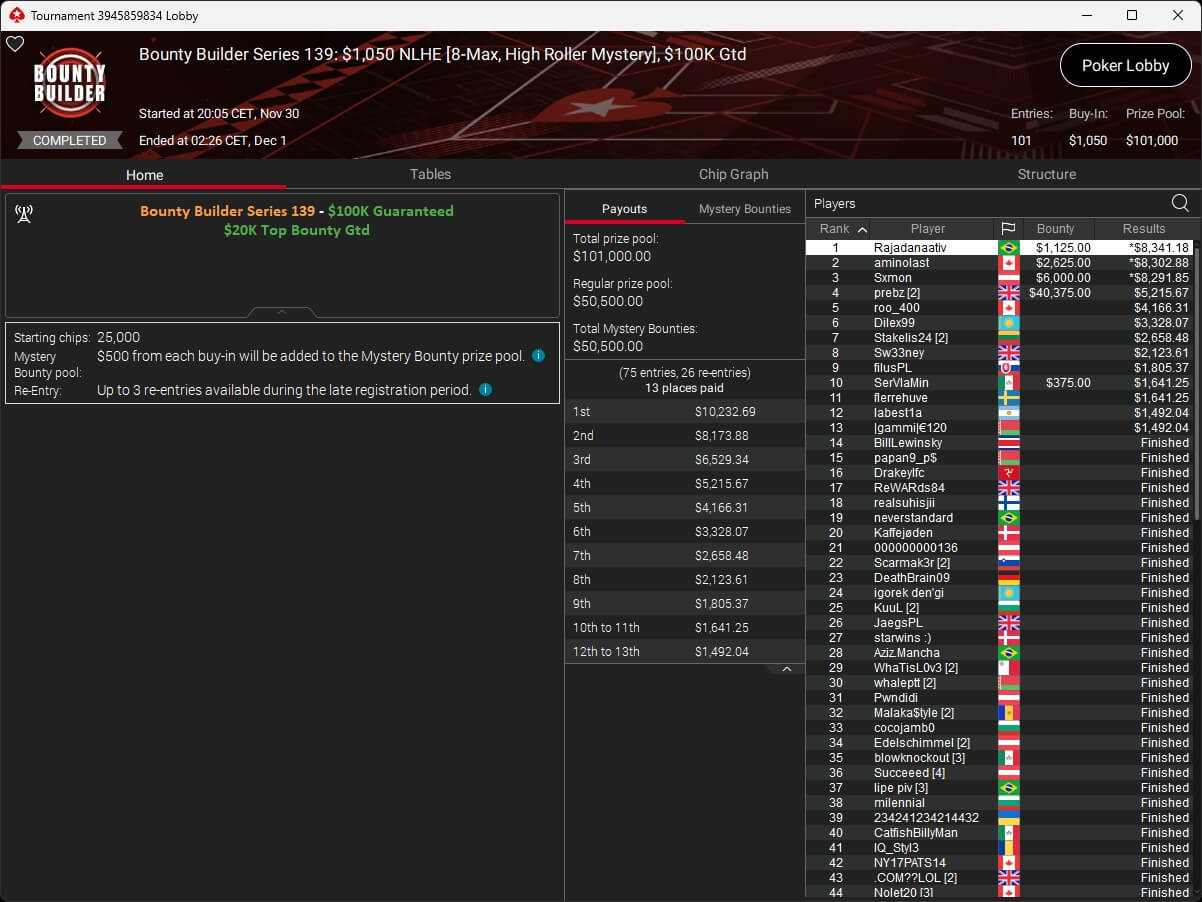 Zum Abschluss der Bounty Builder Series auf PokerStars spielte die deutschsprachige Poker-Community einen weiteren Sieg ein. Akkarlos setzte sich im $55 Mini Bounty Builder HR durch und ging mit $15.550,97 vom Tisch. Bei den Side Events waren Keep3r ($558,29 + $840,62; $109 Sunday Octopus) und pudelpower ($2.096,76; $109 Hotter Hyper) erfolgreich.
