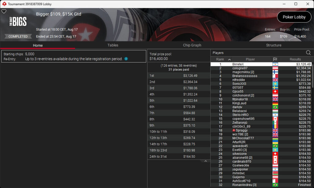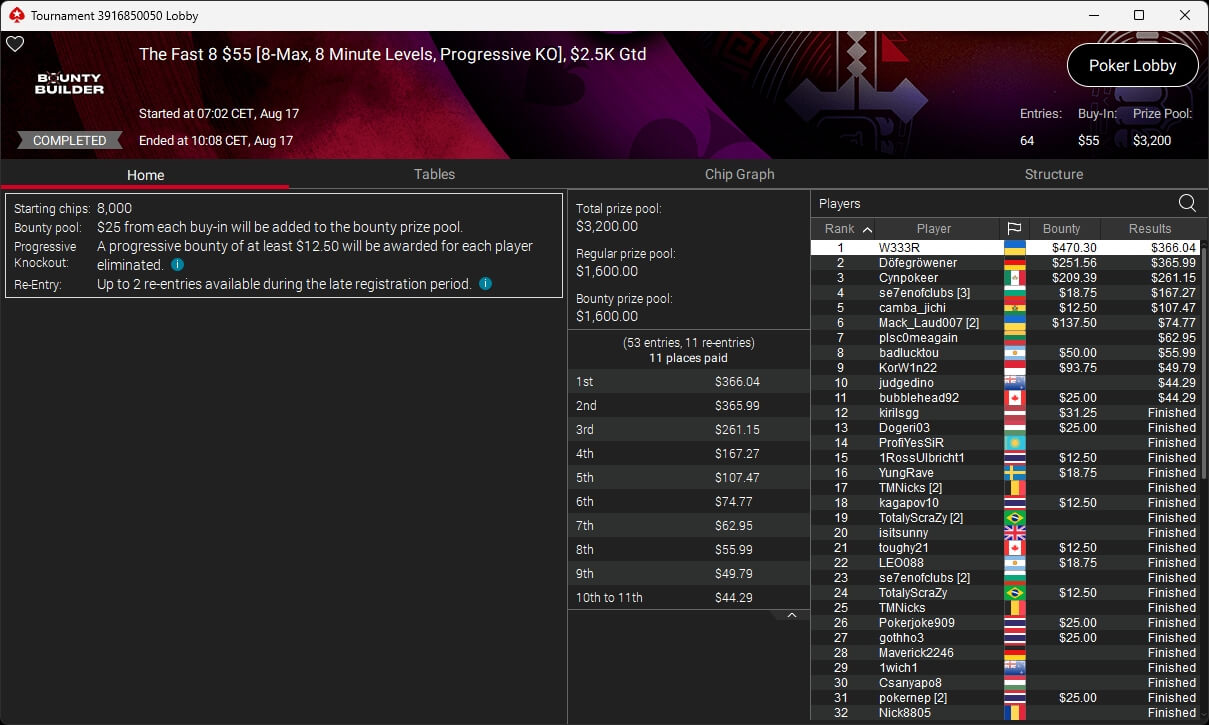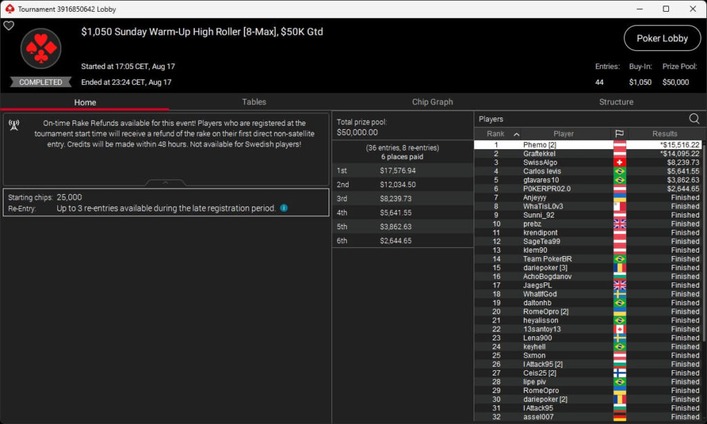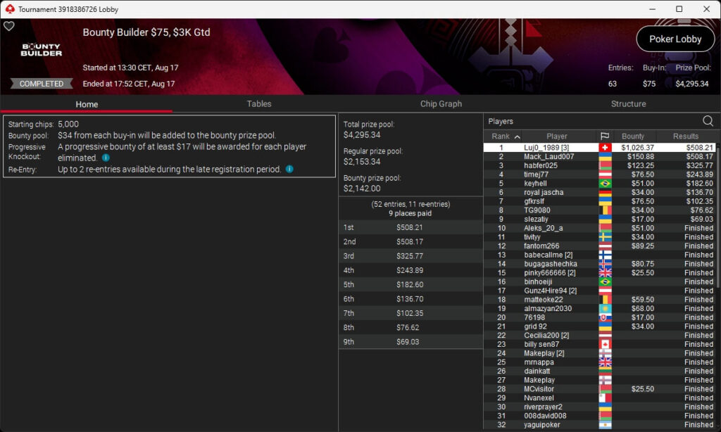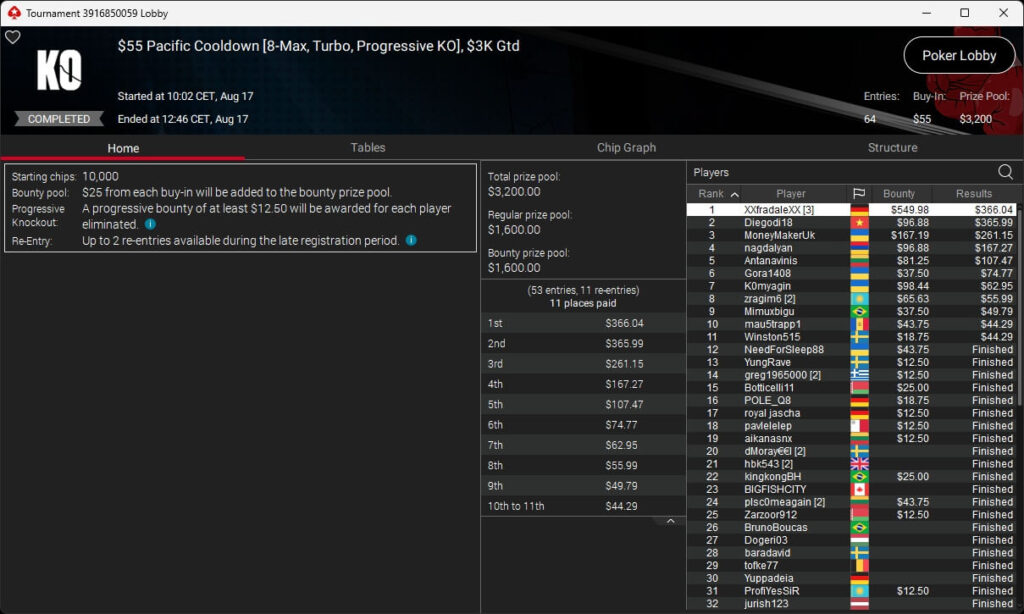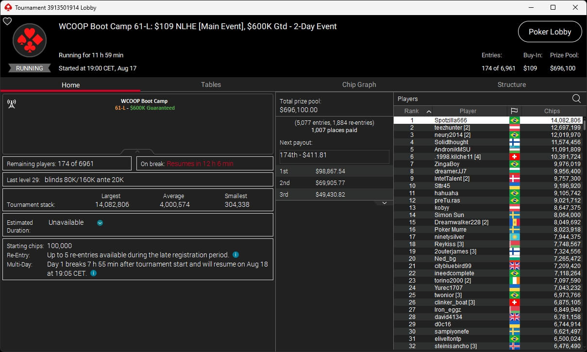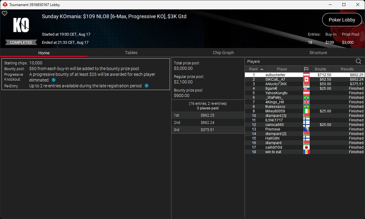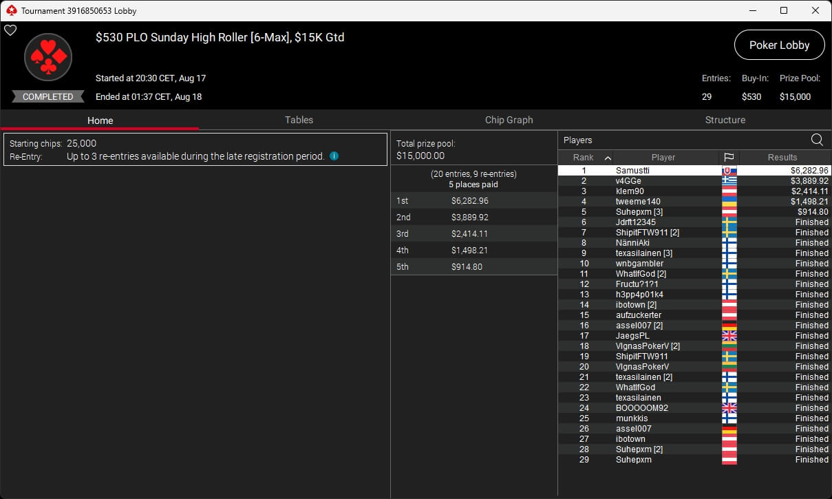 Igor „Garrin4e“ Yaroshevskyy (3./$36.282,50) sicherte sich Bronze, weitere Turniersiege gingen an Gil27Ds ($8.983,87; $109 Sunday Warm-Up), XXfradaleXX ($366,04 + $549,98; $55 Pacific Cooldown), Solarr ($669,07 + $581,25; $109 Bounty Builder), Luj0_1989 ($508,21 + $1.026,37; $75 Bounty Builder), aufzuckerter ($862,25 + $712,50; $109 NLO8), LagoAgrio ($661,13 + $1.056,25; $109 PLO PKO) sowie DeathBrain09 ($3.139,13; $215 NLO8).