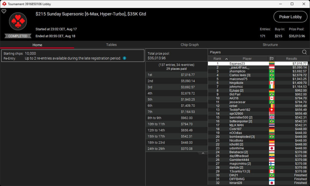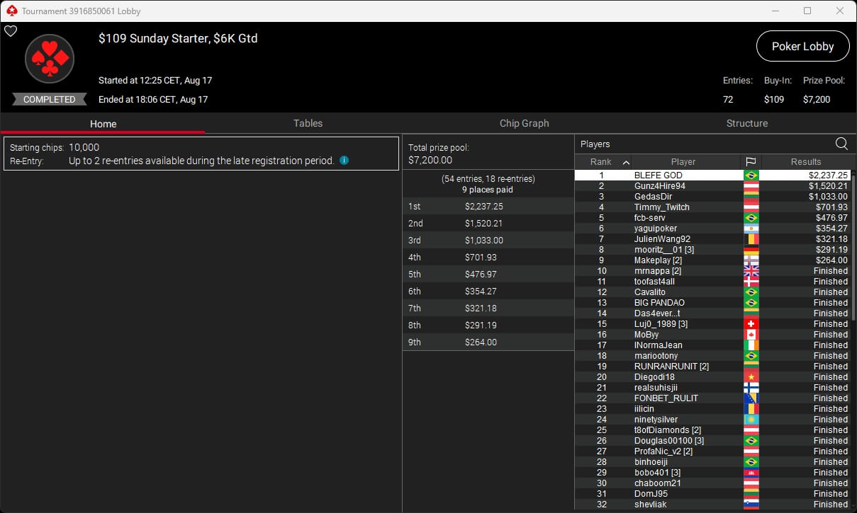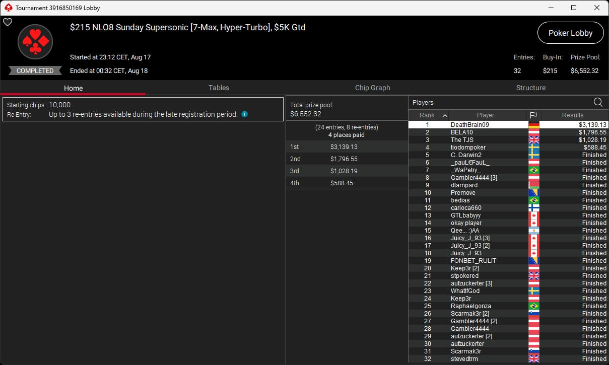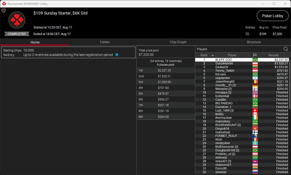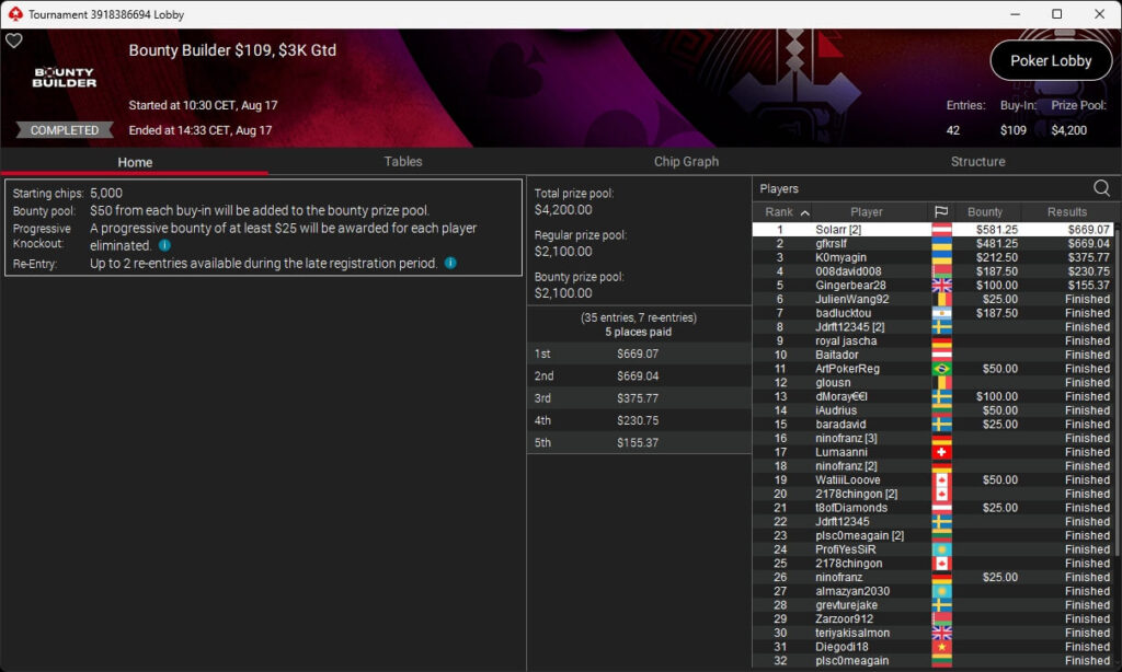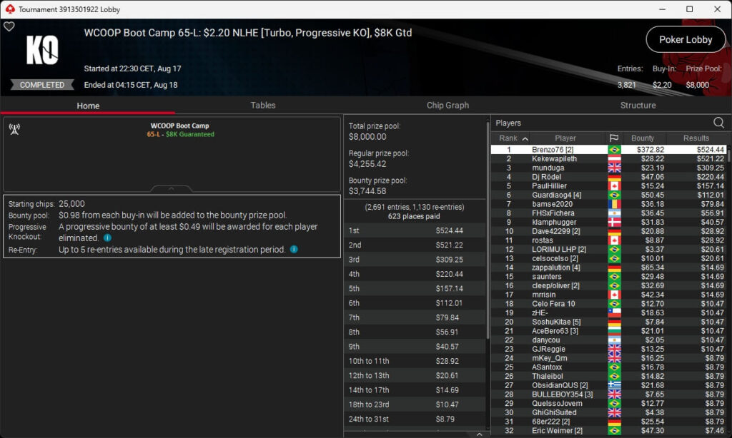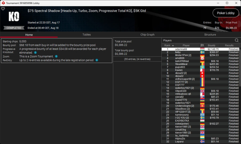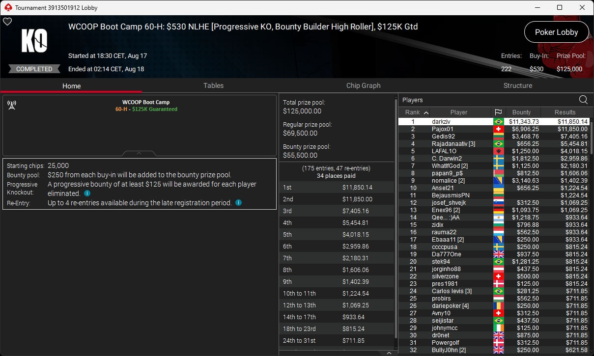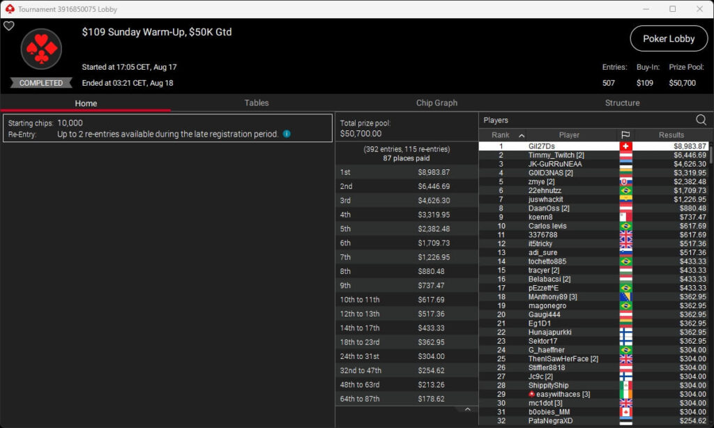 Igor „Garrin4e“ Yaroshevskyy (3./$36.282,50) sicherte sich Bronze, weitere Turniersiege gingen an Gil27Ds ($8.983,87; $109 Sunday Warm-Up), XXfradaleXX ($366,04 + $549,98; $55 Pacific Cooldown), Solarr ($669,07 + $581,25; $109 Bounty Builder), Luj0_1989 ($508,21 + $1.026,37; $75 Bounty Builder), aufzuckerter ($862,25 + $712,50; $109 NLO8), LagoAgrio ($661,13 + $1.056,25; $109 PLO PKO) sowie DeathBrain09 ($3.139,13; $215 NLO8).