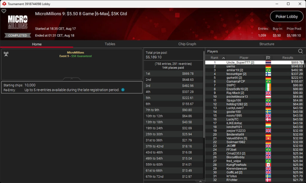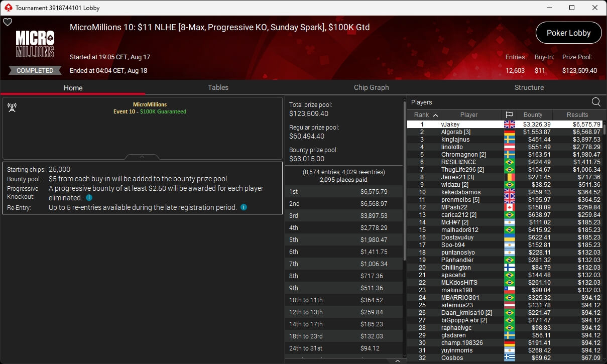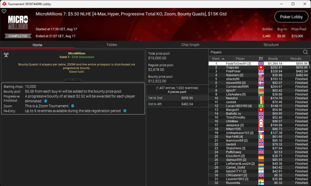 Beim Sonntag auf PokerStars war volles Programm angesagt. Neben dem Finale des WCOOP Boot Camps gab es den Start der MicroMillions. Die deutschsprachige Poker-Community ging jedoch leer aus. Denkbar knapp war es für Pajox01 (2./$11.850 + $6.906,25; $530 Bounty Builder HR) sowie Algorab (2./$6.568,97 + $1.553,87; $11 Sunday Spark).