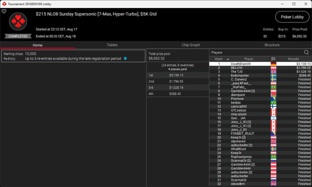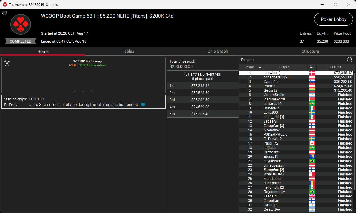 Zum $5k Titans traten 31 Spieler an. Dazu kamen sechs Re-Entries, sodass um die $200.000 GTD gespielt wurde. Im Heads-up setzte sich Daniel Sternald Petersen ($73.348,42) gegen chrisgoataui (2./$50.523,60) aus Österreich durch.