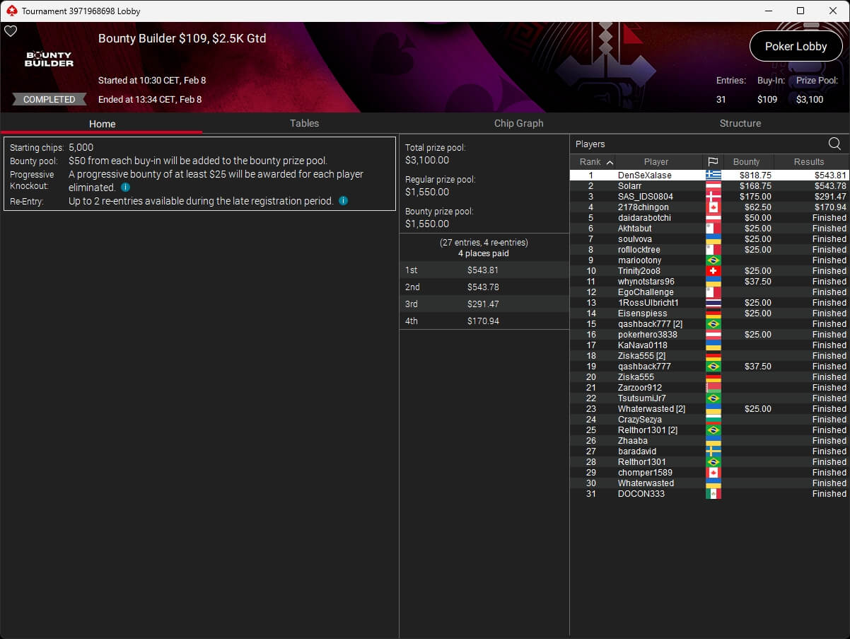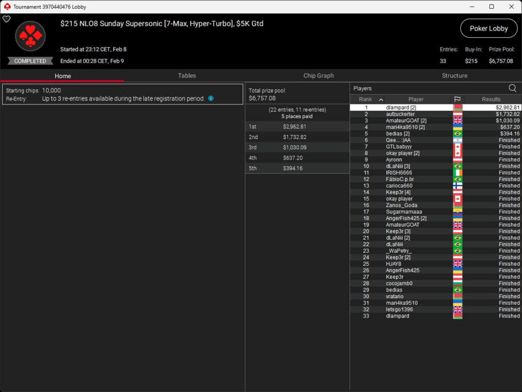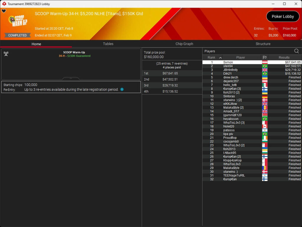 Auch im $5.200 Titans gab es einen Gewinner aus unseren Breitengraden. Dort trugen 25 Starter insgesamt $320.000 zusammen. Am Ende setzte sich Sxmon ($67.641,65) gegen Iago „stek94“ Botelho (2./$47.502,51), Jack „JBHInfinity“ Hardcastle (3./$29.719,32) sowie Diego „Dih21“ Costa (4./$15.136,52) durch.