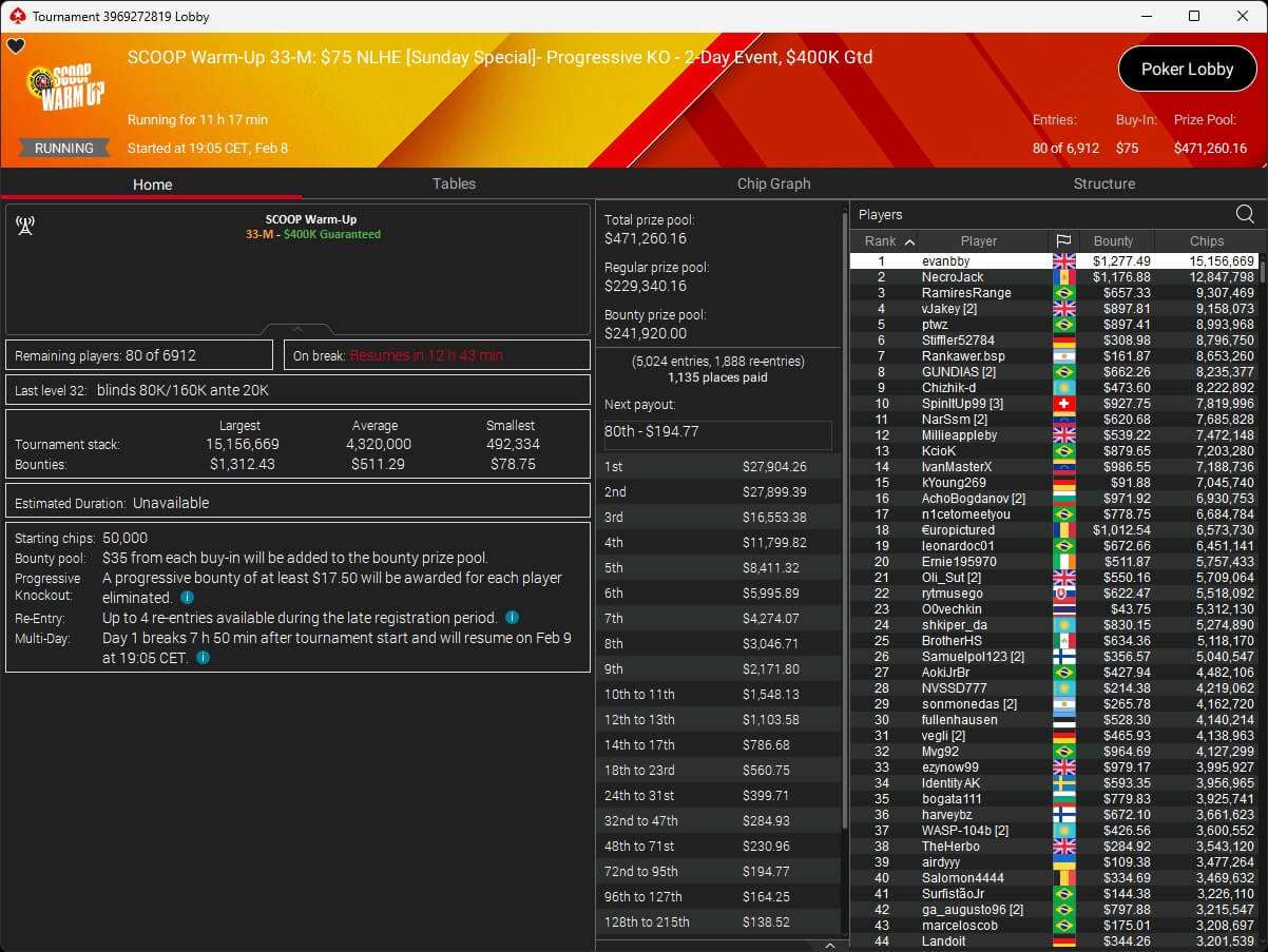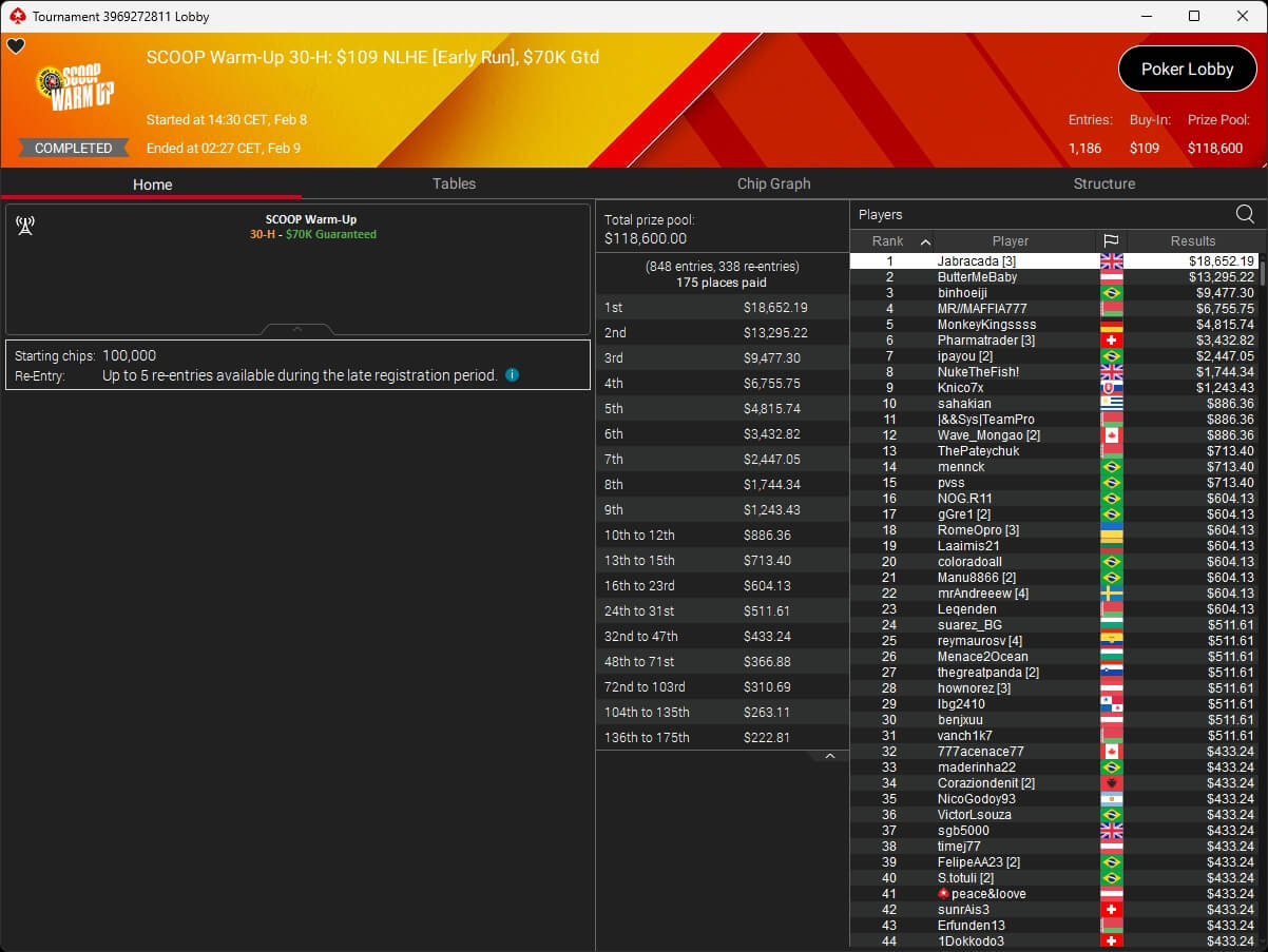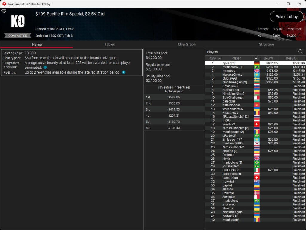 Im $109 Early Run musste sich ButterMeBaby (2./$13.295,22) nur Poker-Pro Tom „jabracada“ Hall ($18.652,19) geschlagen geben. Bei den Side Events schlugen noch speedyql ($588,06 + $681,25; $109 Pacific Rim Special) und CetinCoban ($1.704,47 + $2.062,50; $320 Bounty Builder HR Late Edition) zu.